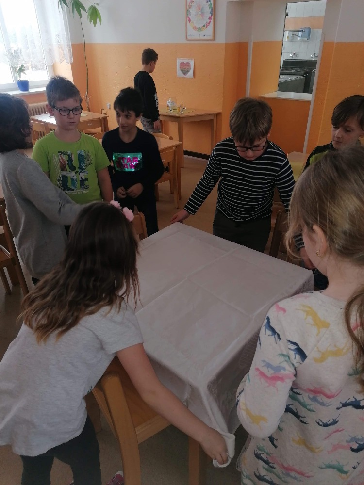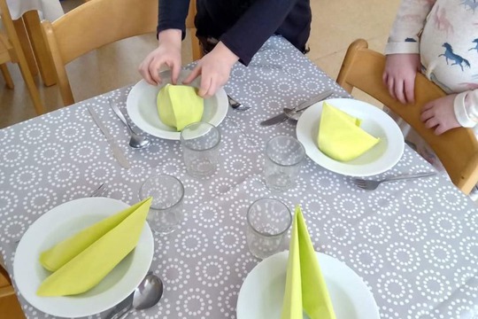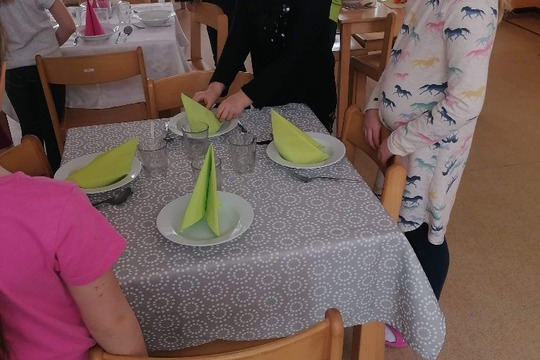 Po přestěhování jídelny přišlo na řadu stolování.S dětmi jsme se v rámci pracovních činností pustili do prostírání. Naučili jsme se jak správně přichystat příbory a několik technik, jak poskládat ubrousky. Barvy celkově stůl rozveselily,což opět přispělo k dobré pohodě při jídle.