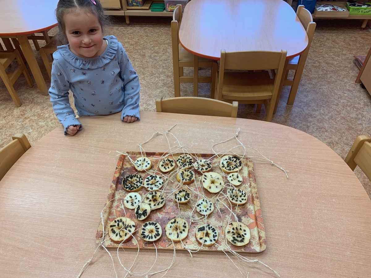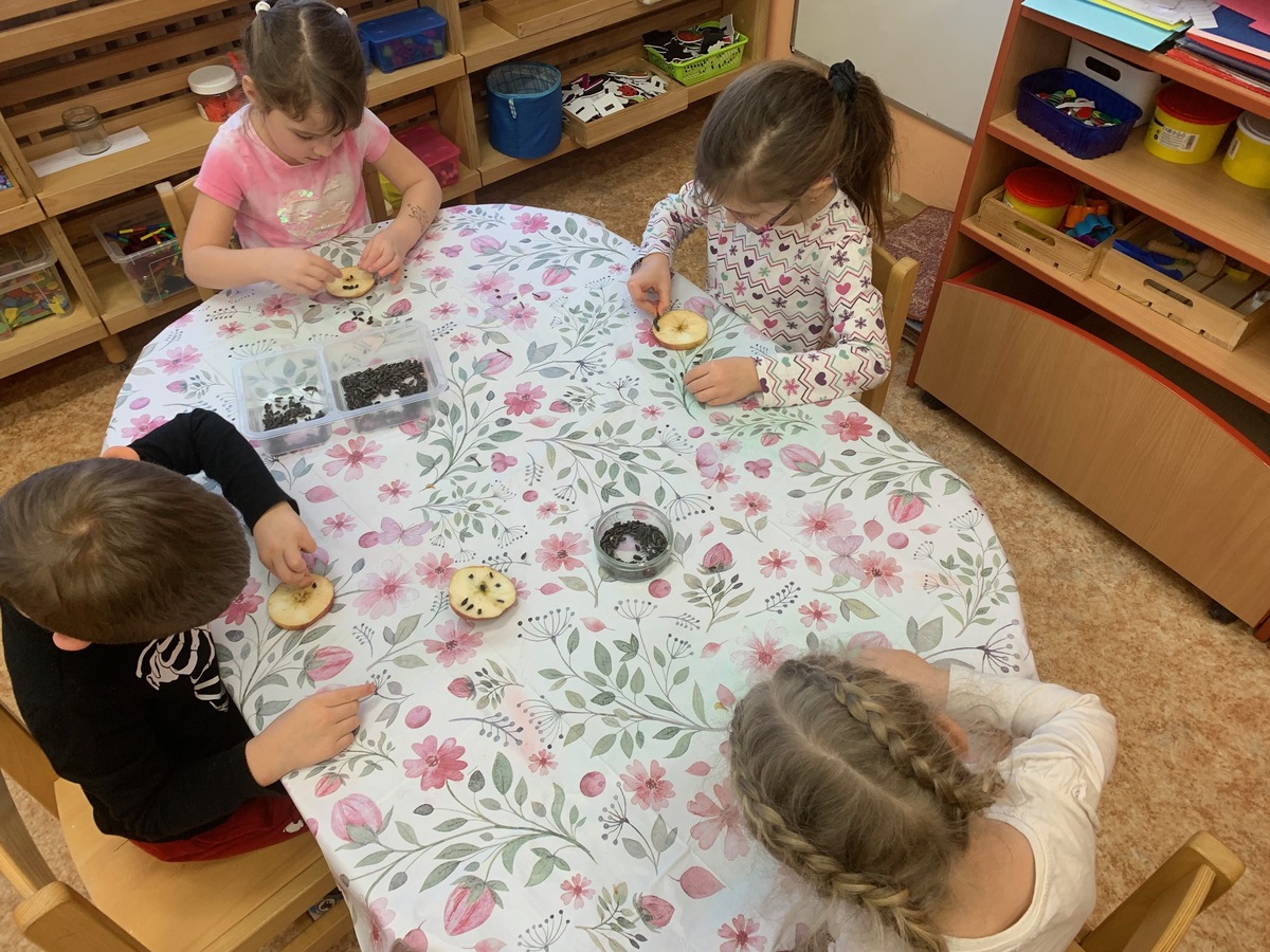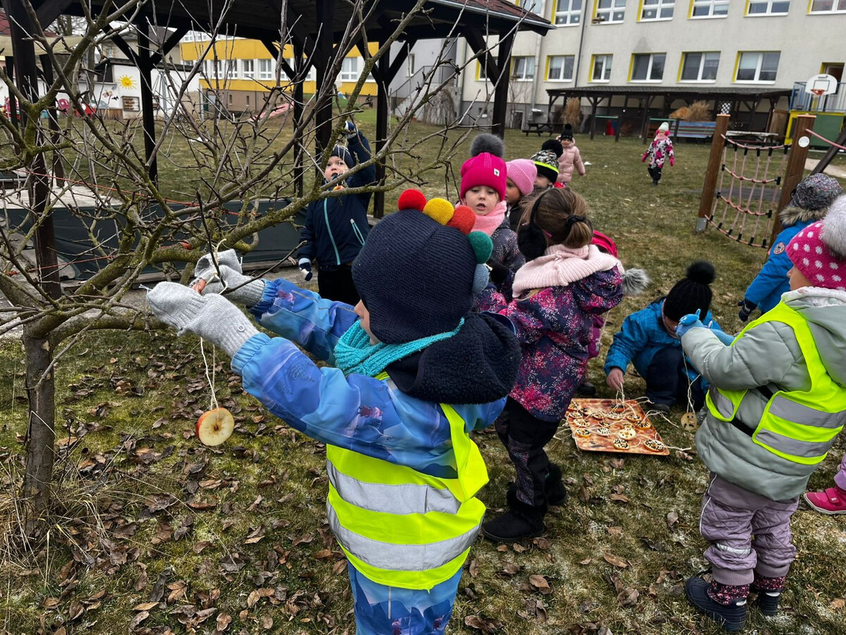Krajina zapadá sněhem a ptáčci budou mít zase o něco těžší najít potravu. S dětmi jsme se rozhodli vyrobit jim krmítka z jablíček a slunečnicových semínek. Pověsili jsme je na jabloňku na školní zahradě a pravidelně se chodíme dívat, zda tam ptáčci stále mají dostatek krmení.