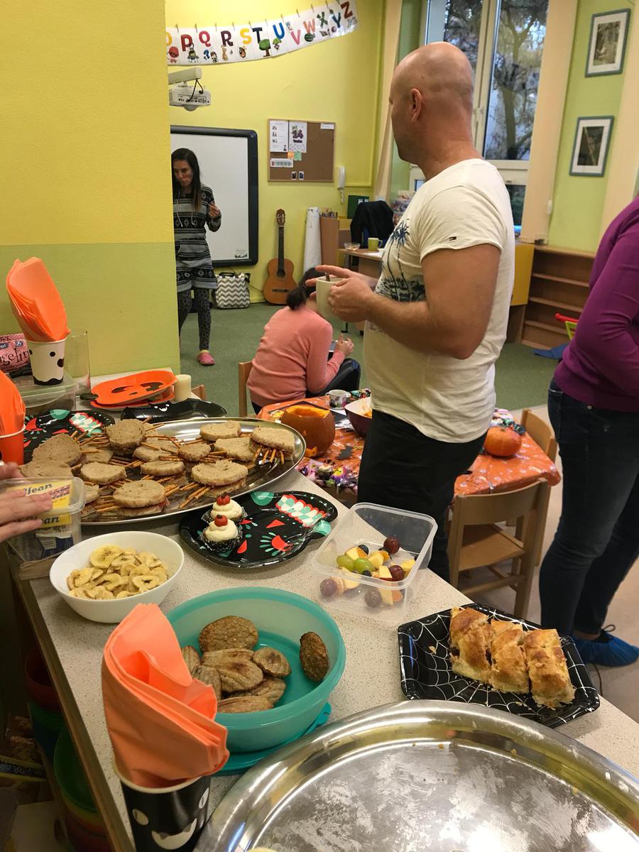 To get into the festive mood, we invited the parents of our children for a workshop with pumpkins. We gave them inspiration and had them bring their own pumpkins to school. We carved bats, cats, and all different kinds of scary Jack o'lantern faces. The parents were also encouraged to bring a healthy snack to share with the rest; we call this 'potluck'. Everyone had a great time and in the end, we were able to decorate our school for Halloween. Thank you parents!