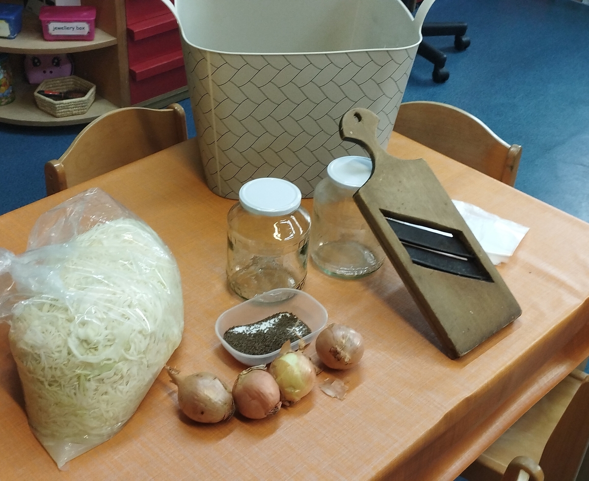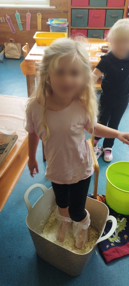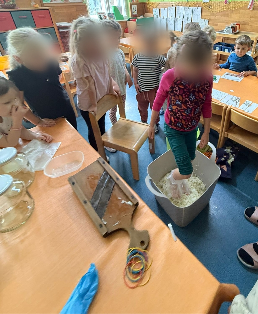 Nakrouhané zelí, které paní učitelka přivezla z Farmy Pech, jsme smíchali se solí a kmínem. Cibuli jsme nastrouhali na kruhadle na zelí a vše poctivě promíchali ve velké nádobě - to abychom se do ní hezky vešli a aby se nám dobře šlapalo. Potom jsme si umyli nožky a aby byla zachována hygiena na 100%, na nohy jsme si dali igelitové pytlíky ... a šlapali jsme a šlapali.