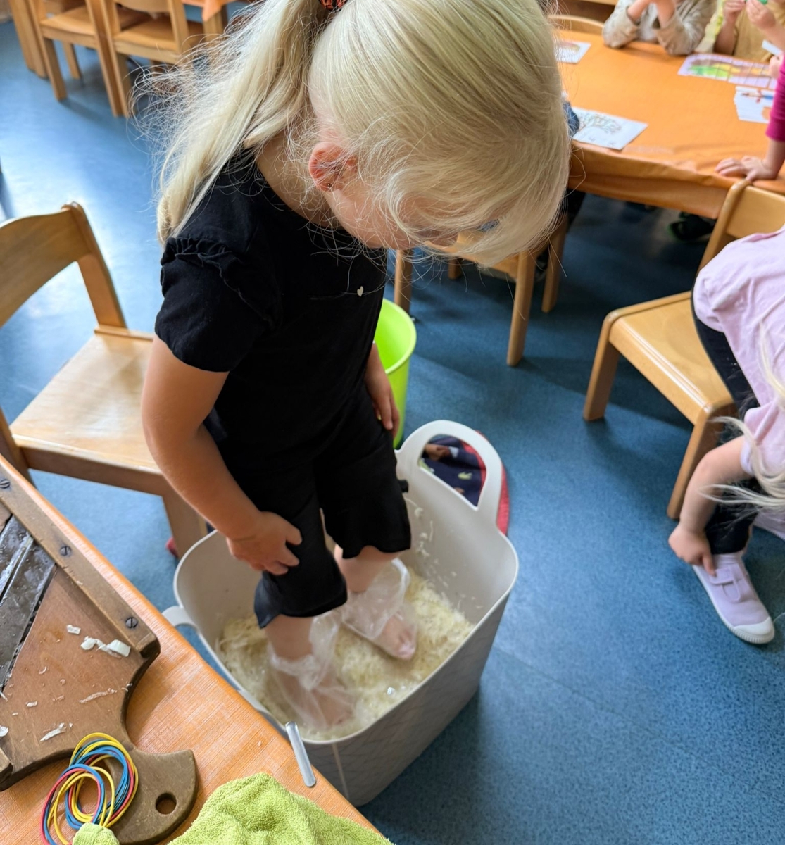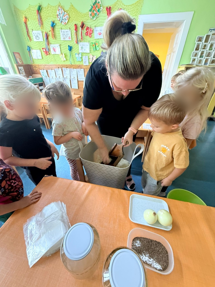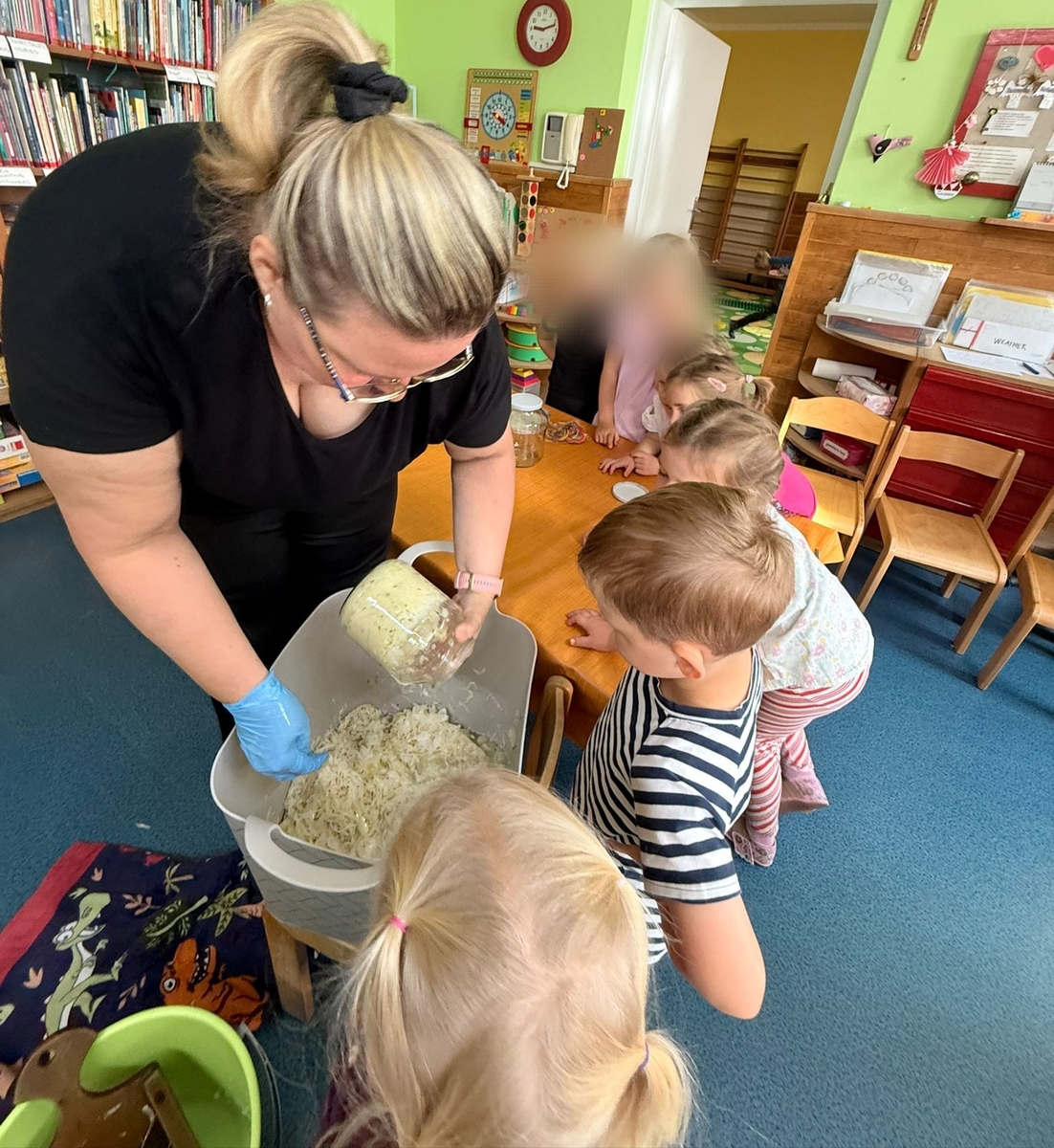 Nakrouhané zelí, které paní učitelka přivezla z Farmy Pech, jsme smíchali se solí a kmínem. Cibuli jsme nastrouhali na kruhadle na zelí a vše poctivě promíchali ve velké nádobě - to abychom se do ní hezky vešli a aby se nám dobře šlapalo. Potom jsme si umyli nožky a aby byla zachována hygiena na 100%, na nohy jsme si dali igelitové pytlíky ... a šlapali jsme a šlapali.