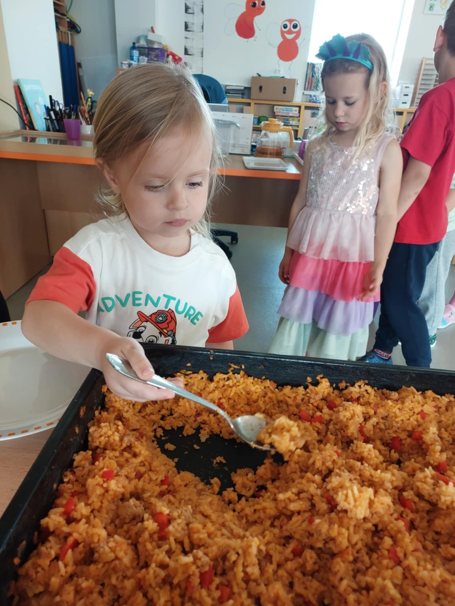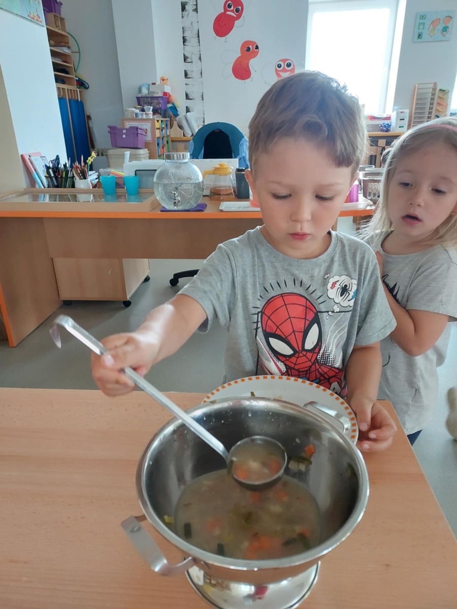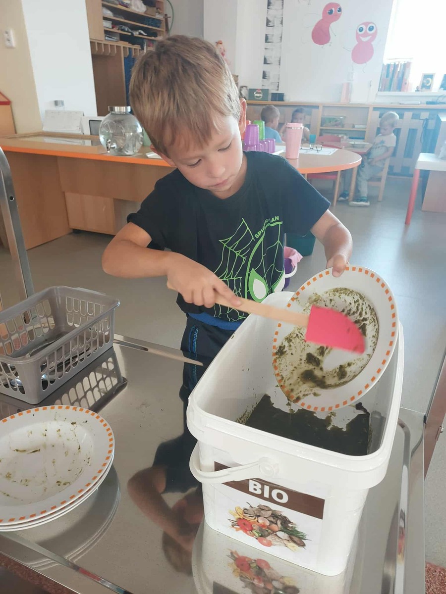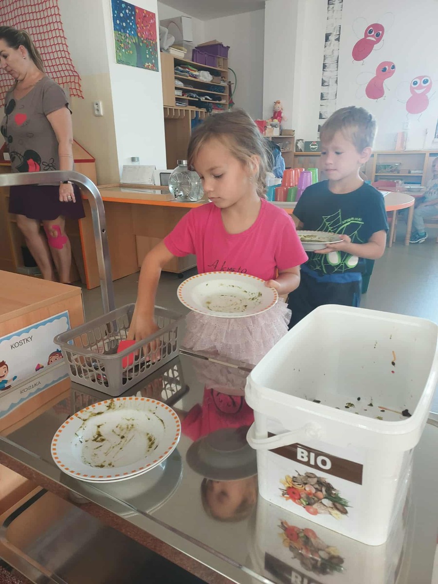 V naší mateřské škole podporujeme děti v samostatnosti také při stolování. Každé dítě si samo nalévá polévku, někdy nandává hlavní jídlo, nalévá pítí a přidává salát podle své chuti a potřeby. Po skončení jídla děti smetají zbytky z talířů do připraveného kýble na bioodpad.