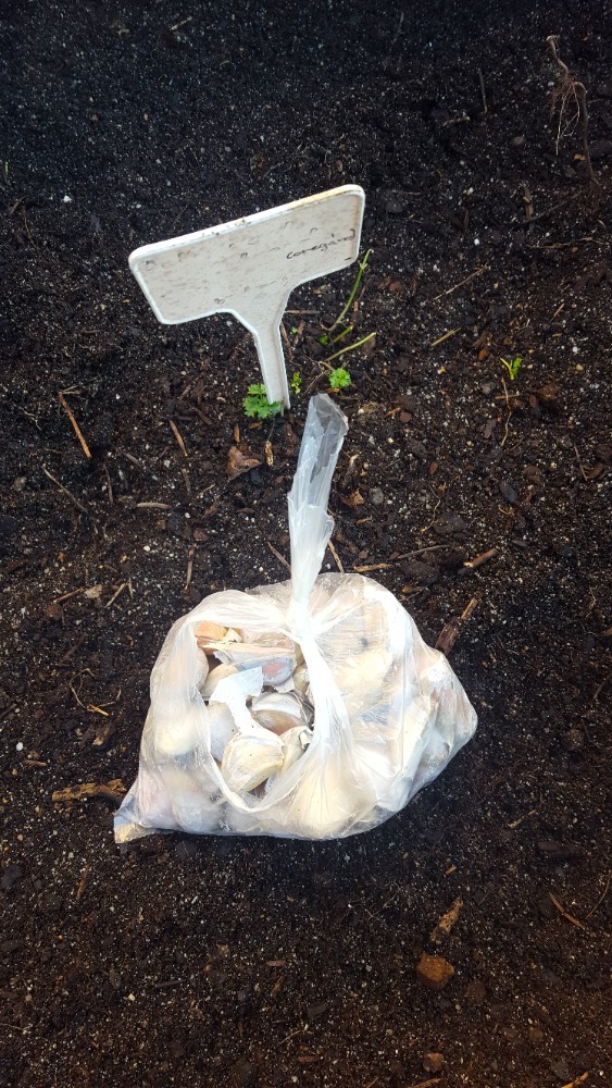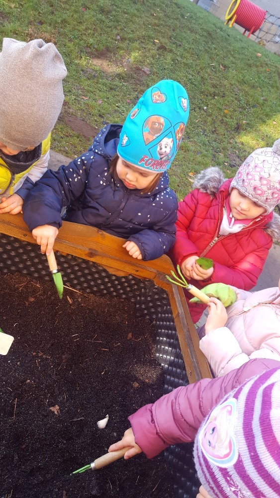 Děti ze třídy Broučci (4-5let)zasadily česnek. Předtím si děti s paní učitelkou stroužky česneku prohlédly, osahaly a očichaly a hádaly, jaká to je zelenina. Neuhodl nikdo, ale všichni věděli, že to jí maminka.... Venku na vyvýšeném záhonu děti pohrabaly hlínu, zasadily stroužky česneku a hlínu zas urovnaly. Uvidíme, jestli na jaře něco sklidíme.