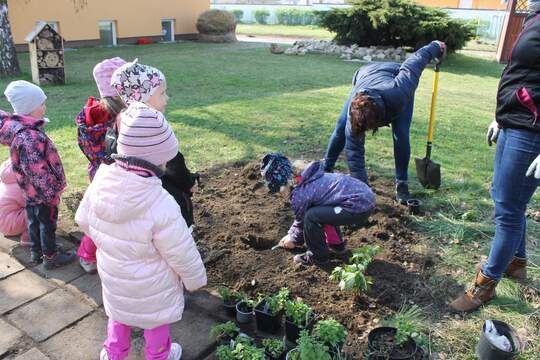 Děti dnes na školní zahradě zasadily bylinky, které nám donesli rodiče. Samy si vykopaly díru a bylinku zasadily. Byly opravdu moc pečlivé a opatrné, aby bylinky nepoškodily.
