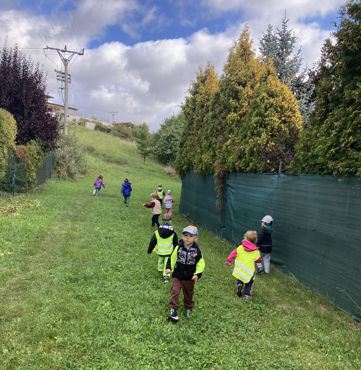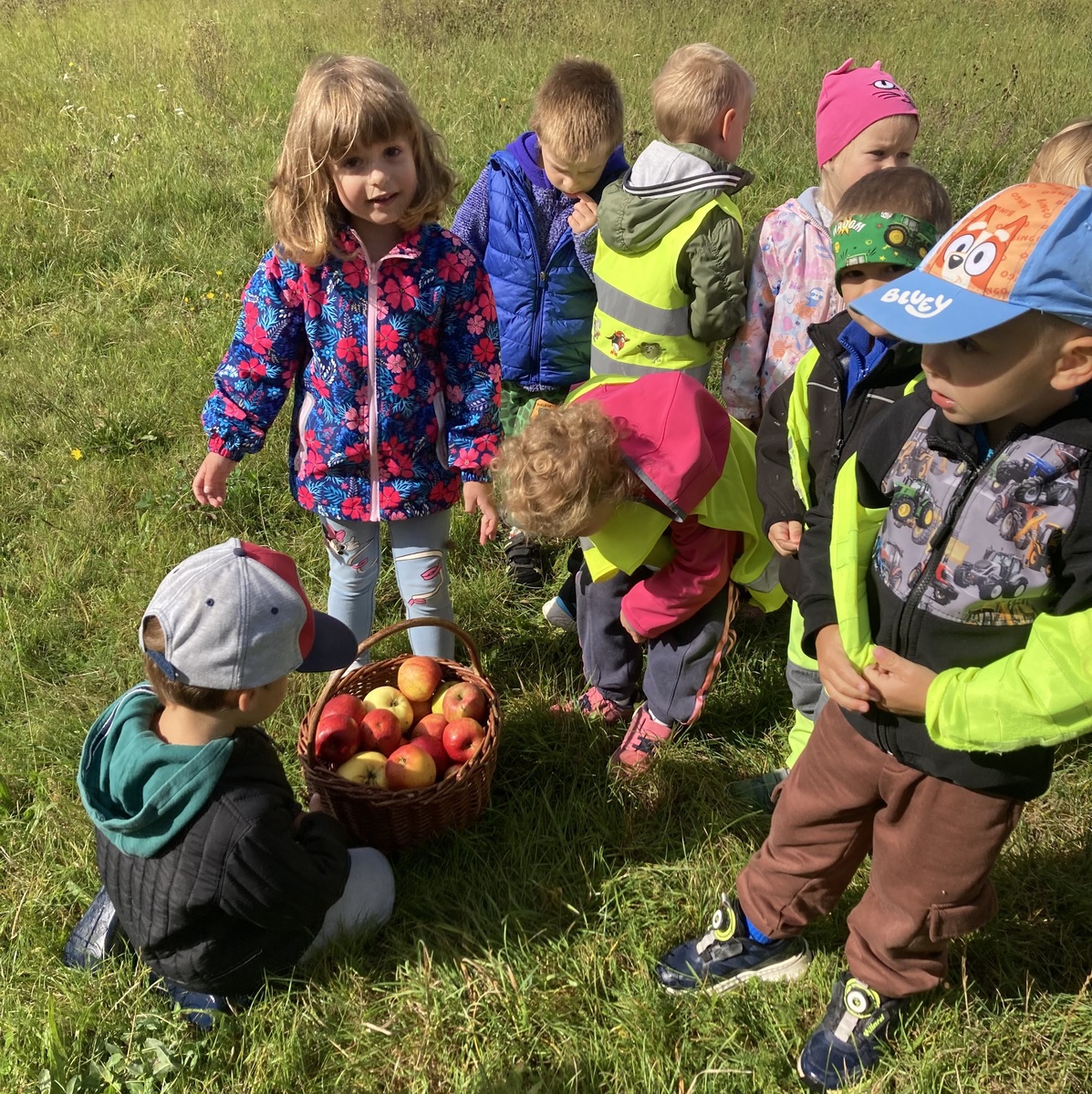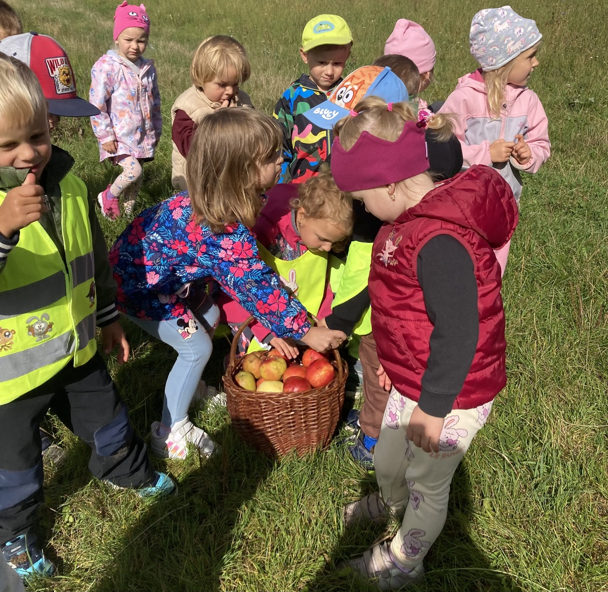 Jelikož jsme k dalším činnostem potřebovali různá jablíčka (tvar, velikost, barva, chuť…), vydali jsme se společně vycházkou, vybaveni košíkem, sbírat jablka. Všichni se zapojili, za chvilku jsme měli plný košík.