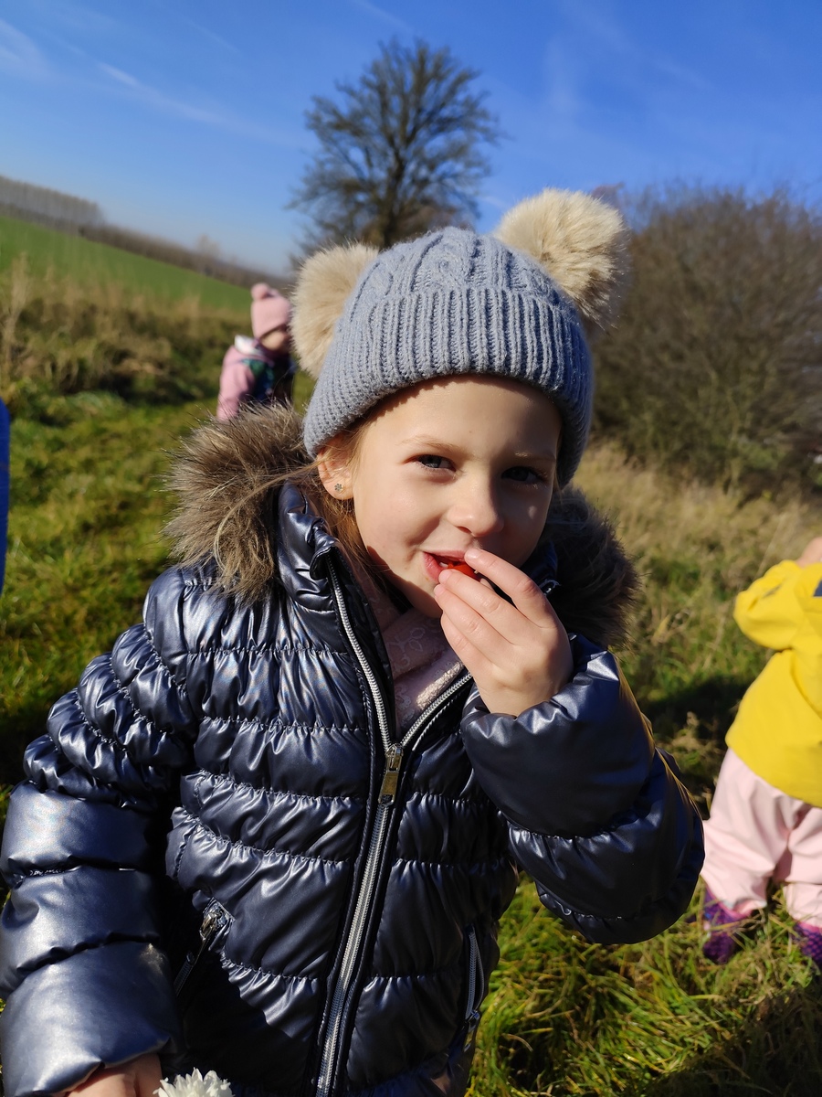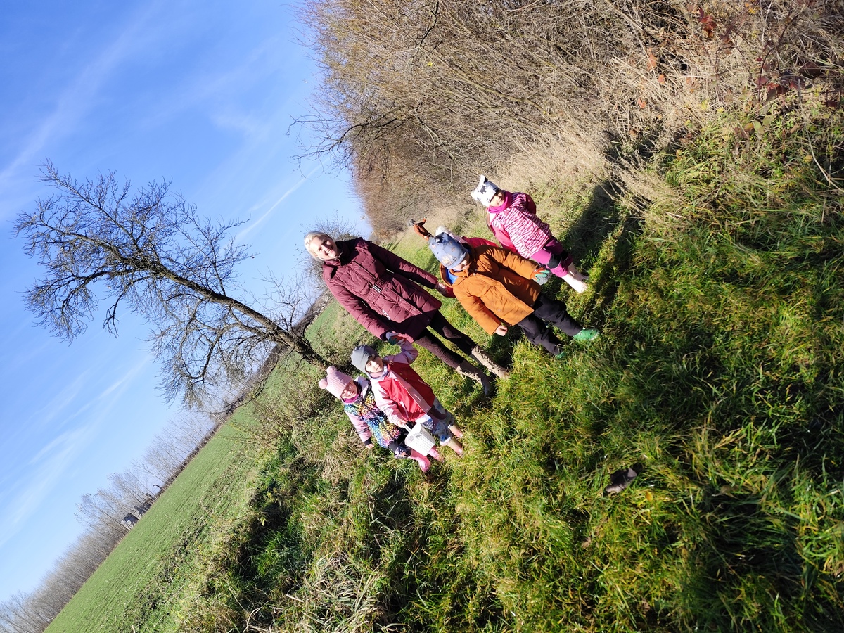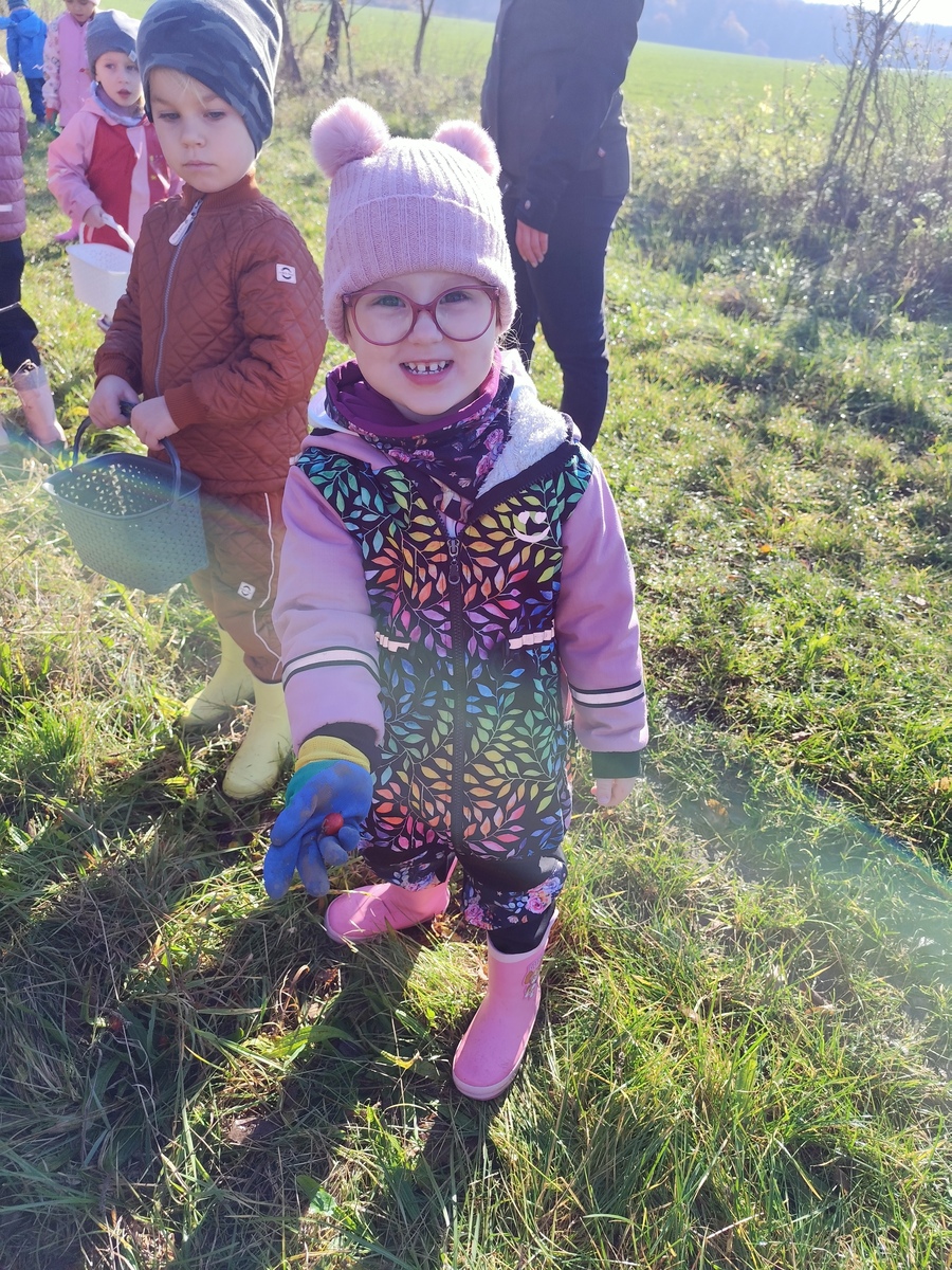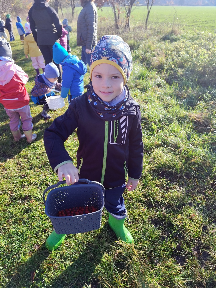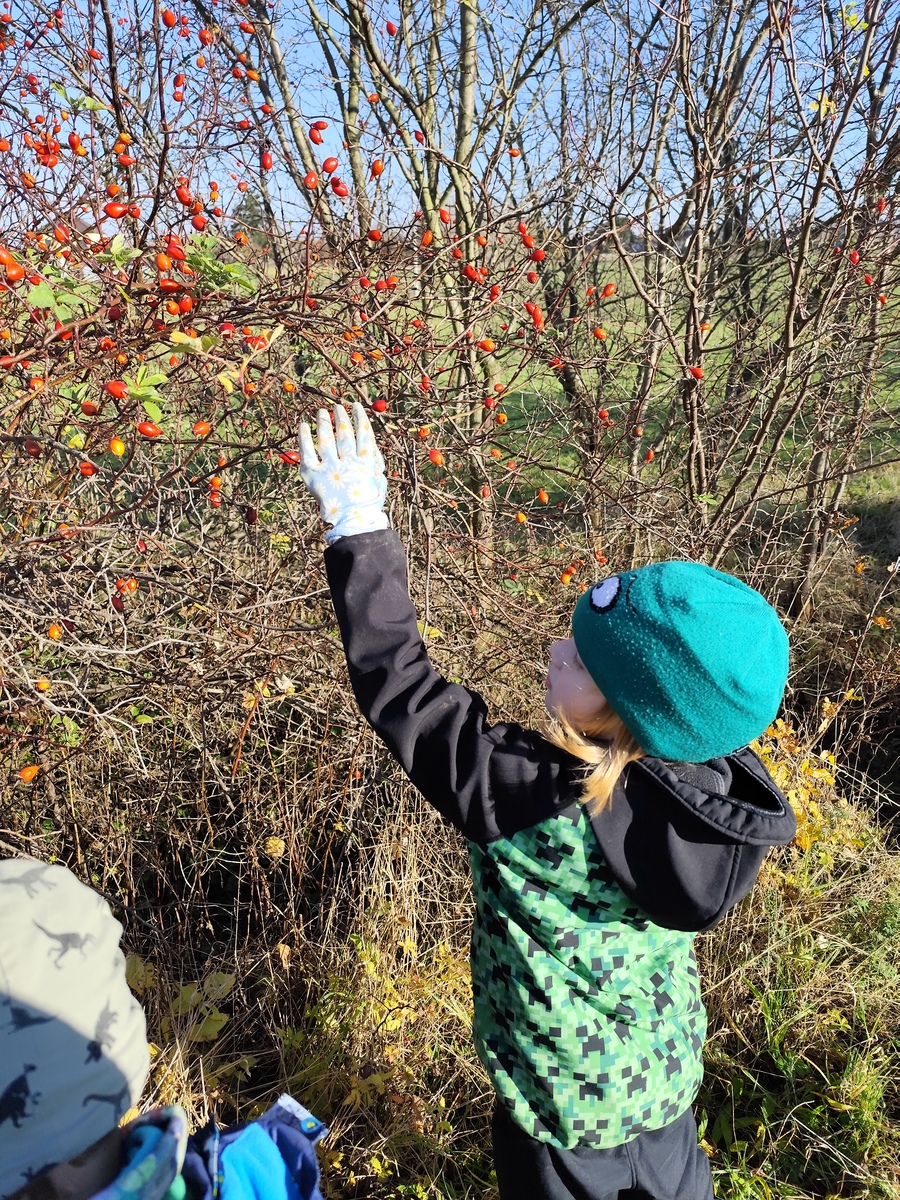 Podzim přinesl krásné dny plné barev, a tak jsme se s dětmi vydali do přírody nasbírat červené šípky. S košíkem v ruce objevovali keříky kolem školky na okraji lesa. Pečlivě jsme vybírali jen ty nejhezčí, zralé plody a s radostí je nosili do košíku.