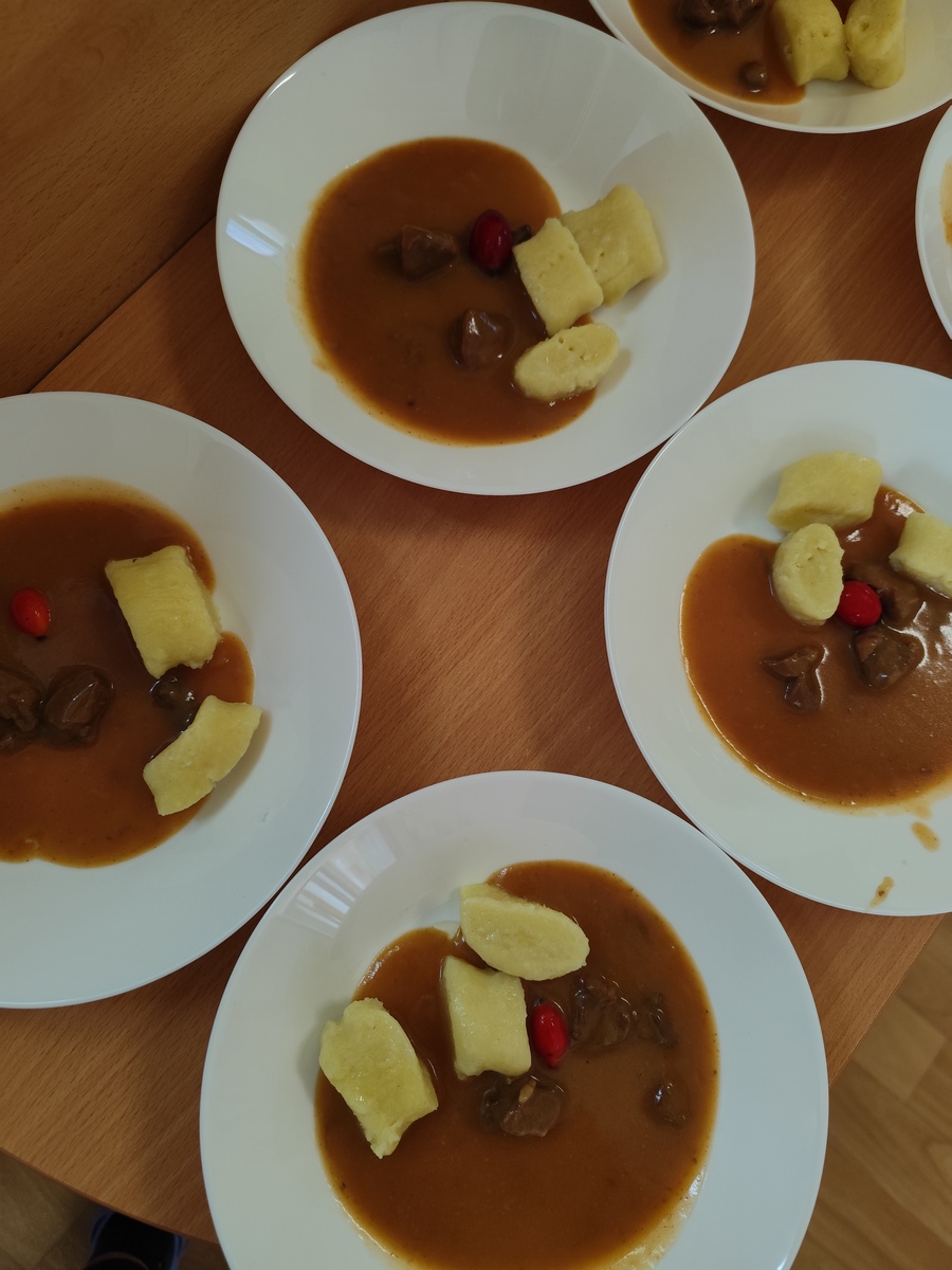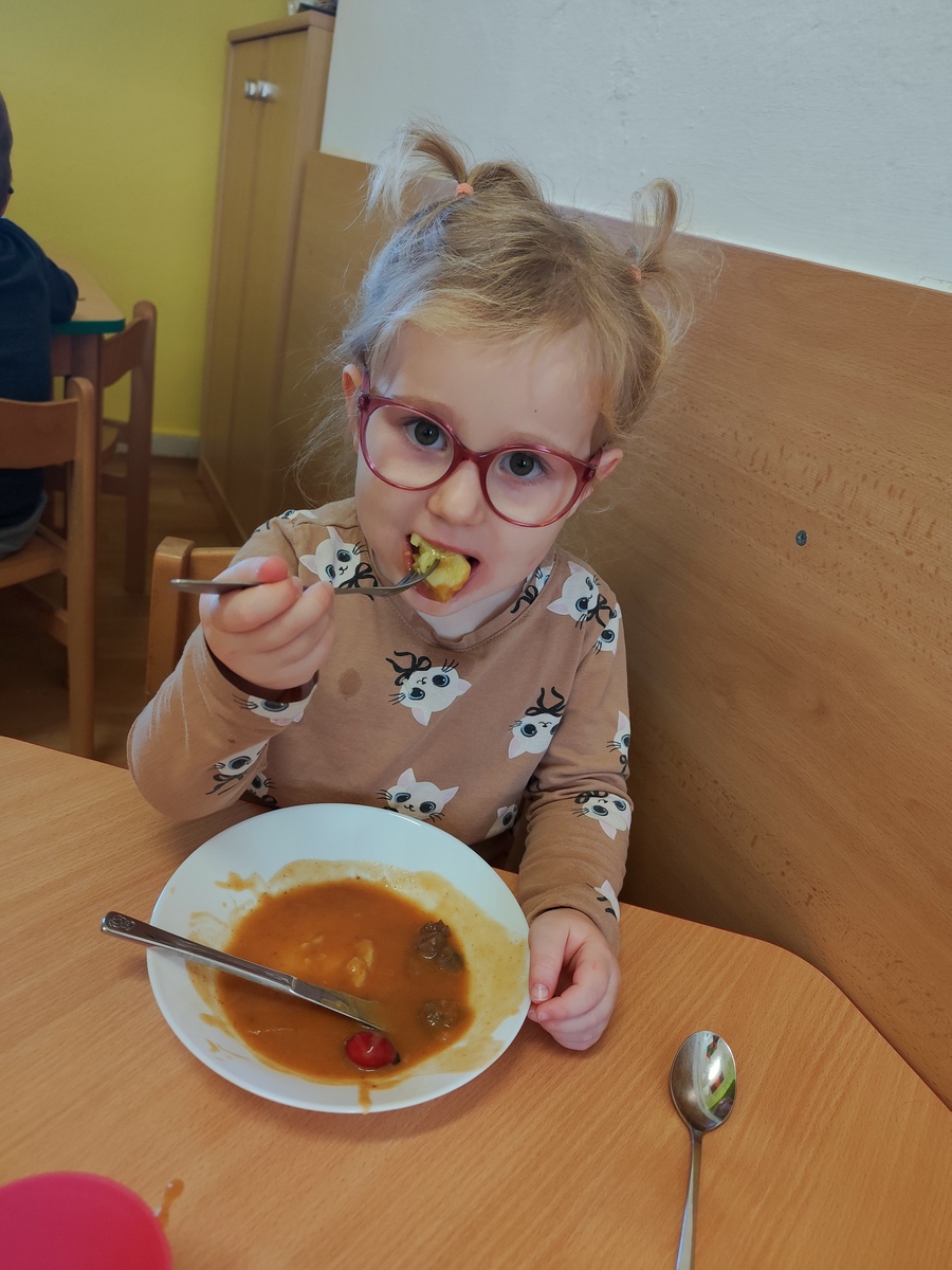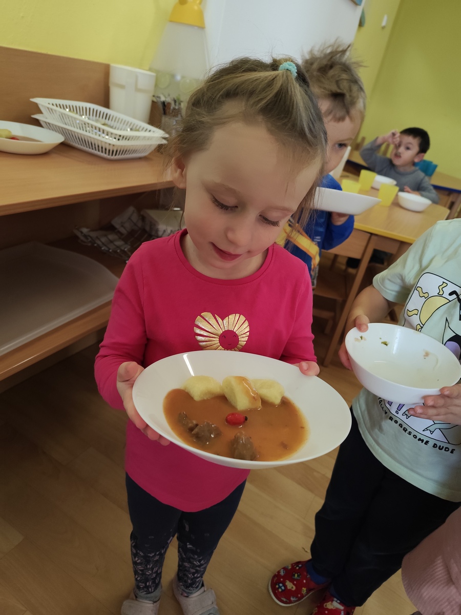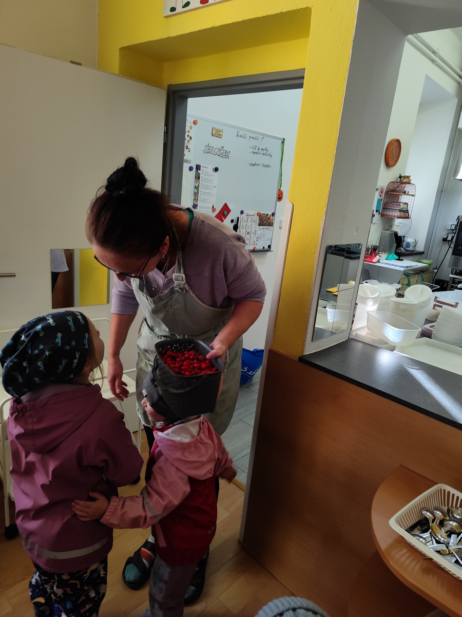 Když byl košík plný, přinesli jsme náš úlovek do školkové kuchyně. Tam paní kuchařka šípky omyla, povařila a proměnila v lahodnou šípkovou omáčku. Vůně se rozlila po celé školce a všichni si pochutnali na obědě, který měl nejen výbornou chuť, ale i kus podzimu v sobě.
