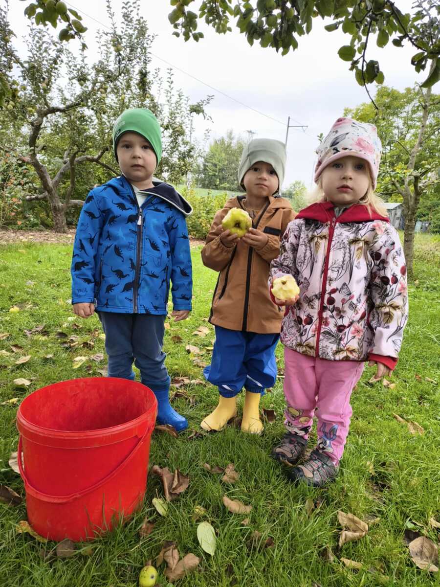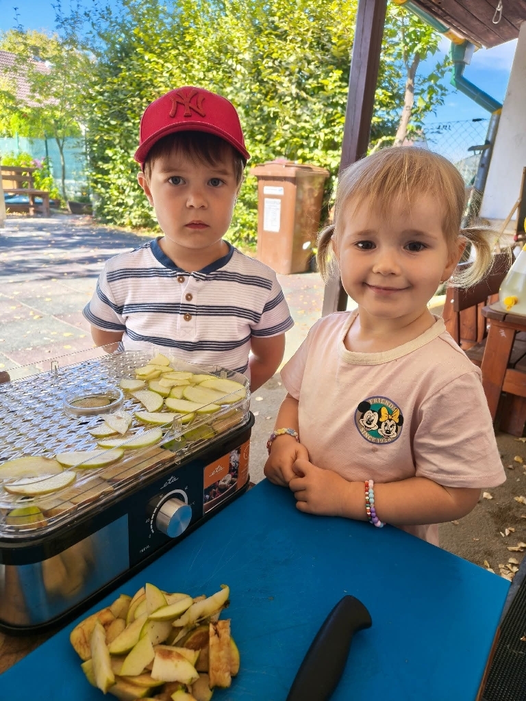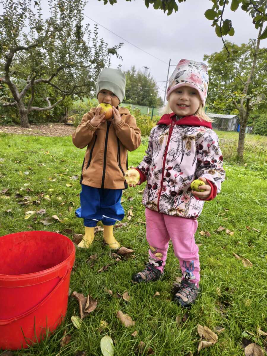 Na naší zahradě máme několik ovocných stromů. V podzimním období sbíráme naše jablíčka. Děti je mají čerstvá ke svačině, ale taky z nich sušíme známé křížaly. Dětem jsou volně k dispozici v mističce k mlsání během celého dne. Většinou do oběda je miska prázdná.