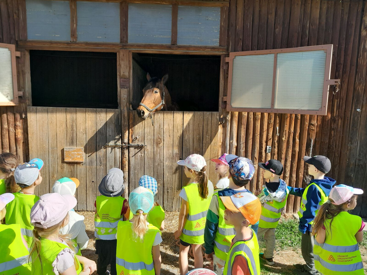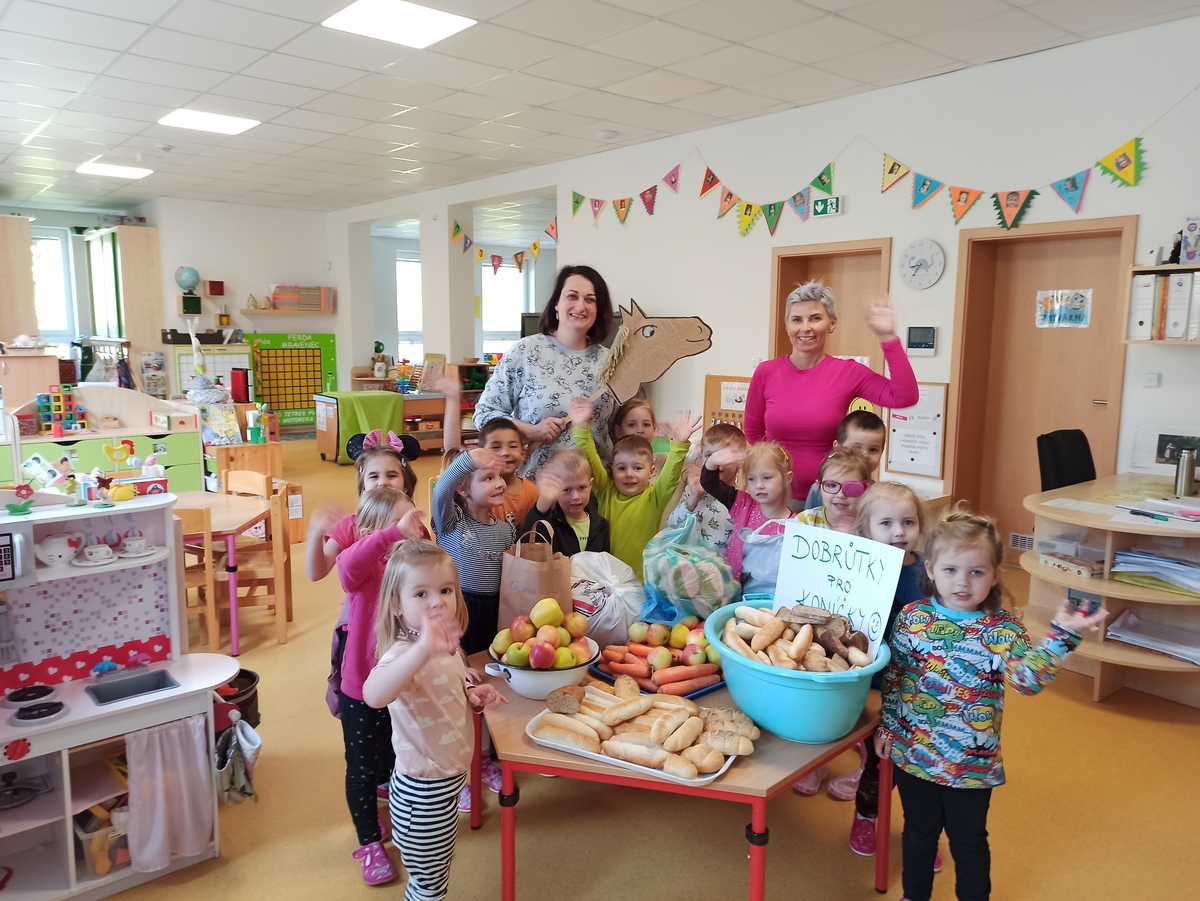 Za vstřícné přivítání a provedení celou jízdárnou na Dřevěném kopci, jsme jako poděkování uspořádali sbírku pro koníky. Děti ze tříd Ferda Mravenec a Krteček nosily suché pečivo, jablka a mrkve, které jsme koníkům zavezli až do stájí.