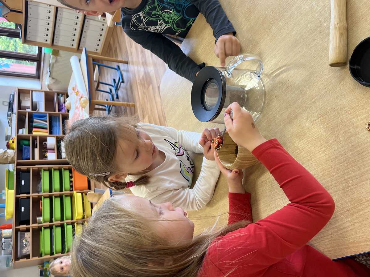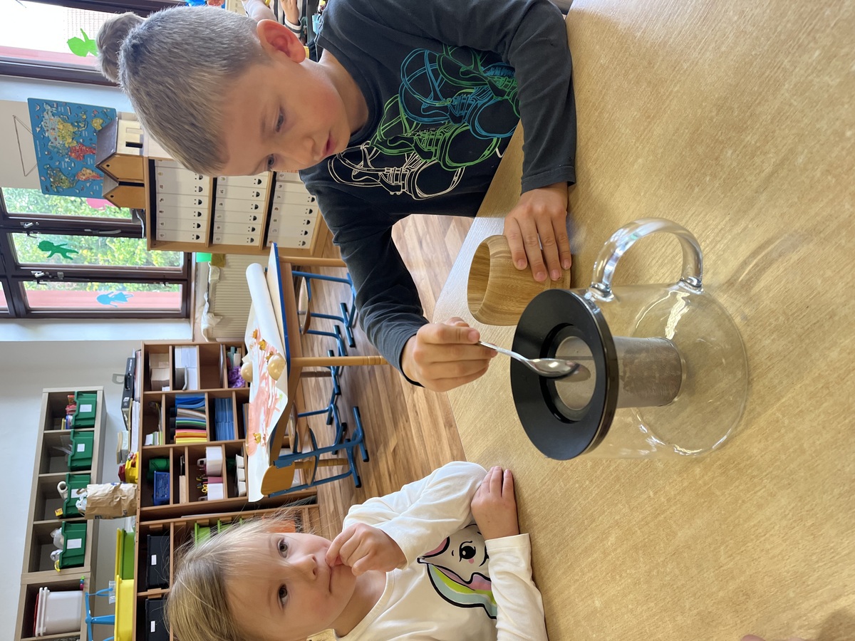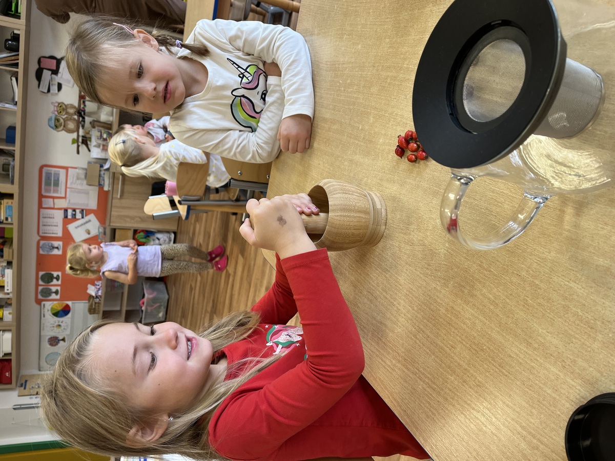 Děti si zkusily uvařit šípkový čaj v rámci poznávání plodů podzimu. Šípky si na vycházce samy nasbíraly. Určily rozdíly mezi čerstvě natrhaným šípkem a usušeným šípkem. Rozdrtily šípky ve hmoždíři a poté sledovaly, jak se horká voda zbarvuje do barev (oranžová, zrzavá, červená). Na závěr zhodnotily, zda je takový čaj zdravý a ochutnaly, jestli jim čaj chutná.