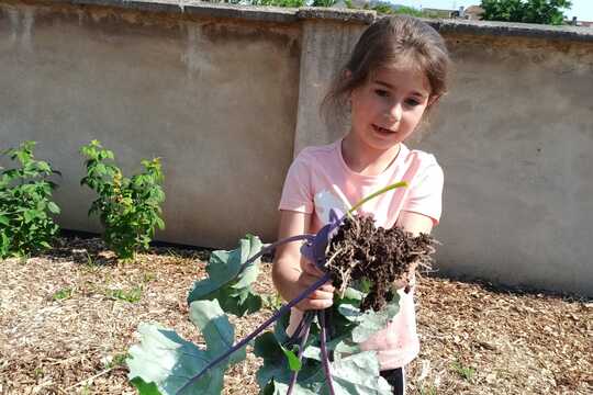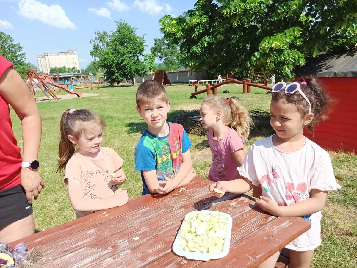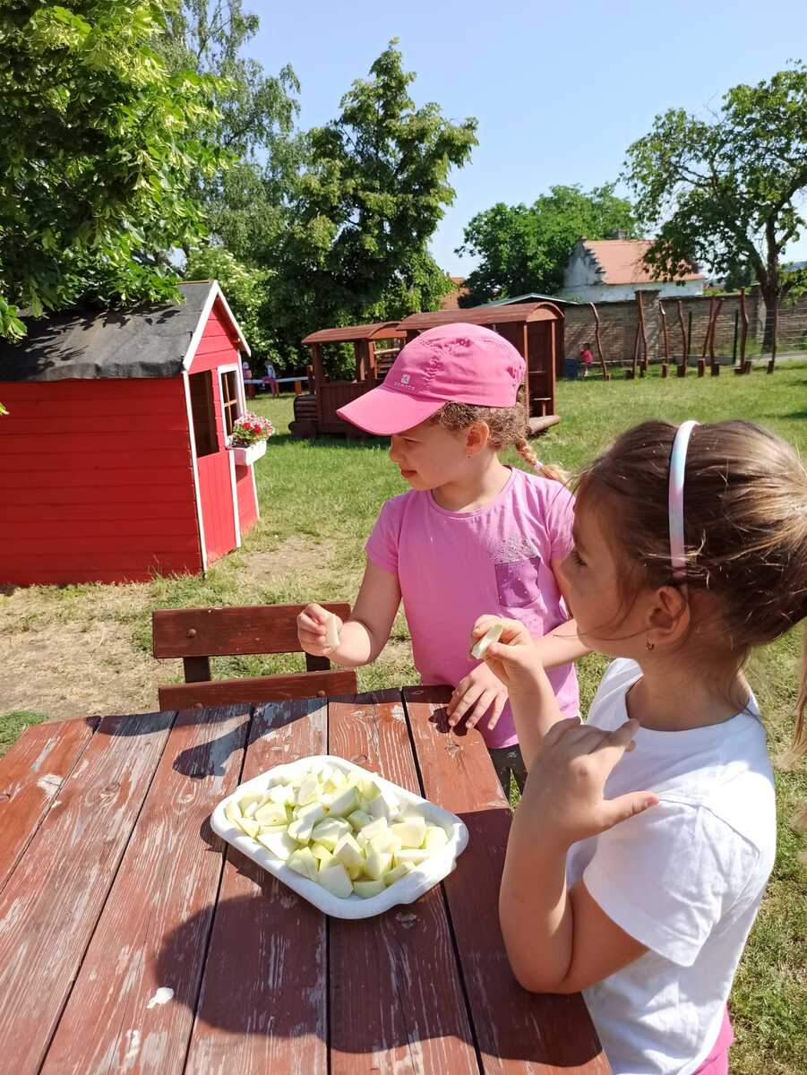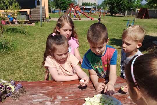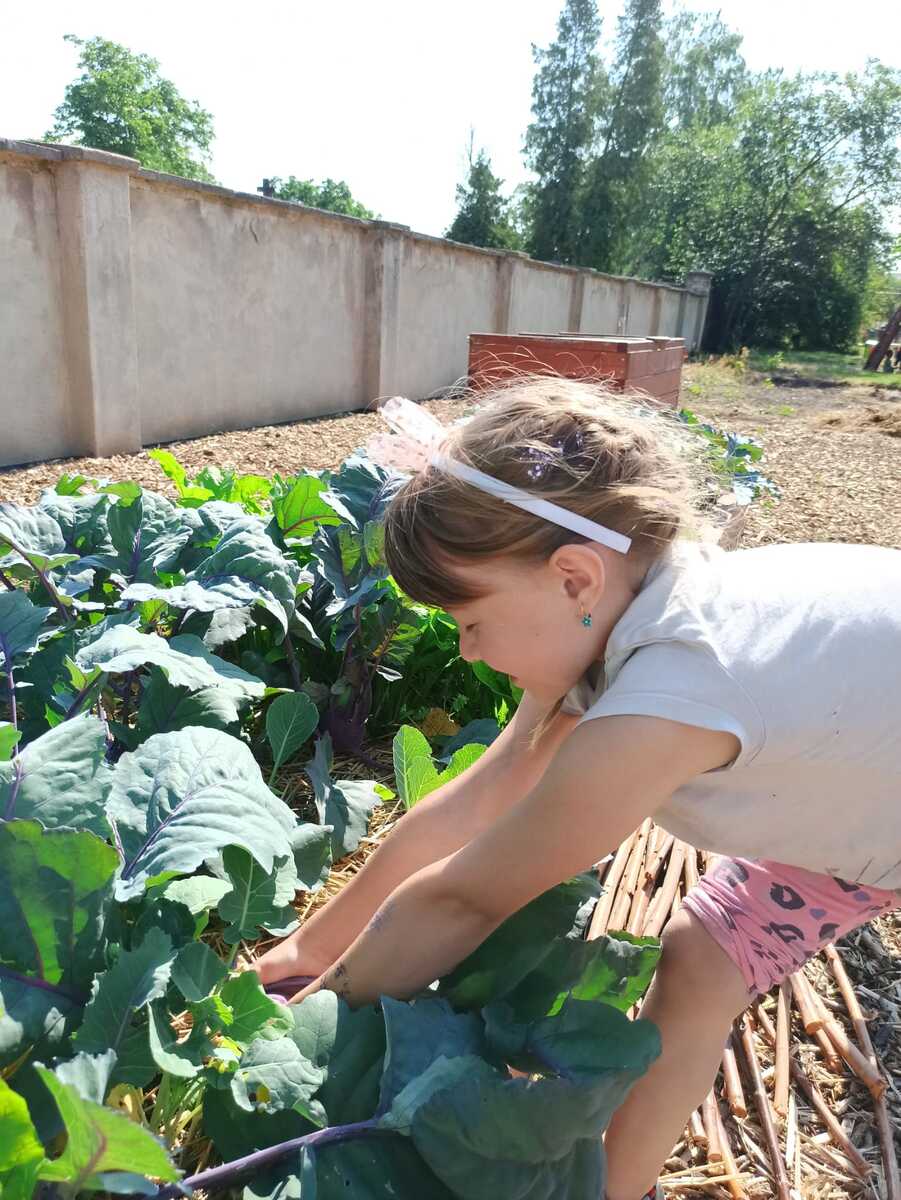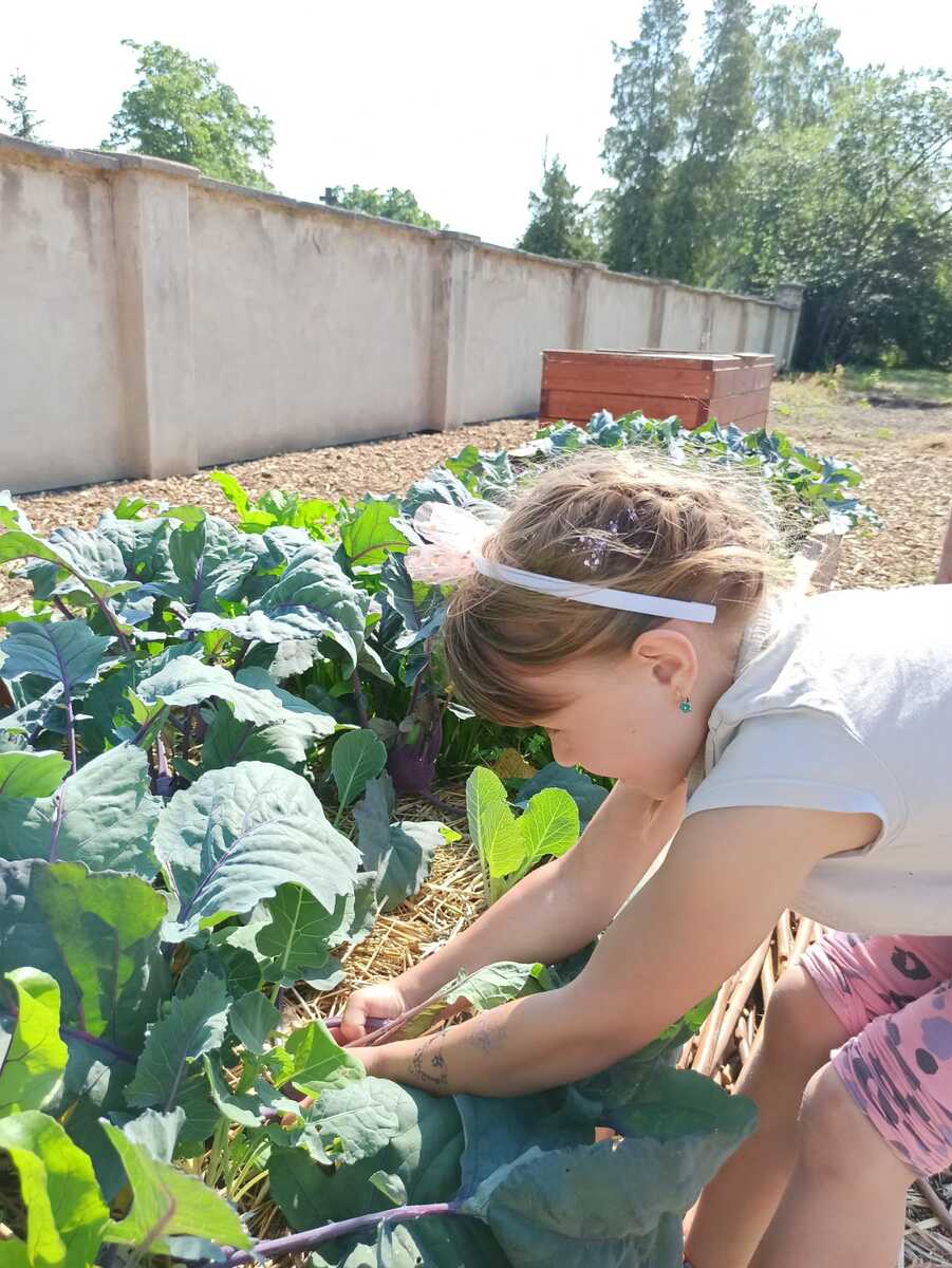 Sklízíme naše vypěstované kedlubny, jahůdky, saláty. Deti si k dopoledni svačince natrhaly kedlubny a moc jim chutnaly.