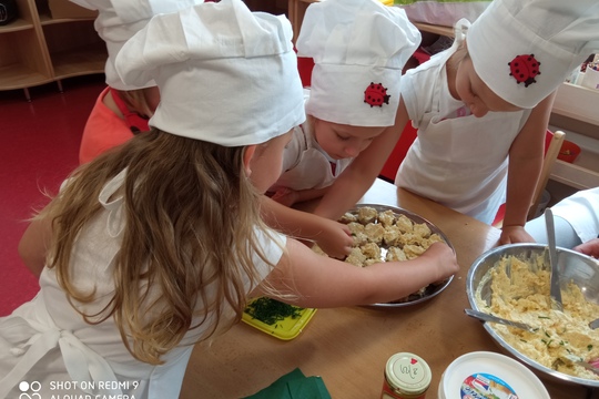 Děti si pro spestření deštivého dopoledne připravily s paníma učitelkama výbornou pomazánku z červené čočky. Do mísy postupně přidávaly zdravé ingredience dle receptu a nezapoměly ani na estetický vzhled. Se svými jednohubkami pohostily zaměstnance, kteří měli uhádnout z kterých surovin je pomazánka připravená. Tímto receptem jsme obohatili letní nápady na rychlé pohoštění.