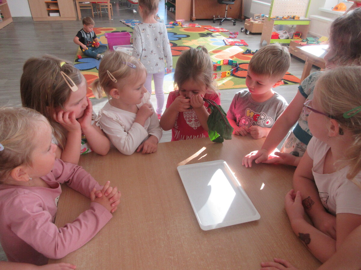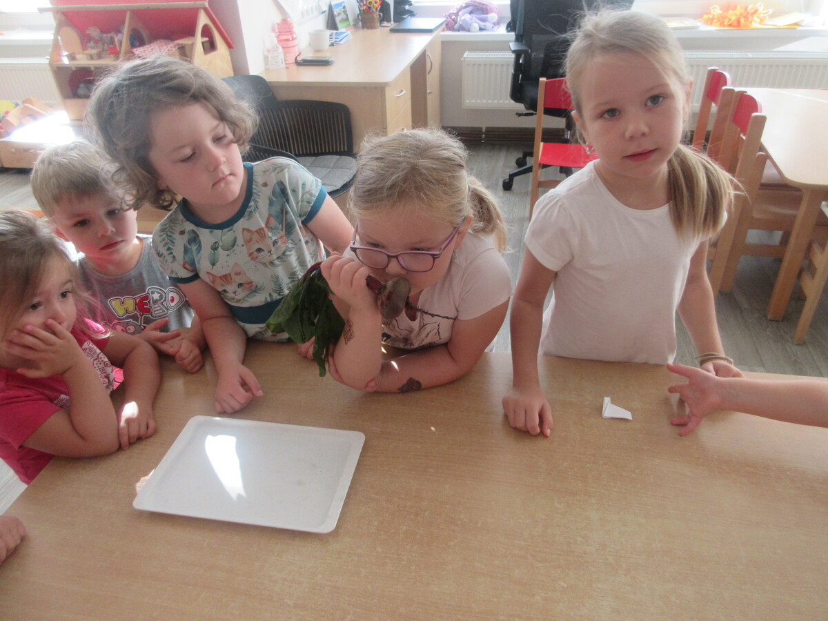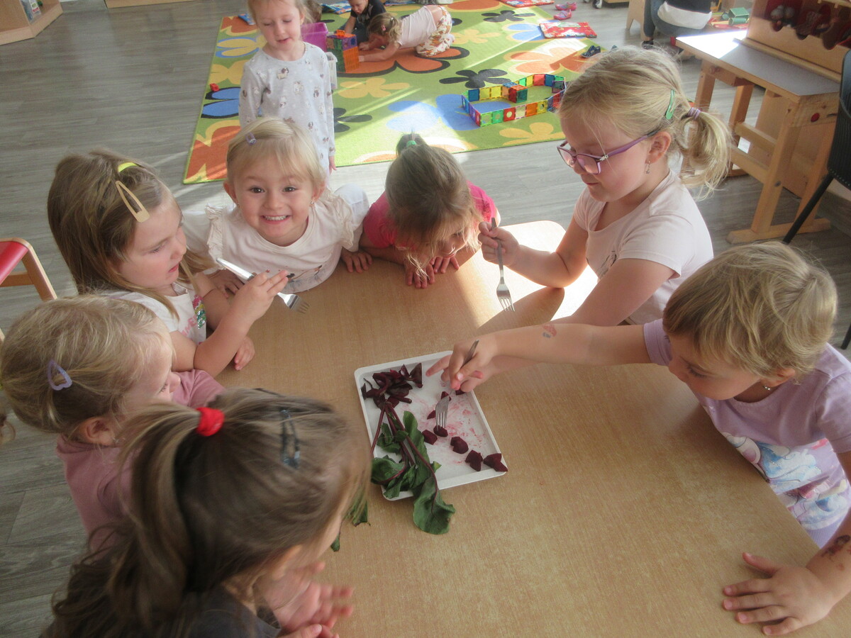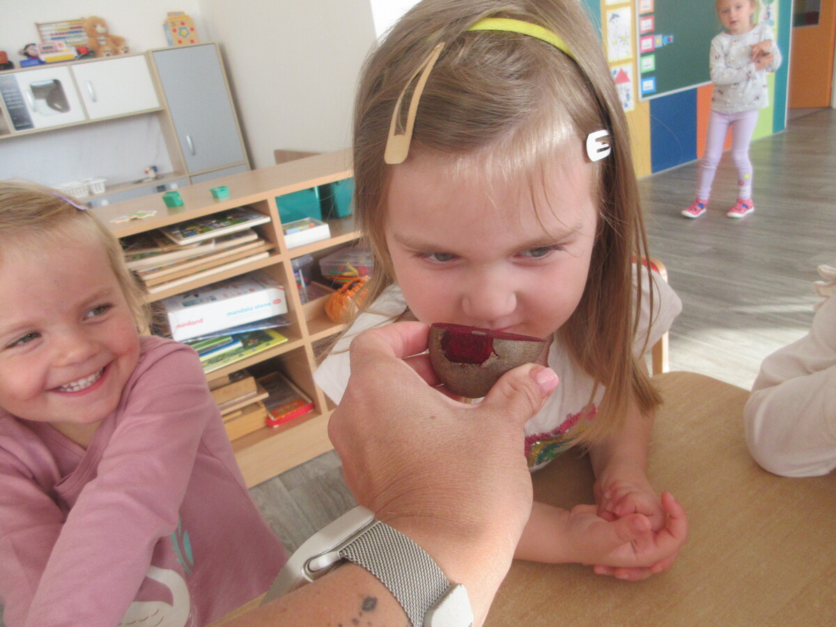 Děti ze třídy Sluníčko se v novém školním roce s radostí pustily do práce na svém záhonu. Společně sklidily řepu, kterou na jaře zasely. Společně si ji ještě u záhonu pořádně prohlédly – objevovaly její kořen, listy i vůni. Ve třídě pak řepu zkoumaly všemi smysly: osahaly její tvar, přivoněly si k čerstvě utrženým listům a některé ji i ochutnaly. Nezapomněly ani na bylinky, které na záhonu rostou. Nejvíce je zaujala voňavá meduňka a svěží petrželka. Děti si tak hravou formou rozšiřovaly znalosti o rostlinách a učily se pečovat o přírodu kolem sebe.