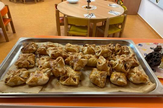 Dne 6.10.2021 jsme v naší MŠ uskutečnili s dětmi "Jablíčkový den". Děti si z domova donesli jablíčka. Nejprve jsme si o něm povyprávěli ( kde rostou, druhy, barvy a o významu na zdraví ). Poté si každé dítě oloupalo své jablíčko, společně jsme ho nasrouhali a zabalili do listového těsta. Po upečení si na něm děti moc pochutnaly.