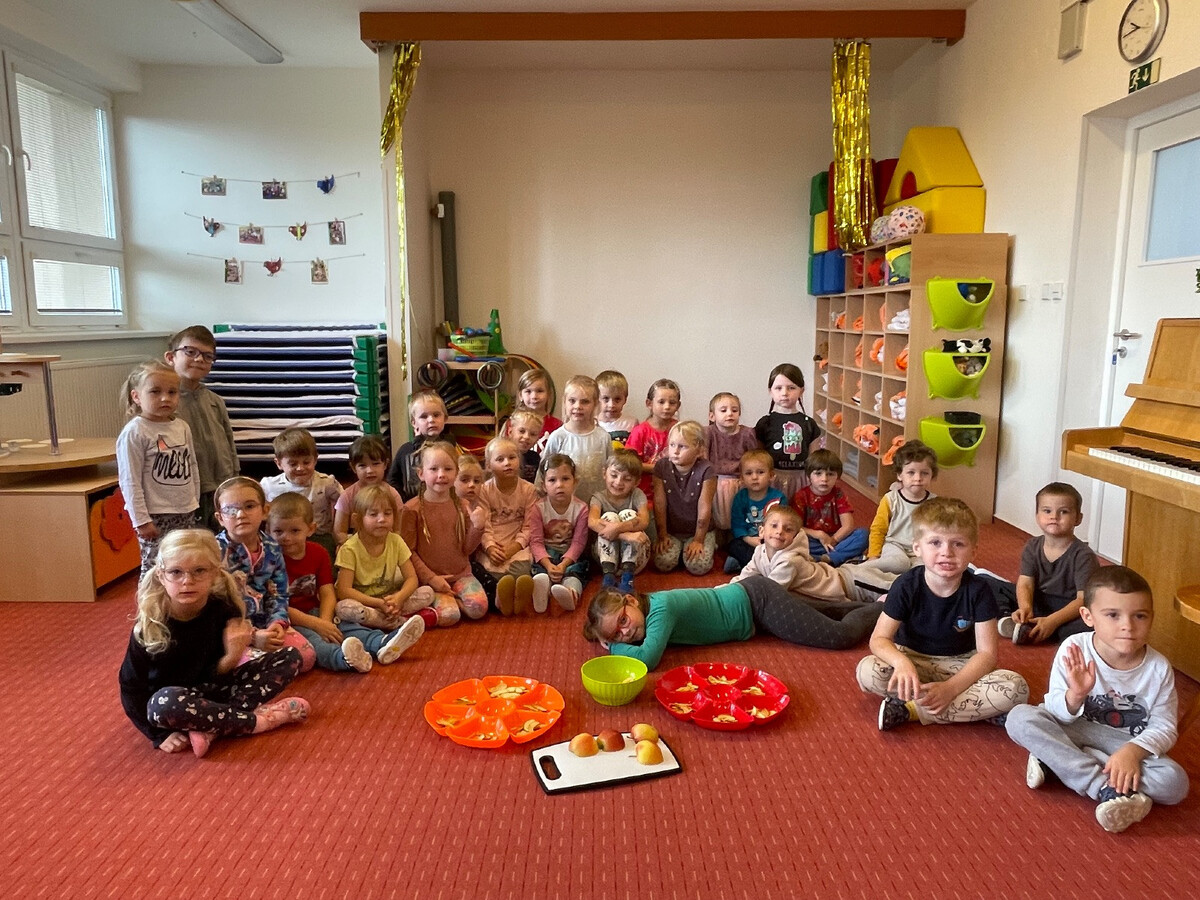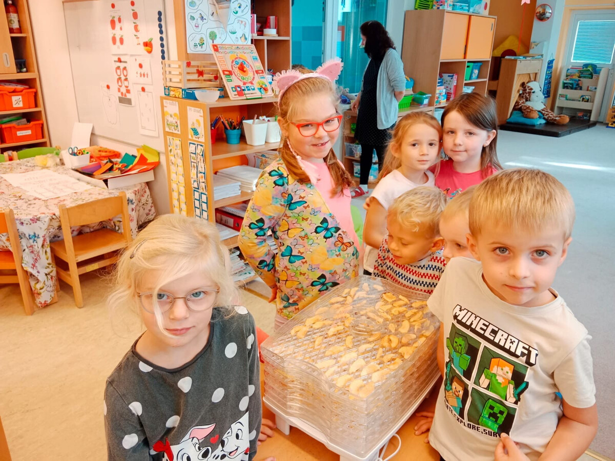 Během celého procesu si děti osvojovaly praktické dovednosti – jemnou motoriku při krájení tupým nožem, učily se trpělivosti a pozorování změn, které nastávají během sušení. Sušená jablíčka jsme pak společně ochutnali jako zdravou svačinku, kterou si děti hrdě odnesly domů a mohly se pochlubit, že jsou to jejich „křížaly“ – sladká odměna za jejich snahu.