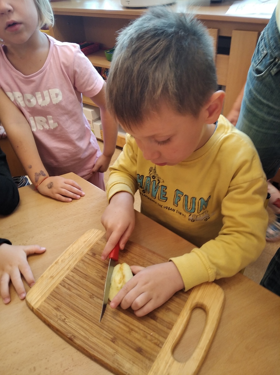 Jako každý rok si s dětmi povídáme o sklizni ovoce, zeleniny. O tom, jak je pro naše tělo důležité nejen v zimním období. Vyzkoušeli jsme si usušit ovoce a zjístít, zda by nám chutnalo i v jiním provedení. Konktrétně jsme vybrali jablíčka a hrušky.Děti si je pokusily nakrájet a daly do sušičky. Chuť křížal mnohé děti překvapila. Jablíčka jsme použili ze zahrádky, které nám donesli rodiče. Příprava klasických křížal nevyžaduje žádné zvláštní dovednosti, jen trpělivost, protože umytá a neoloupaná jablka prostě nakrájíme a zbavíme jádřinců.Vše se povedlo a děti si dobře pochutnaly.