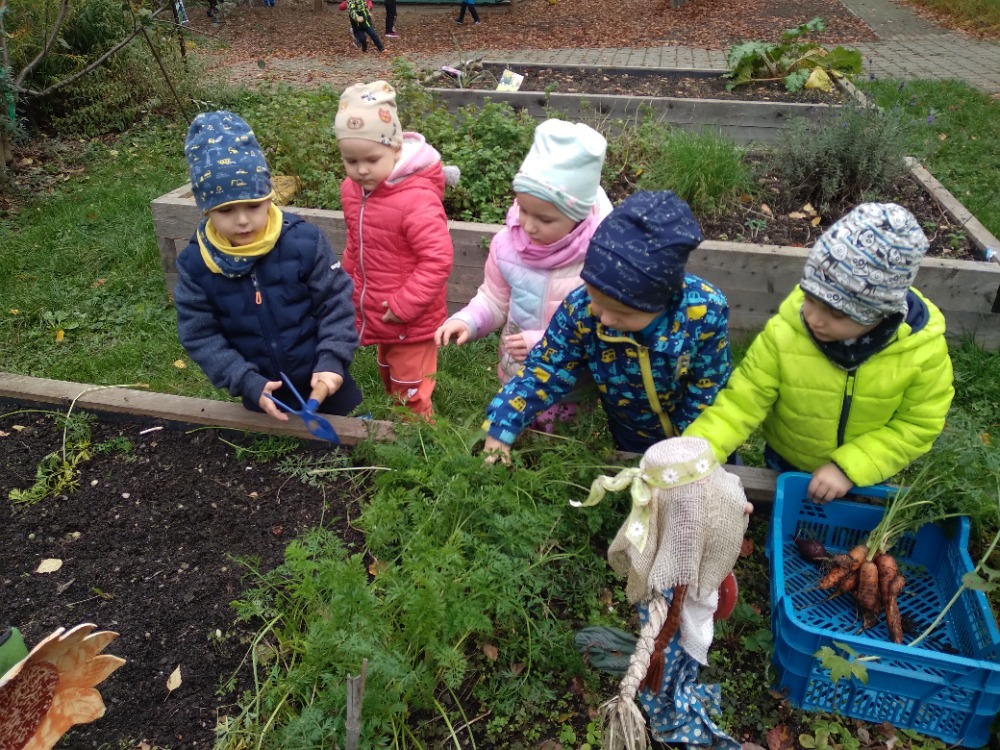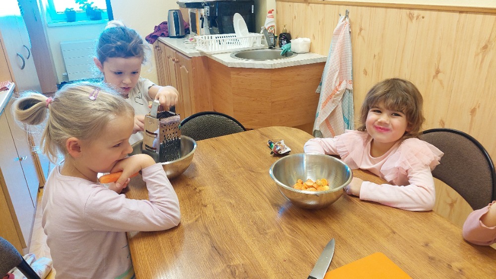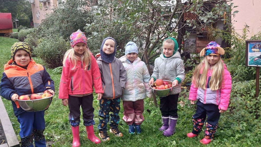 Nastal podzim a s dětmi jsme sklidili krásnou úrodu mrkve z našeho záhonku. Z jablůňky děti obraly celou mísu červených jablíček. Rozhodli jsme se, že jablíčka i mrkev využijeme k upečení zdravých sušenek. Datlíci – děti z ekologických aktivit se jedno odpoledne pustili do pečení. Nastrouhali jablíčka a mrkve, přidali ovesné vločky, vajíčko, vše osladili medem, promíchali a lžičkou kladli na plech malé kopečky. Při pečení se vůně linula celou mateřskou školou. Sušenky chutnaly skvěle, Datlíci se podělili s kamarády ve třídě a dali ochutnat i p. učitelkám. Měli jsme velikou radost, že jsme využili jablíčka i mrkev z naší zahrady.