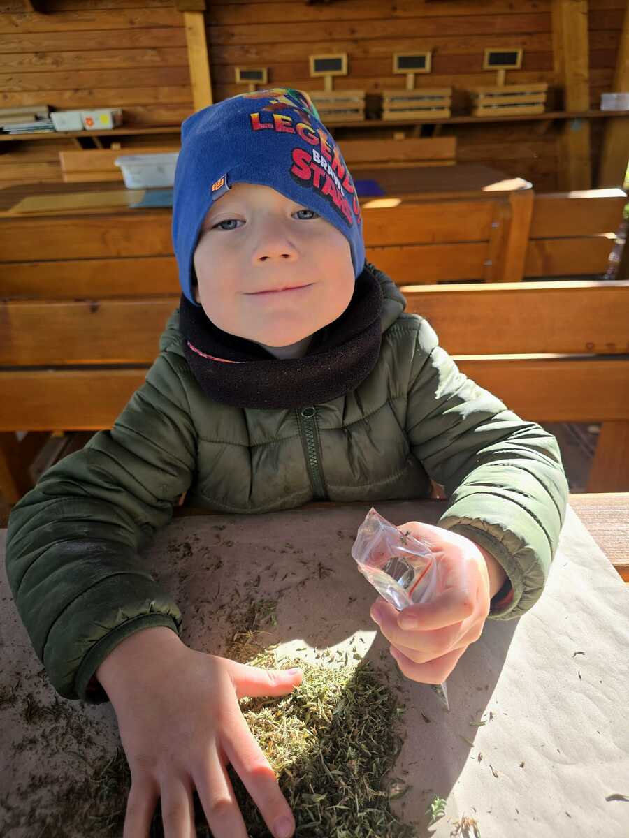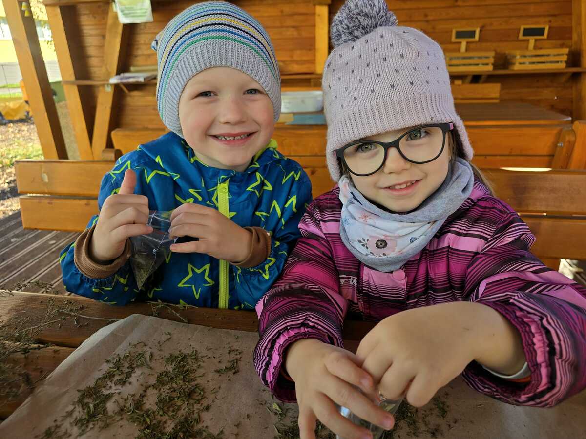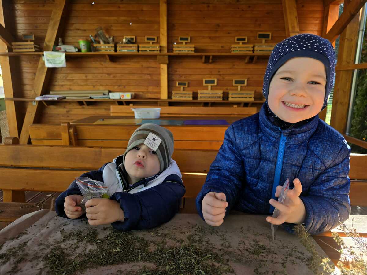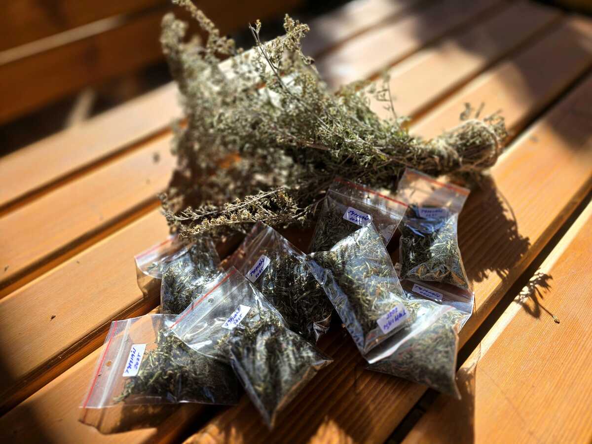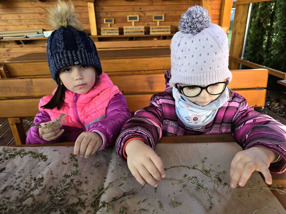 Tymián je usušený a pomalu ho s dětmi pytlíčkujeme. Až se dosuší ostatní bylinky (estragon, saturejka a oregáno..), chystáme se vyrábět provensálské koření. Děti se k této činnosti hlási samy a jsou skvělí pomocníci.