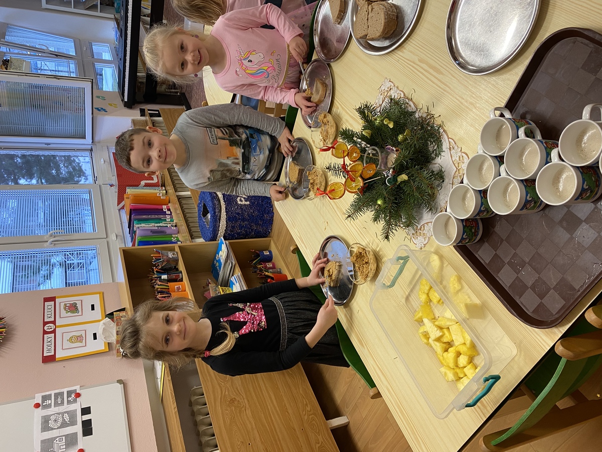 Každý pátek nám paní kuchařky nachystají dobrou pomazánku, děti si pak samostatně mažou chleba a chystají svačinku. Příště si ji zkusíme připravit sami.