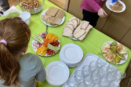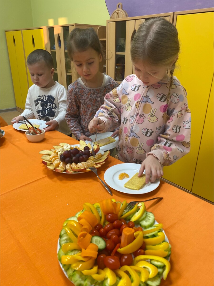 Po domluvě s našimi kuchařkami jsme se rozhodly, že dětem přichystáme snídaňový raut. Máme pět tříd a každá třída si musela nachystat prostor, kde se vše přichystá. Dětem jsme nabízeli rybí pomazánku zdobenou zeleninou, chléb či knäckebrot. Bílý jogurt, pukance, ovocný a zeleninový talíř. Na pití bylo k výběru mléko, čaj a voda. Pro děti to bylo velké překvapení, že si mohou vzít nač mají opravdu chuť. Někteří to komentovaly slovy, že je to jak v hotelu. S dětmi dbáme hlavně na kulturu stolování.