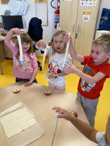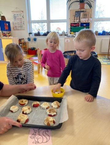 12.listopadu jsme se s Veverkami pustily do svatomartinského pečení s využitím domácích bio jablíček, která nám donesly děti ze svých zahrádek. Před tím, než jsme se pustili do našeho pekařského umění, přečetli jsme si legendu o sv. Martinovi, která byla vlastně naší inspirací na toto pečení. Jako se Martin rozdělil o svůj plášť se žebrákem, aby mu nebyla zima, my jsme využili jablíčka a listové těsto, abychom je zabalili, tzv. do župánku. Těsně před pečením zabalená jablíčka děti „orazítkovaly“ ve skořicovém cukru a společně jsme je dali péct. Po 20 minutách se chodbou školky rozplynula úžasná sladká vůně a naše župánková jablíčka byla hotová.