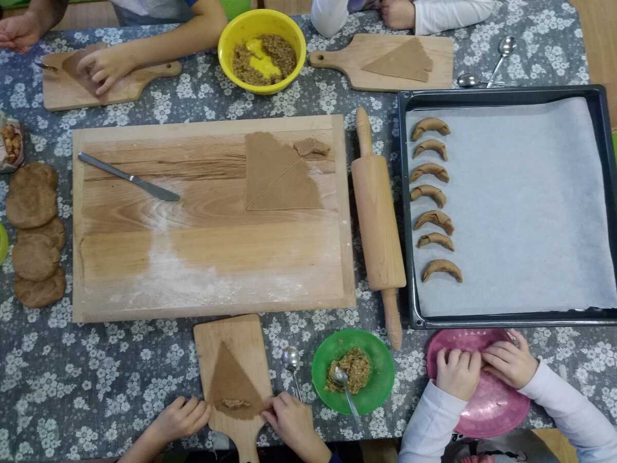 Během oslav svátku svatého Martina jsme se pustili do pečení svatomartinských rohlíčků. Připravili jsme si všechny potřebné suroviny - špaldovou mouku, rostlinné máslo, ovesnou smetanu, vlašské, lískové a kešu ořechy, med, skořici a bio mletou vanilku. Možná, že jste překvapeni výběrem surovin, ale vše jsme dělali tak, abychom si upekli něco opravdu zdravého a zároveň mohli ochutnat i naši kamarádi, kteří mají alergii na mléčné výrobky. Všechny potřebné ingredience jsme smíchali, vypracovali z nich těsto, a pak už jsme jej rozváleli na tenký plát, nakrájeli trojúhelníky, ty pak smotali a vytvořili krásné rohlíčky! A i když Martin letos na bílém koni nepřijel, my jsme si tento den náramně užili.
