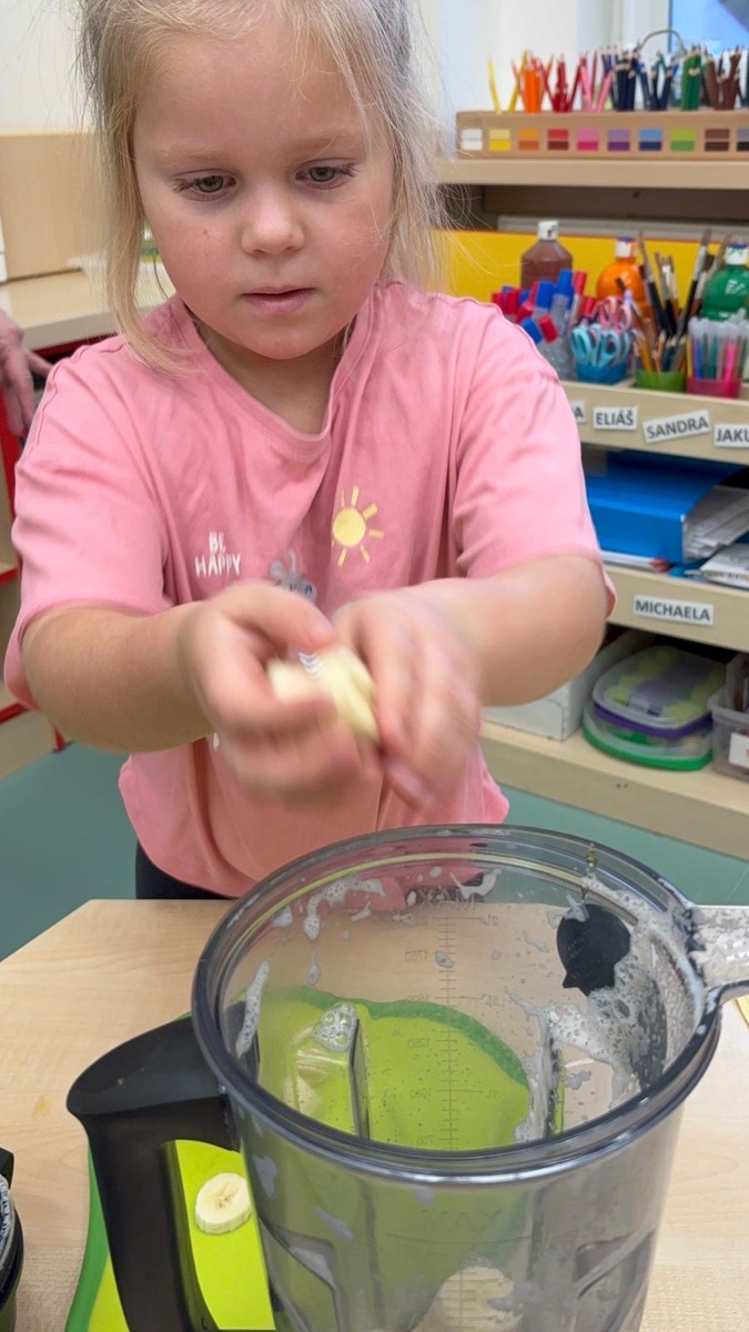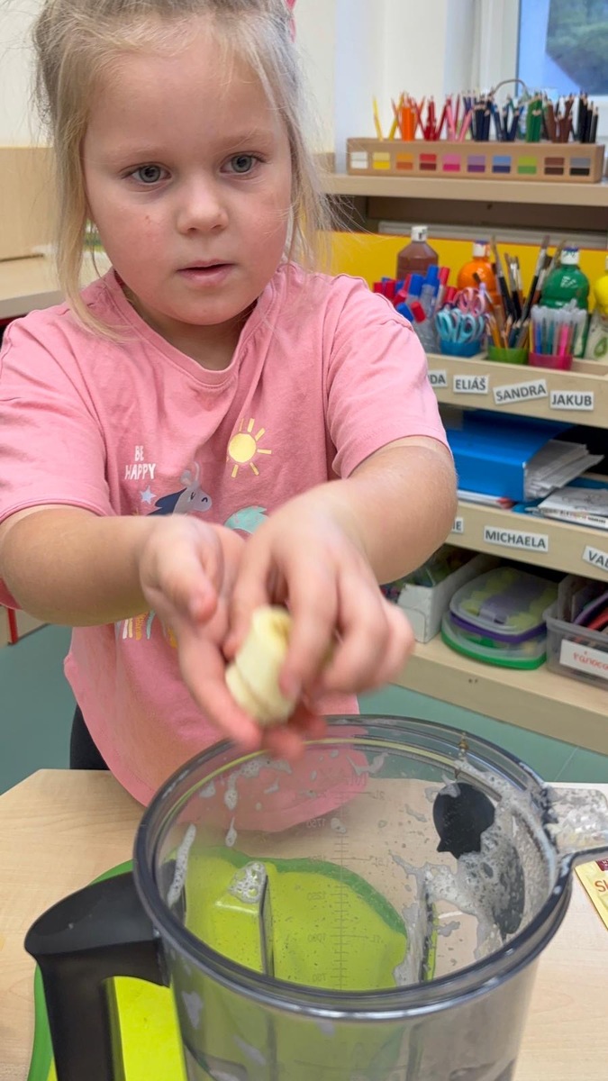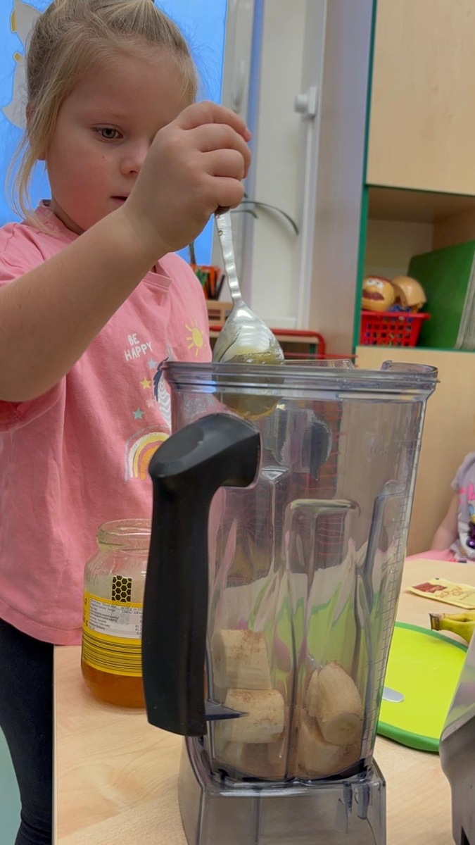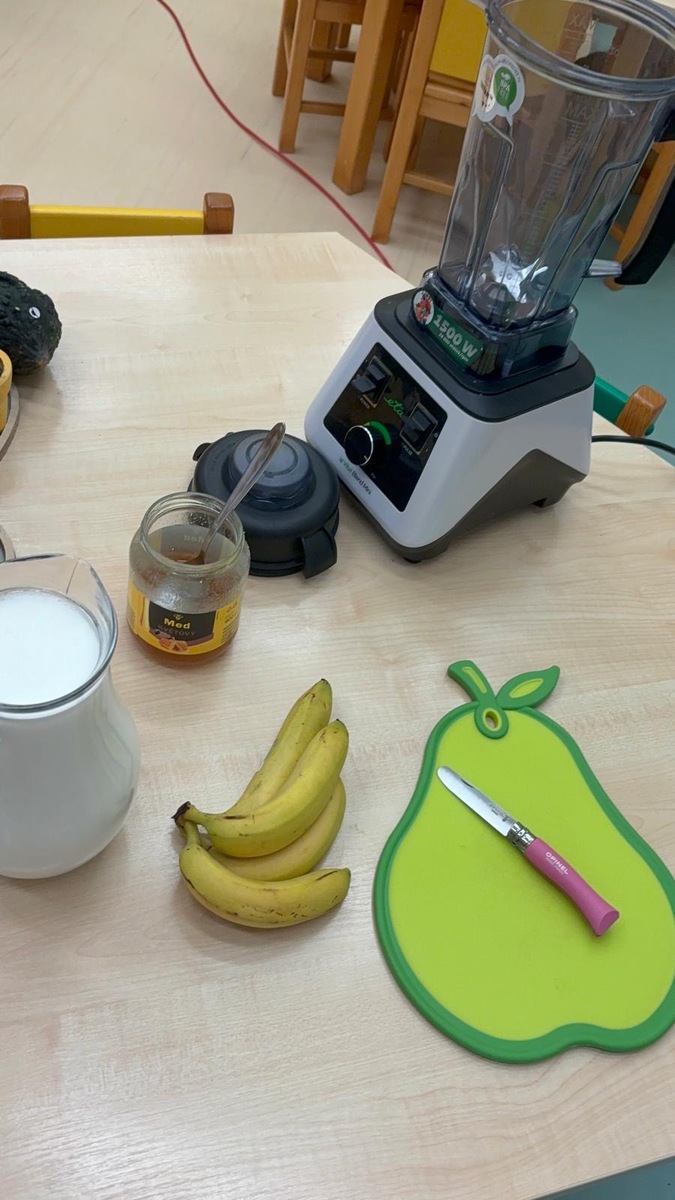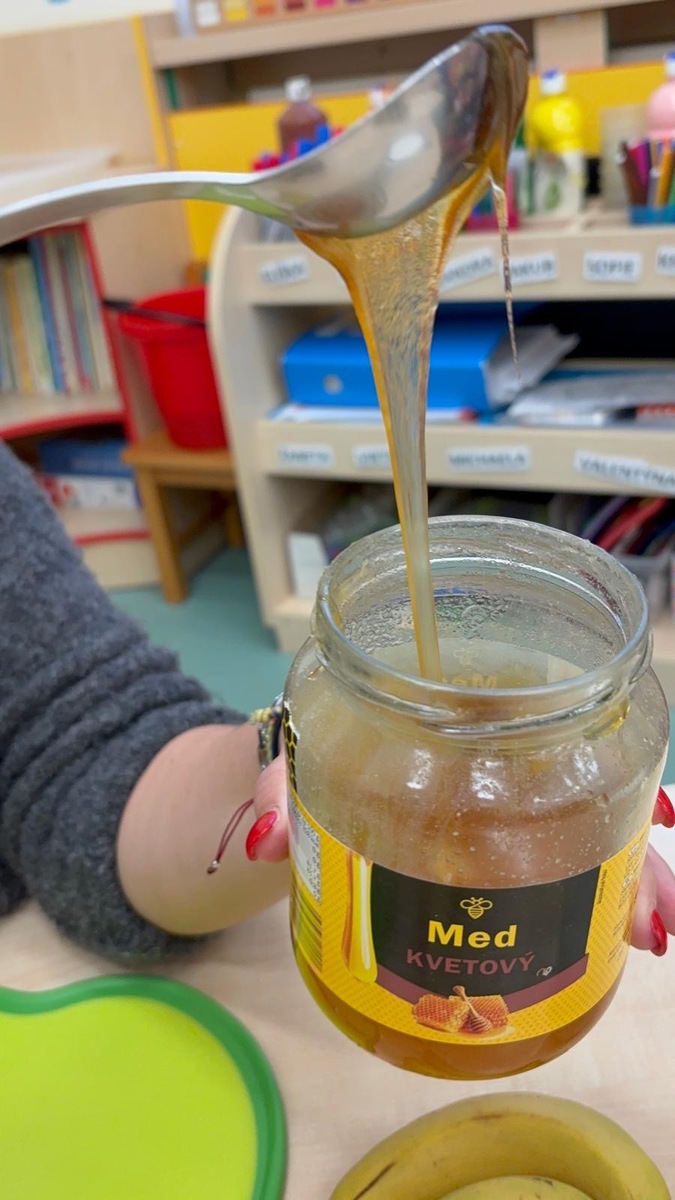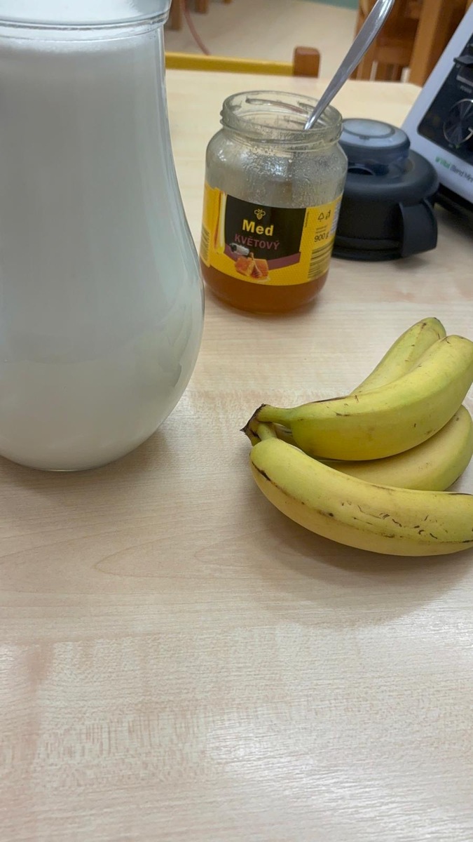 Děti si dnes připomněly světový den medu a med použily pro vytvoření banánovo- medový koktejl pro přátelský přípitek s kamarády ze Znojma. Po společné domluvě si posíláme navzájem sladký medový pozdrav.