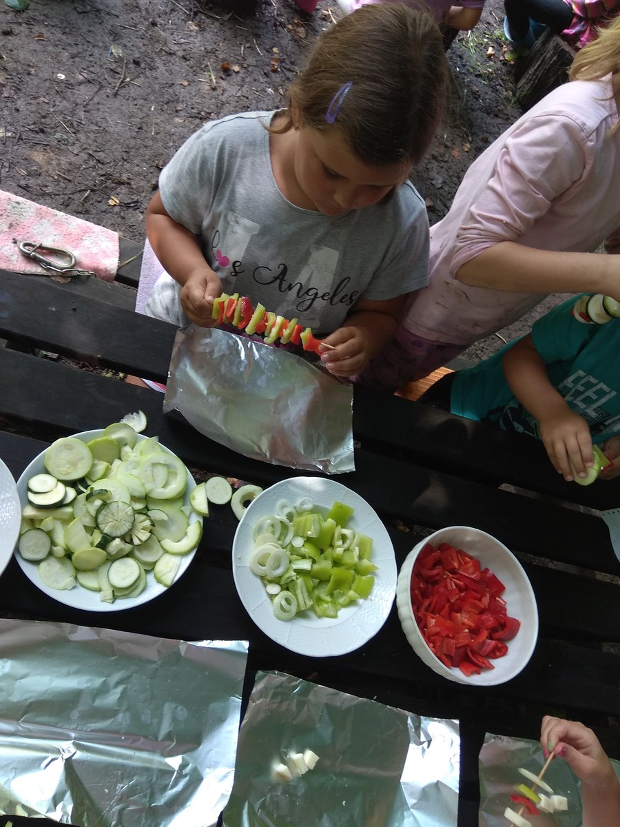 Déšť nás neodradil od pečení hadů na klacku ani špízů v alobalu. Školková zahrada nás pohostila jablíčky, ze kterých jsme si upekli jablečné lívance, přidali je do kaše a nebo pojídali jen tak kdykoliv si zachtěli. Z prvních dýní ze zahrádky jsme uvařili polévku Hokkaido a společně s mrkví udělali karbenátky. Z okolních luk děti nasbíraly známé bylinky na čaj i k pomazánce. Nechyběla ani červená řepa v boršči s tempehem. Volné chvíle jsme prožili tvořením mandal ze semínek a koření, malováním vařeček, učením nové říkanky před jídlem, čtením a povídáním o lidech z pravěku a jejich těžkostech při hledání obživy. Nakonec, při bubnování deště, jsme zkusili poslepu uhádnout dle chuti a vůně suroviny, které používáme v kuchyni.