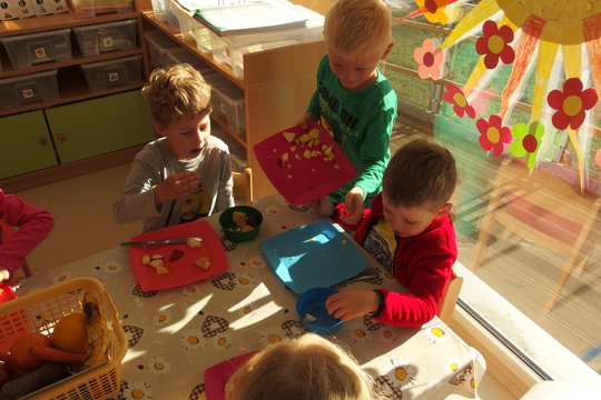 Jednoho podzimního dne jsme si s dětmi naplánovali přípravu ovocného salátu. Jelikož jsme školka na vesnici, poprosili jsme rodiče o ovoce přímo ze svých zahrádek. Ovoce, které nám pochybělo jsme zakoupili na farmářských trzích. Děti umyté ovoce oloupaly, krájely a po-té rozdělovaly do misek pro všechny. Dětem ovocný salát velice chutnal.
