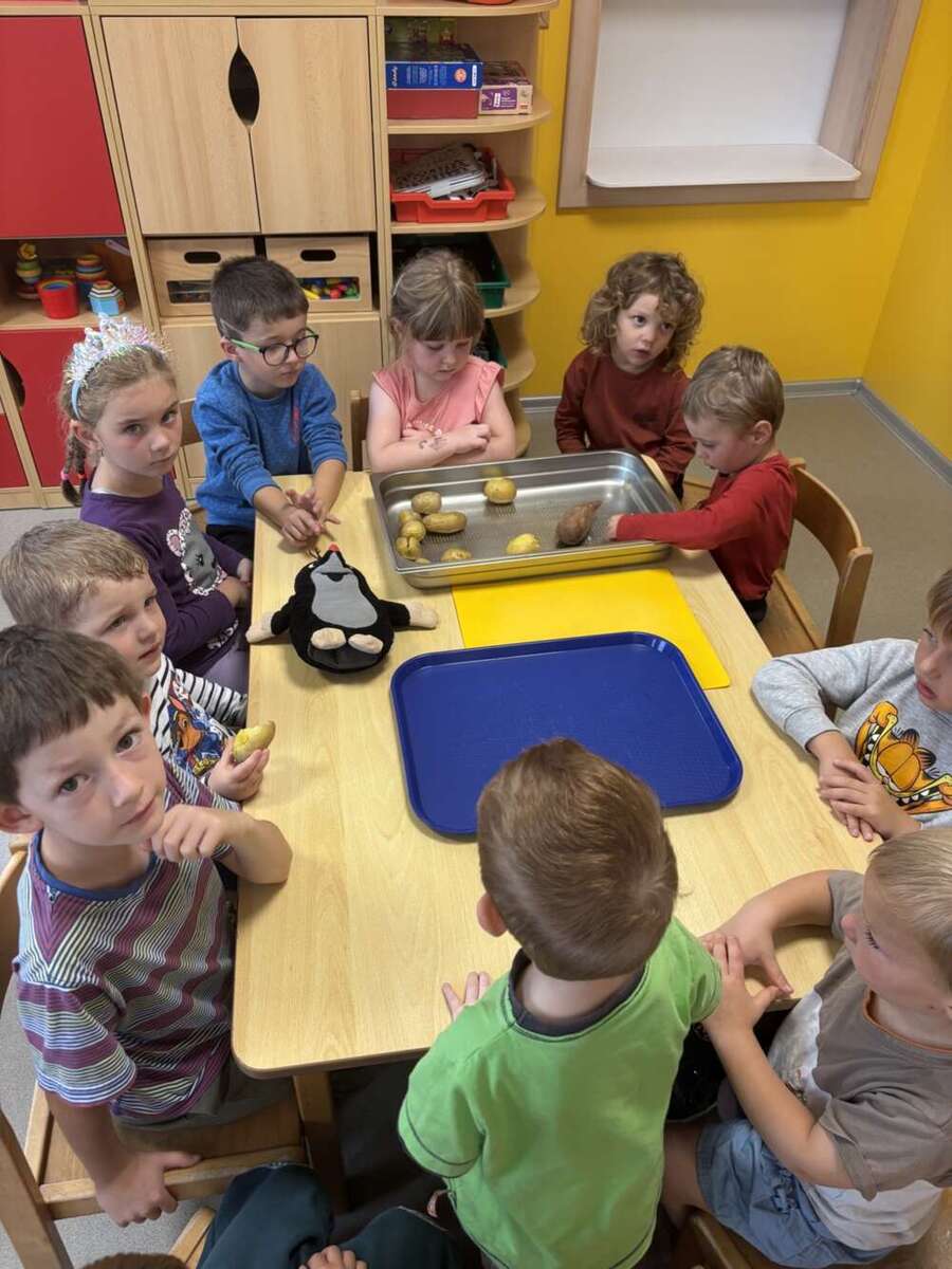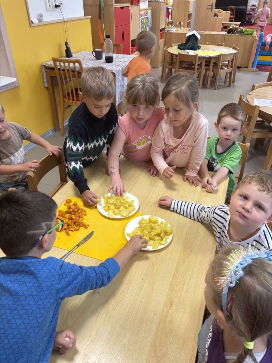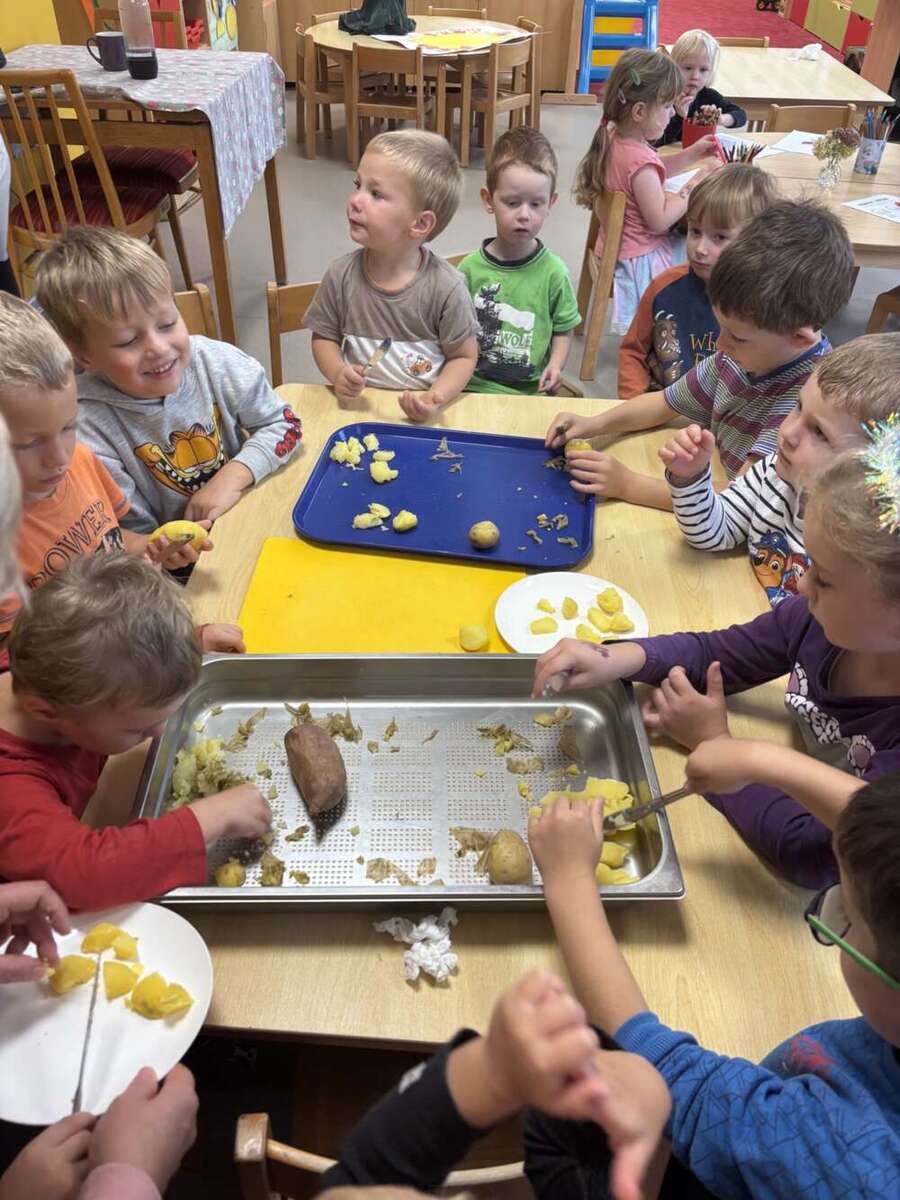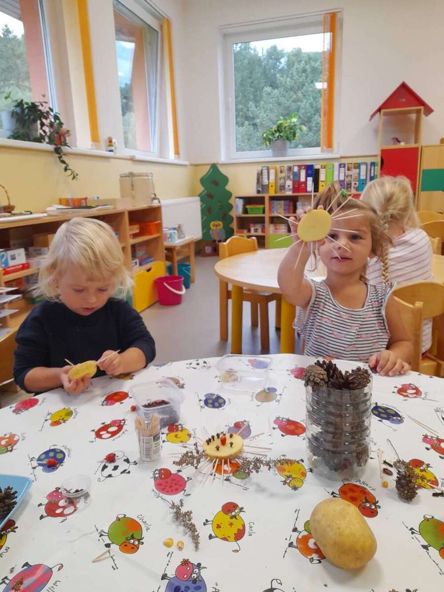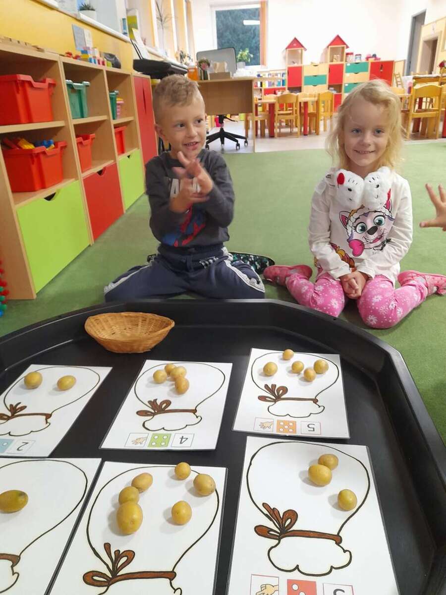 Povídali jsme si o tom, co vše se dá na poli vypěstovat, zkusili jsme si vyrobit bramborové sluníčko, počítali, třídili, rovnali, kreslili, myli brambory. Nechyběly ani traktory a "žížalovník" . Nakonec nám paní kuchařka brambory uvařila a my si je mohli oloupat, nakrájet a sníst.