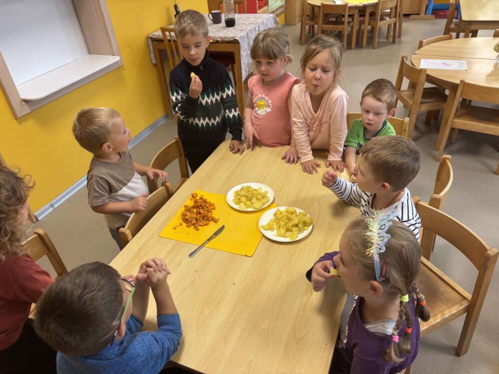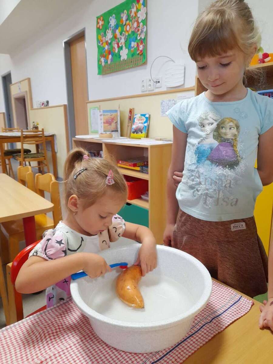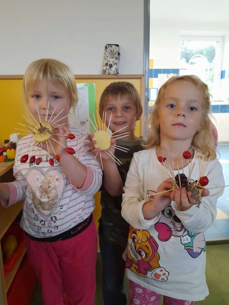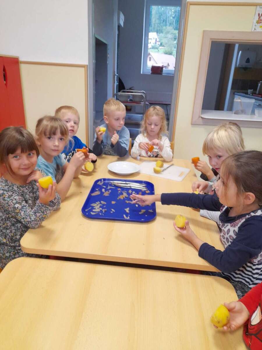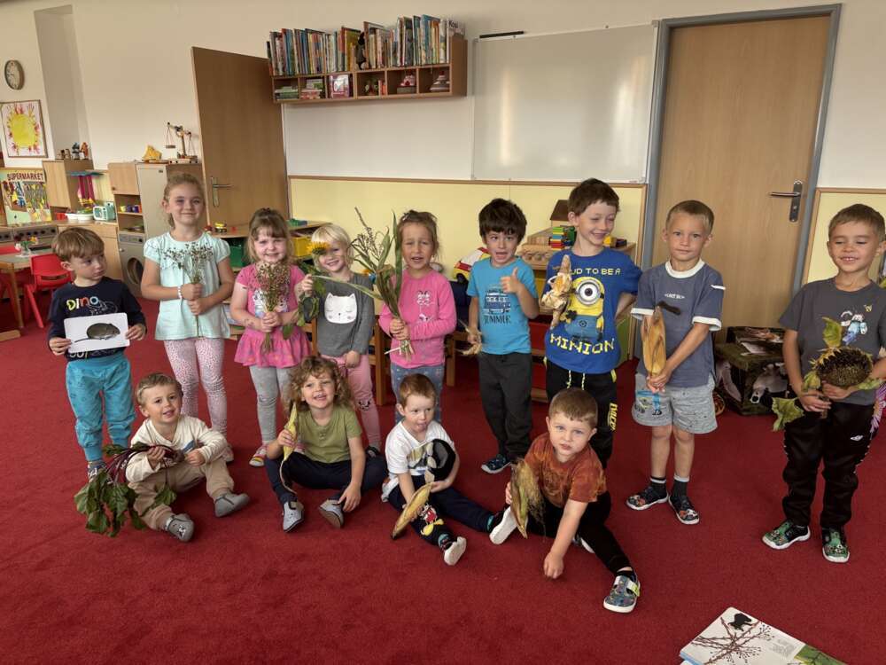 Povídali jsme si o tom, co vše se dá na poli vypěstovat, zkusili jsme si vyrobit bramborové sluníčko, počítali, třídili, rovnali, kreslili, myli brambory. Nechyběly ani traktory a "žížalovník" . Nakonec nám paní kuchařka brambory uvařila a my si je mohli oloupat, nakrájet a sníst.