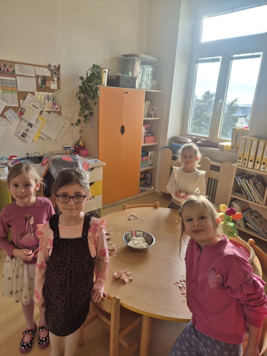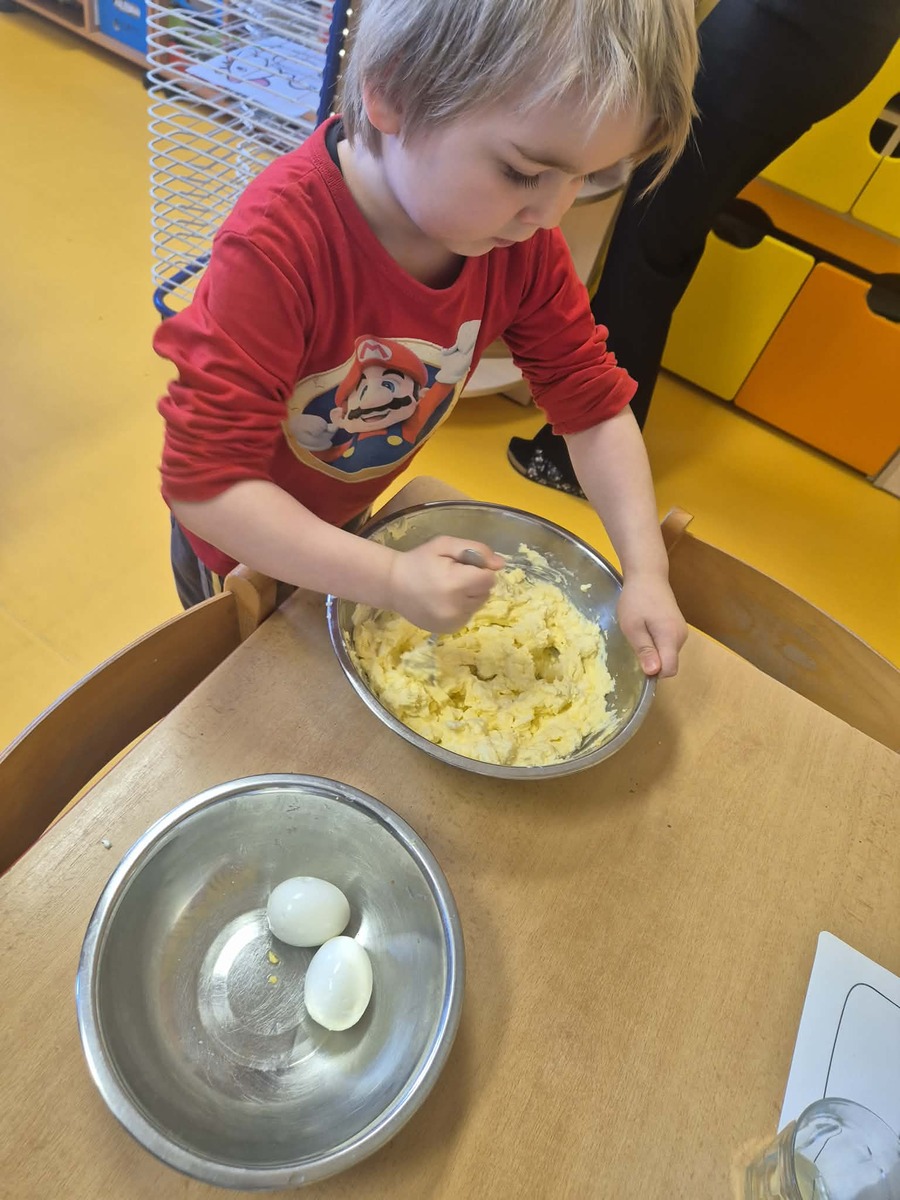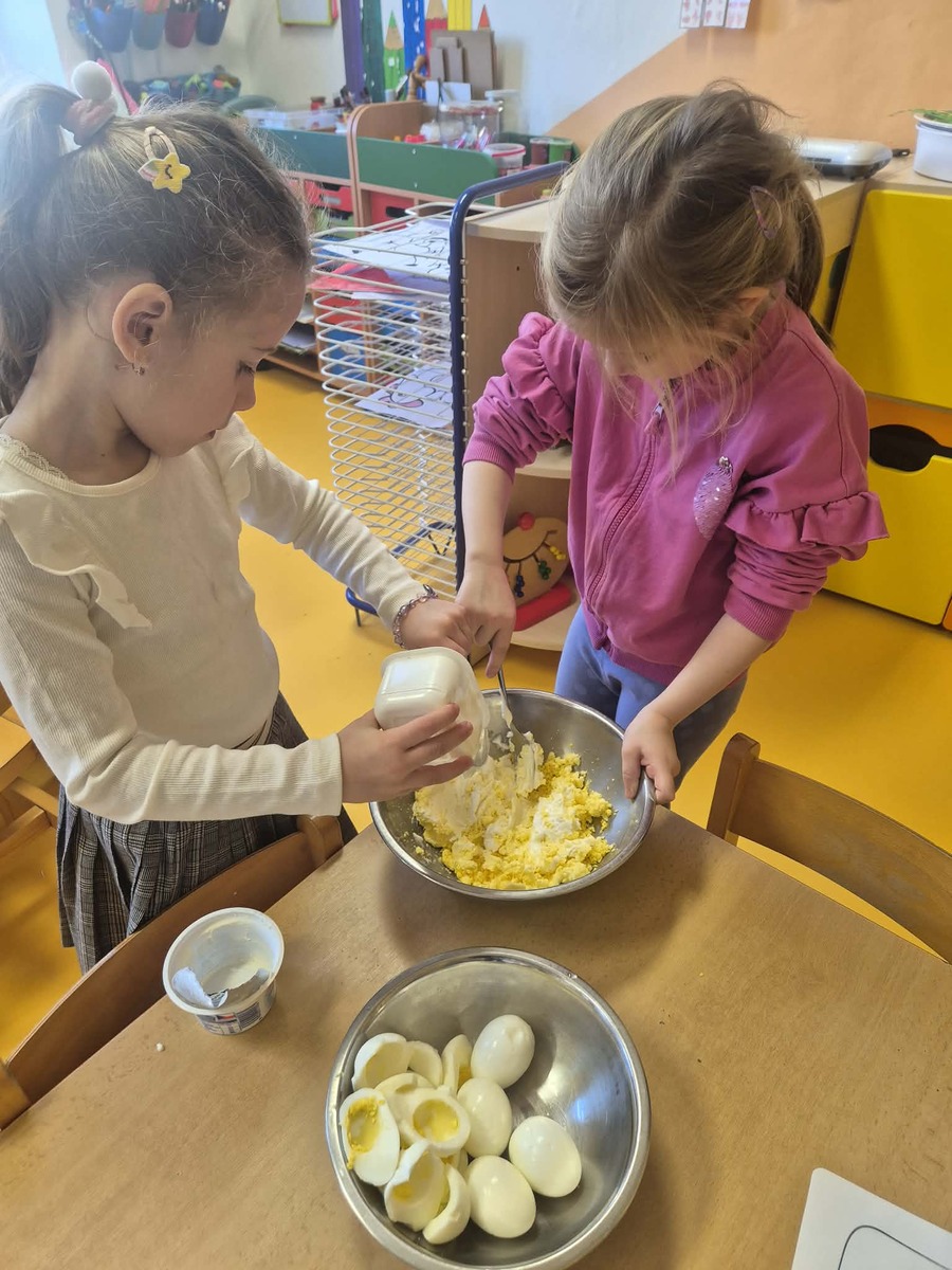 Tomášek P. přinesl domácí vajíčka, a tak děti napadlo, že si připraví vajíčkovou pomazánku. Terezka S. přinesla ostatní přísady a mohlo se začít.