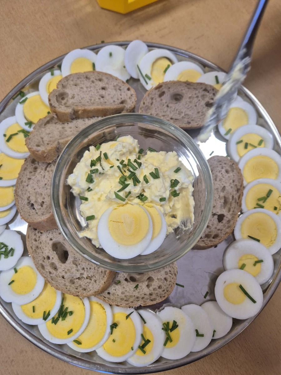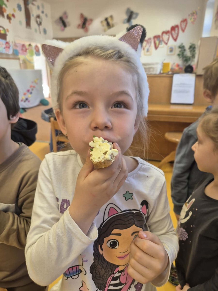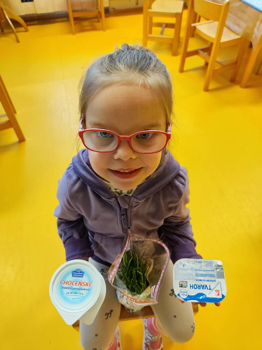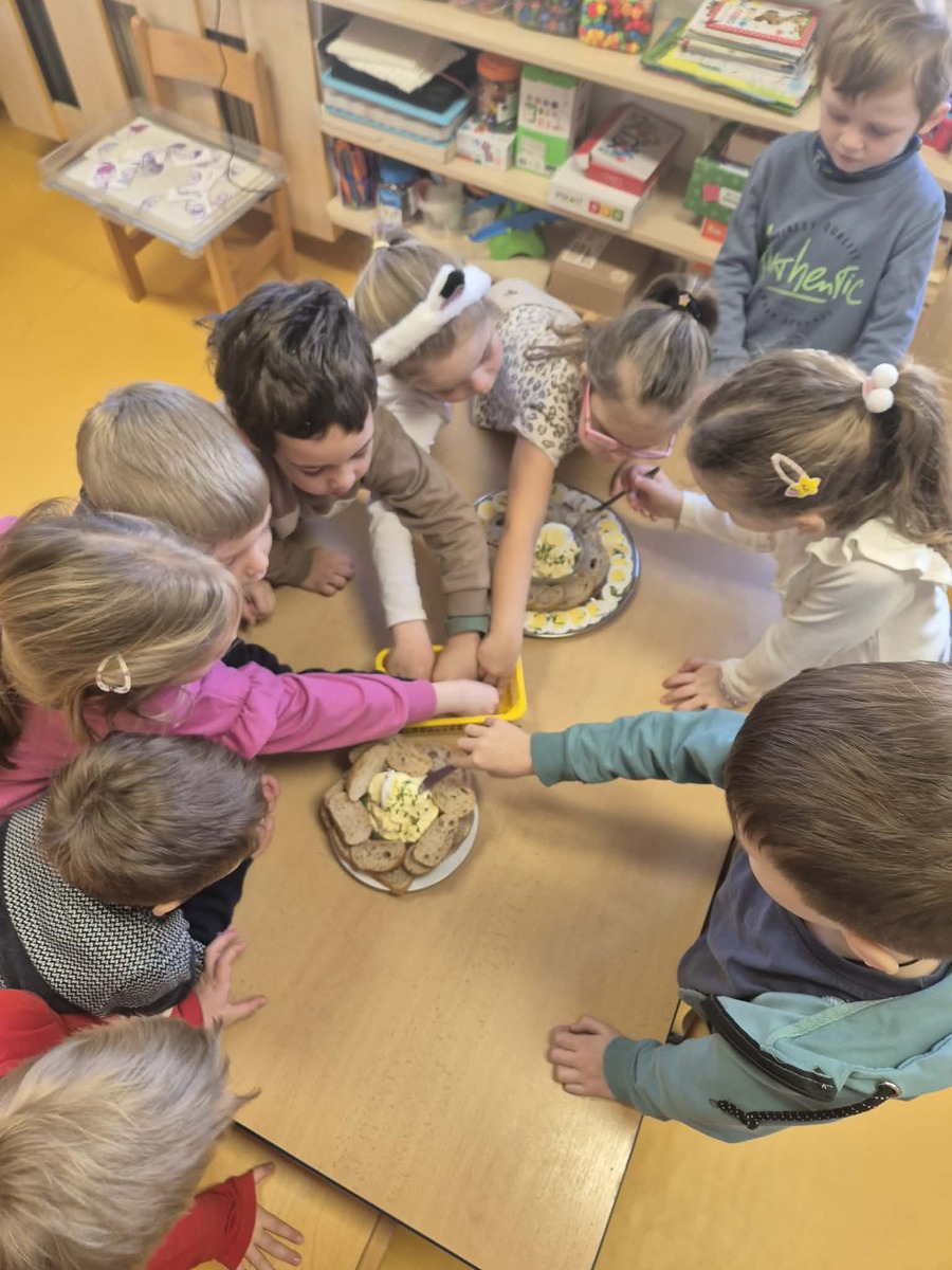 Tomášek P. přinesl domácí vajíčka, a tak děti napadlo, že si připraví vajíčkovou pomazánku. Terezka S. přinesla ostatní přísady a mohlo se začít.