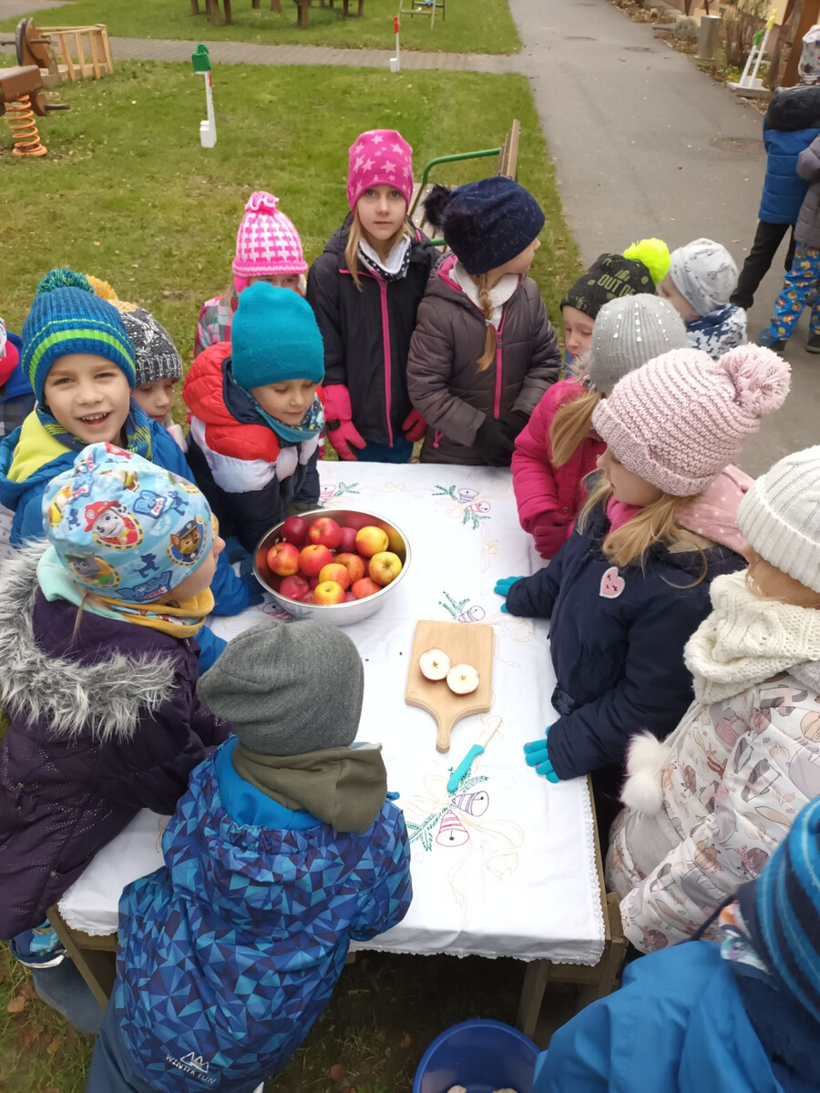 V letošním roce jsme ve spolupráci s dětmi a rodiči uspořádali Vánoční jarmark, na který si děti do stánků připravily mimo jiné i zdravé pokrmy. Rodiče nám obstaraly suroviny a my s dětmi jsme se s radostí pustili do krájení jablíček, které jsme nasušili jako křížaly. Ostatní ovoce, které nám rodiče přinesli, jsme použili na výrobu pečeného čaje. Na jarmark jsme si s dětmi upekli i zdravé cukroví, do pečení se zapojili i rodiče, kteří nám cukroví donesli v den konání jarmarku. Cukroví bylo umístěno v altánku a bylo zde možné pomocí hlasovacích lístků rozhodnout, které chutnalo návštěvníkům nejvíce.