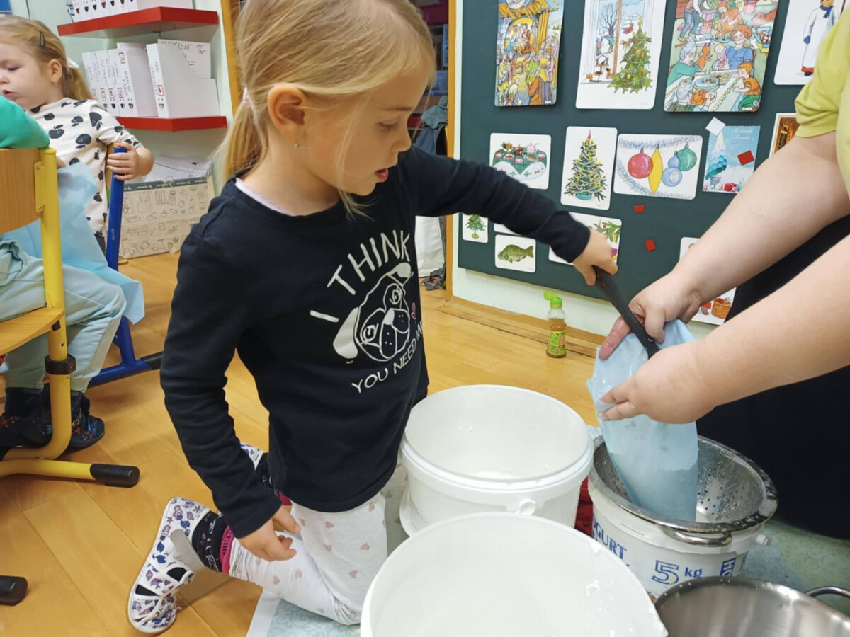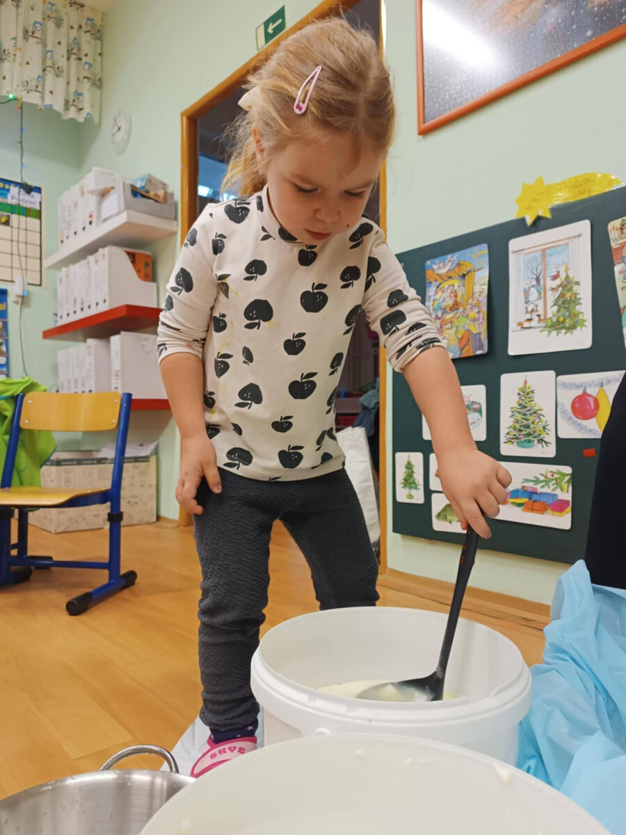 Přípravy na Velikonoční jarmark započaly již v měsíci listopadu. Ve spolupráci s rodiči děti s pedagogy vyráběly mléčné výrobky přímo ve školce. Děti se seznámily s procesem výroby domácího tvarohu a jogurtu.