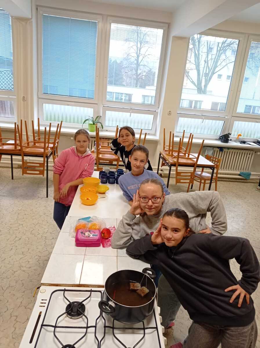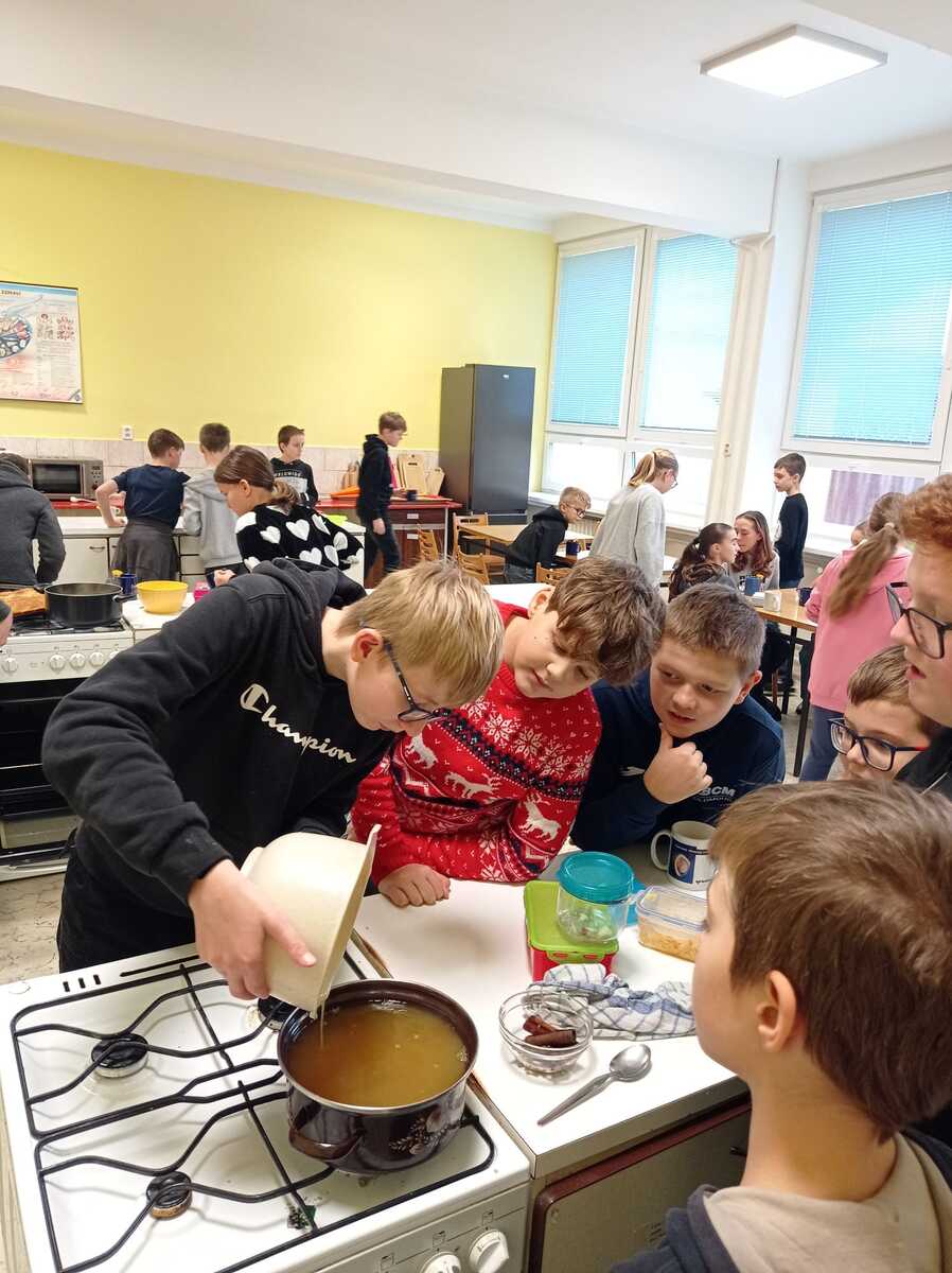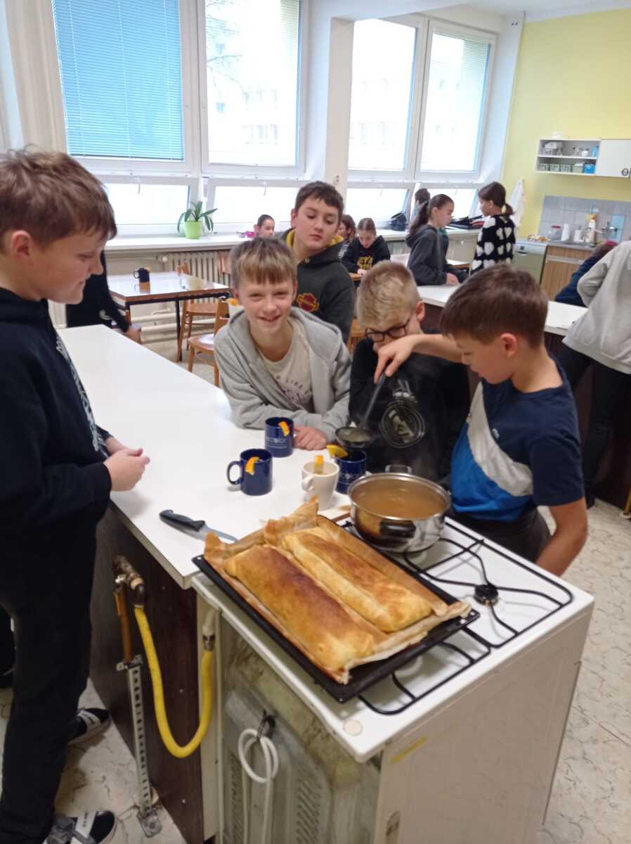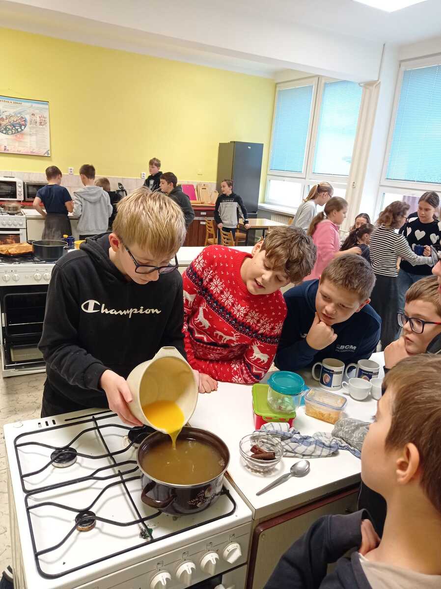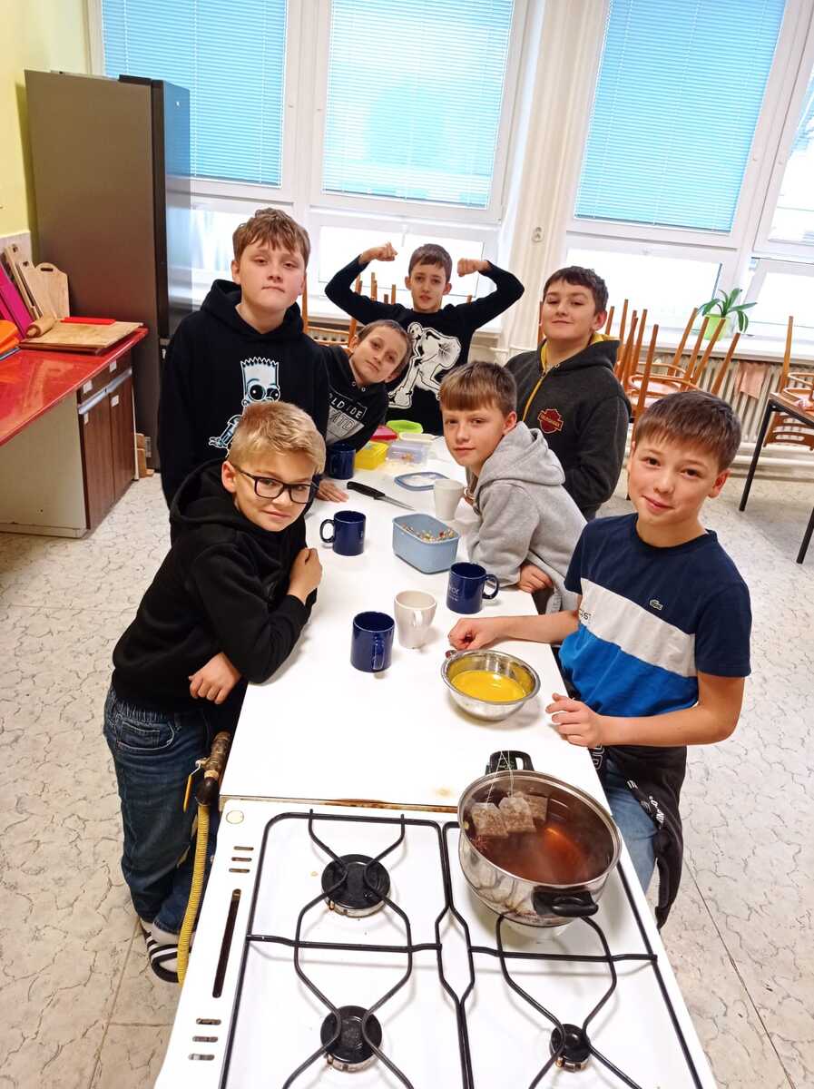 Rádi bychom se s vámi podělili o krásný zážitek z naší školní kuchyňky. Žáci páté třídy si vyzkoušeli, jaké to je stát se na chvíli malými kuchaři, a s velkým nadšením se pustili do vaření.Výsledkem byly nejen chutné pokrmy, ale také spousta úsměvů a dobrá nálada.