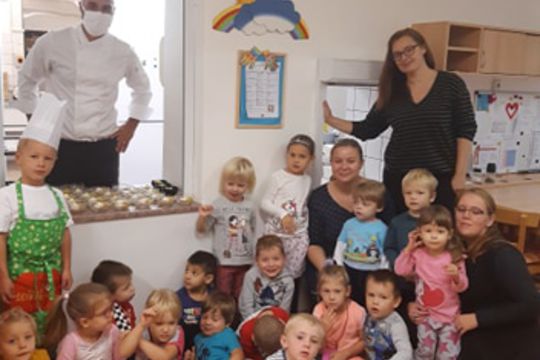 Dnešní krásná kuchařská show s kuchařem Romanem. Jeho syn Ondrášek, který navštěvuje naší školku mu byl perfektním pomocníkem. Děti si pochutnaly na tvarohovém překvapení s ovocem, poslechly si vyprávění o kuchařských soutěžím, viděly medaile i diplomy, prostě si to dopoledne užily. Děkujeme rodinnému týmu za super akci.