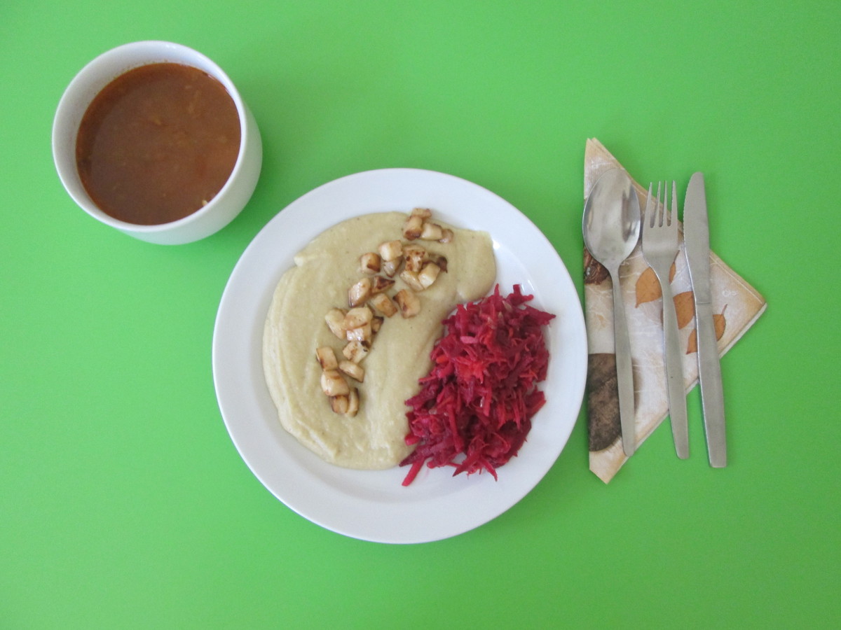 Oběd č. 2 Cizrnová kaše zdobená celerovým špekem, zeleninový salát z červené řepy, mrkve a jablka.