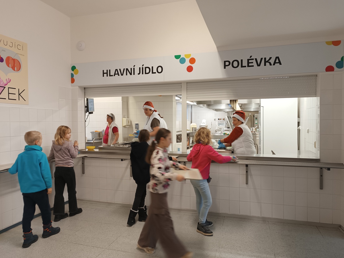 Paní ředitelka a vedení školy dnes obléklo zástěry, chopilo se naběraček a s úsměvem vítalo žáky i zaměstnance přímo u výdeje obědů. Fronty se tak staly místem nečekaných setkání, úsměvů a krátkých rozhovorů, které běžně probíhají spíš na chodbách nebo ve třídách.