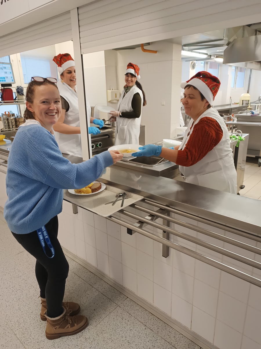 Cílem této netradiční akce nebyla jen zábava, ale také poděkování pracovníkům školní jídelny za jejich každodenní práci. Právě oni se starají o to, aby se k nám každý den dostalo chutné a vyvážené jídlo – často v tempu, které si málokdo dokáže představit. Vedení školy si tak na vlastní kůži vyzkoušelo, že vydávání obědů není jen o nabírání polévky, ale hlavně o sehranosti, rychlosti a dobré náladě.