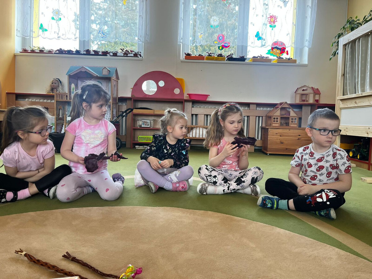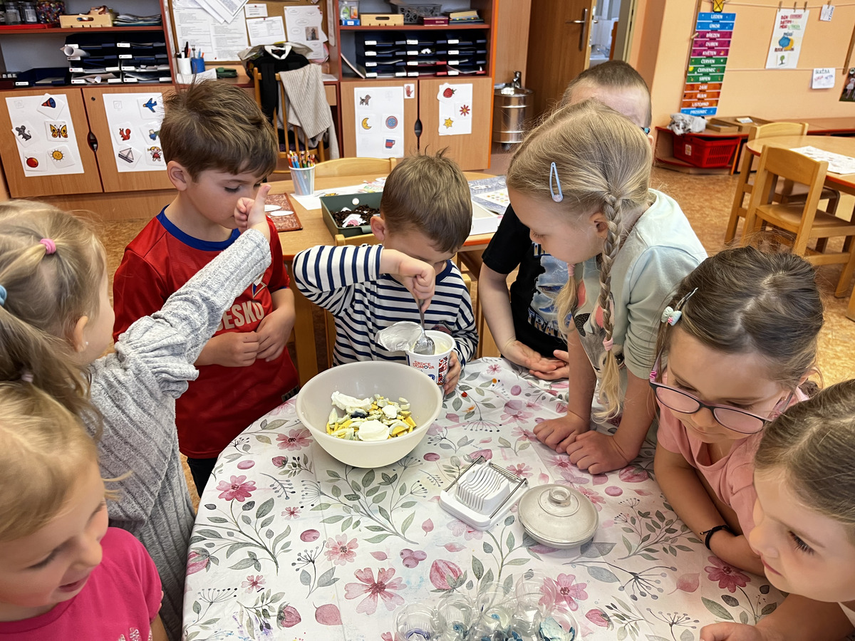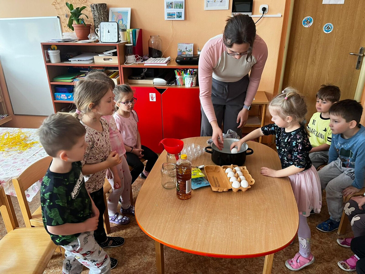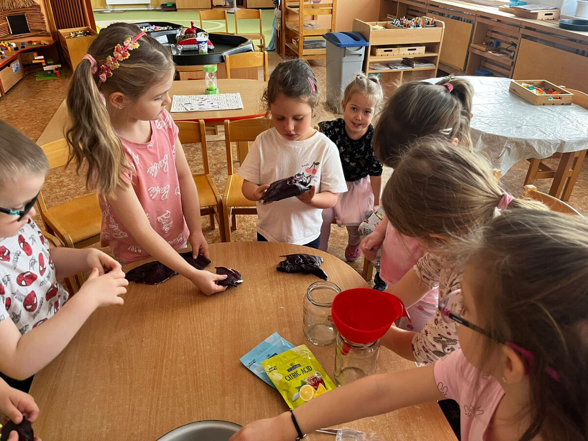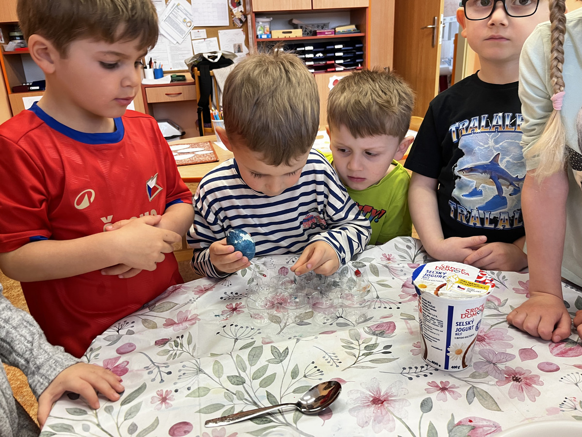Během velikonočního týdne si děti vyzkoušely vajíčka obarvit pomocí červeného zelí a trochu octu. Možností na výslednou barvu bylo mnoho, nikdo však neodhadl, že finální barva vyjde modrá. Z odvaru, který nám při vaření vznikl, si děti udělaly ještě malý pokus. Zkusily do něj přidat kyselinu citronovou a jedlou sodu. Z vytvořených barev si následně namalovaly obrázky, které si odnesly domů. Z uvařených vajec a bílého jogurtu si děti nakonec vytvořily vajíčkovou pomazánku.