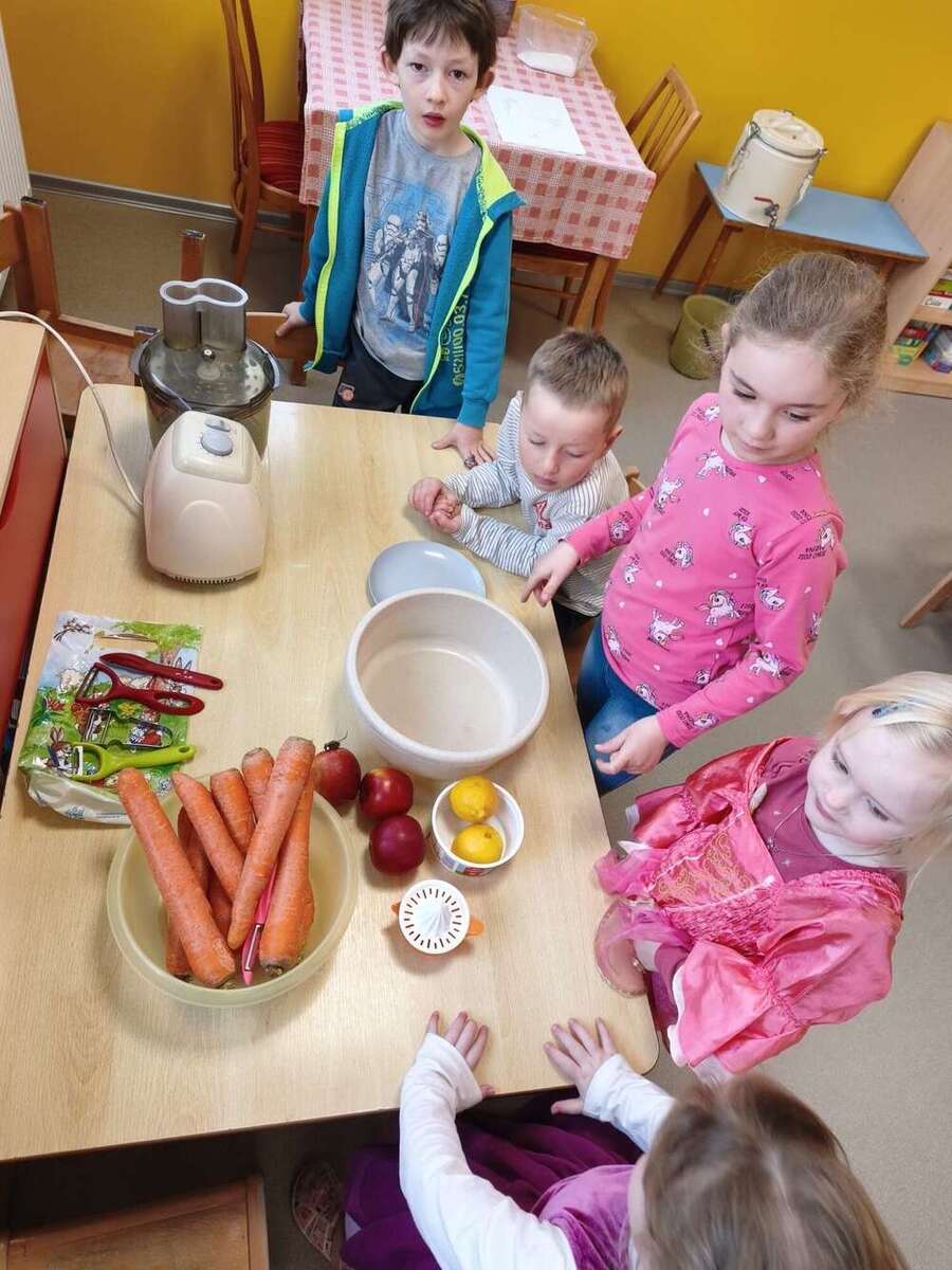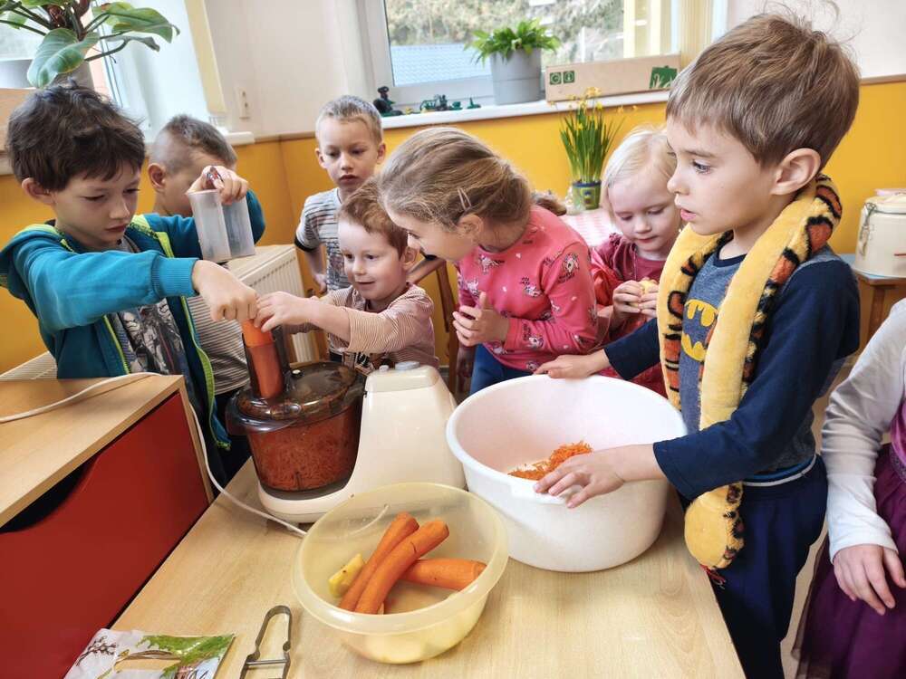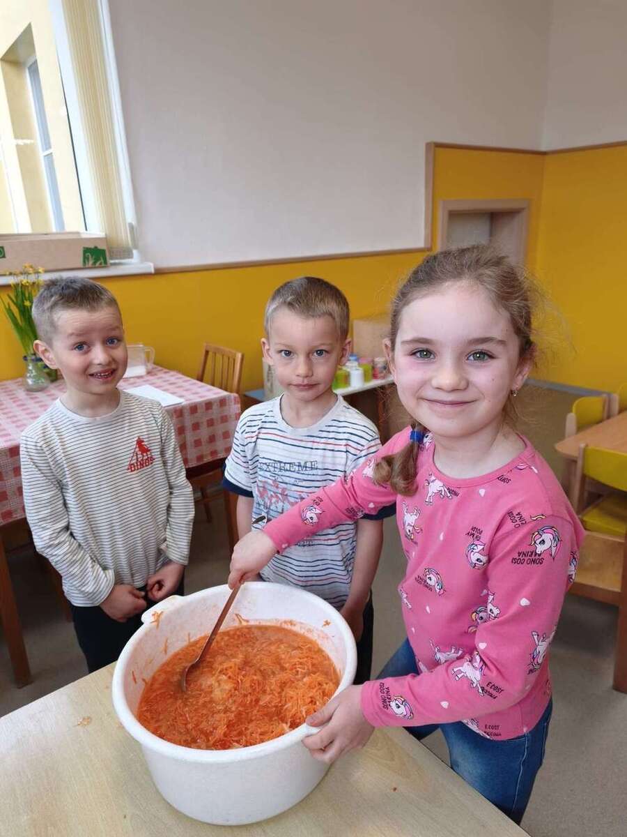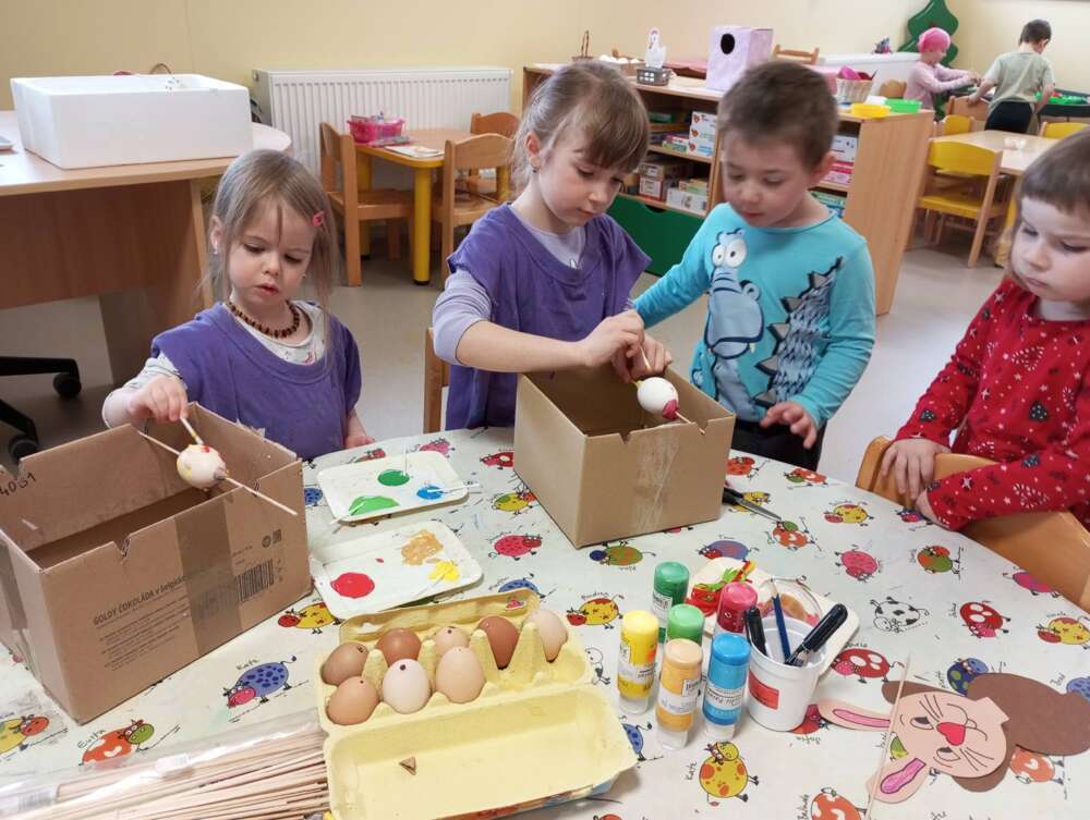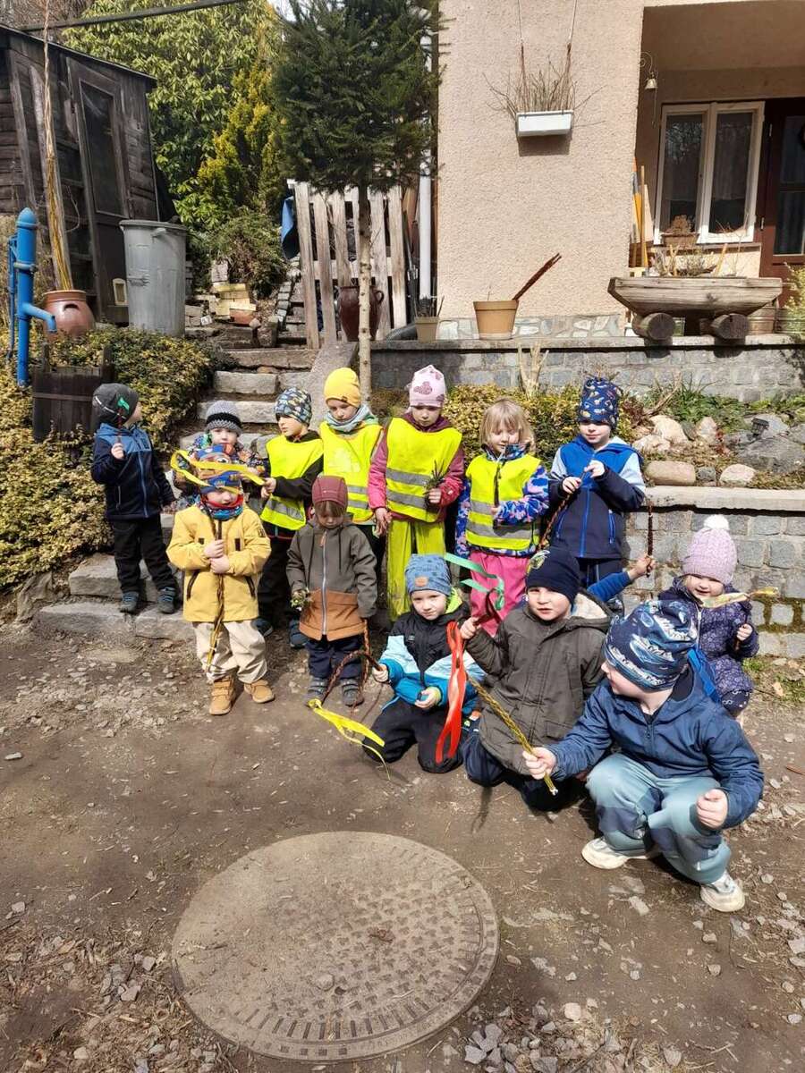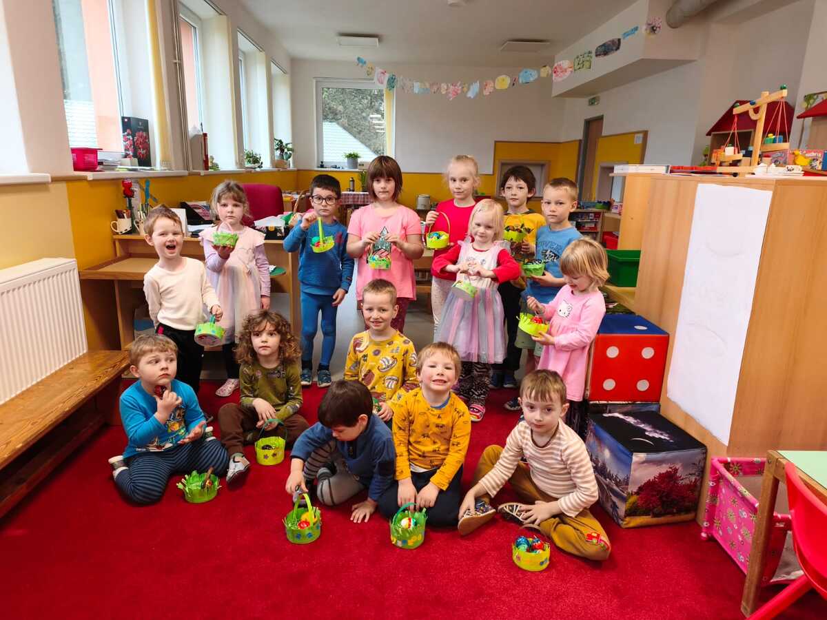 Co jsme dělali před Velikonocemi? Ochutnali jsme tradiční pokrm - pučálku, kterou jsme si sami připravili ze zeleného hrachu a čekali až nám vyklíčí. Paní kuchařka nám ho pak v kuchyni opražila na sladko (s medem) i na slano. Nabídli jsme i rodičům. Třída Žabiček nám zase připravila "zajíčkový" mrkvový salát. Nechybělo malování vajíček, vyrábění papírových košíčků, hnízdeček z březového proutí, pečení jidášů s překvapením. Velké překvapení čekalo na děti u jedné hodné paní, která všem dětem napletla pomlázky různých tvarů i barev. Moc děkujeme a přejeme veselé Velikonoce plné tradičních zvyků.