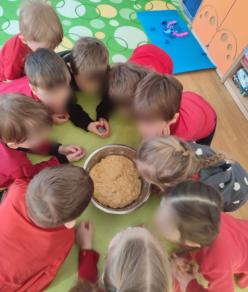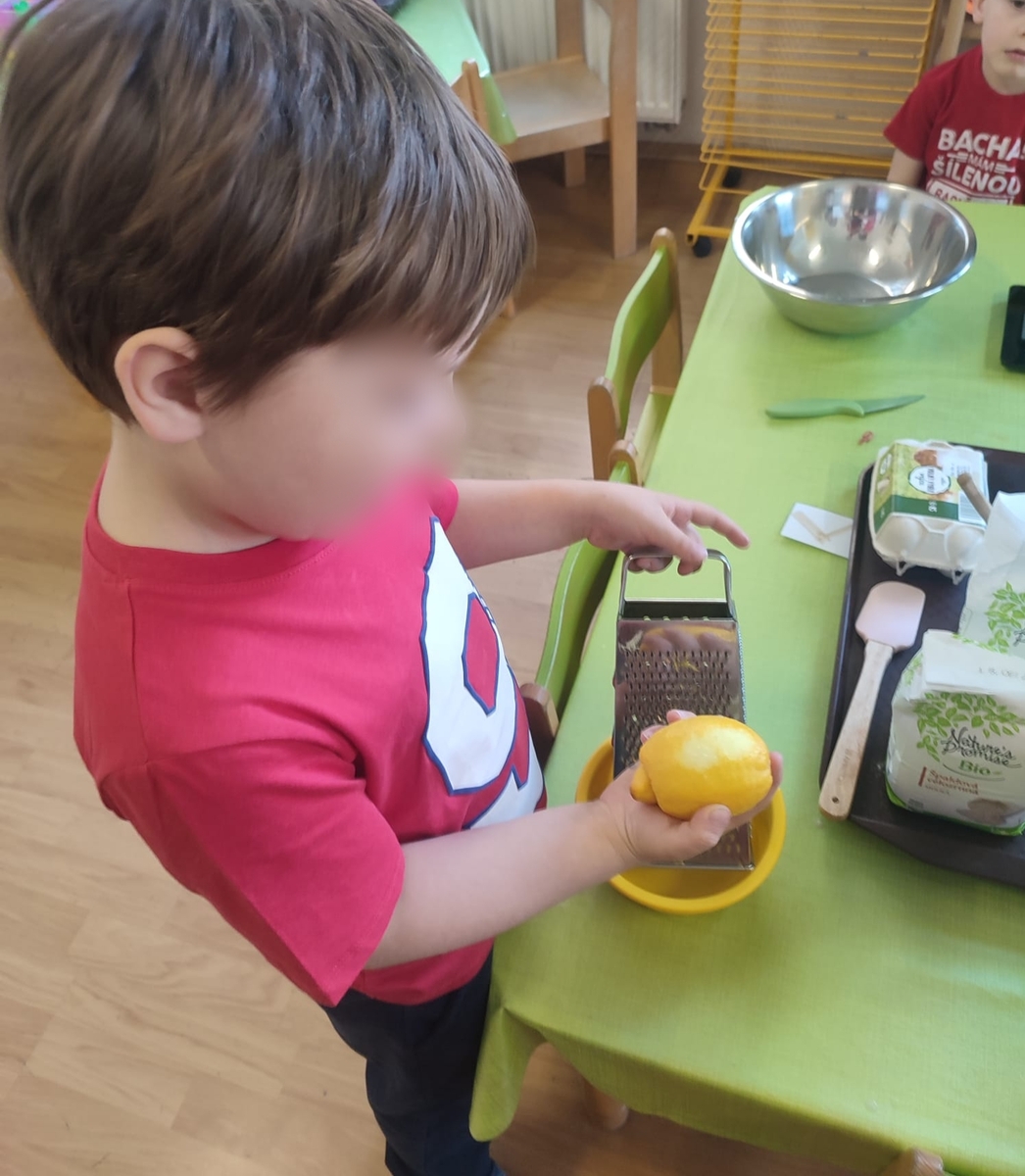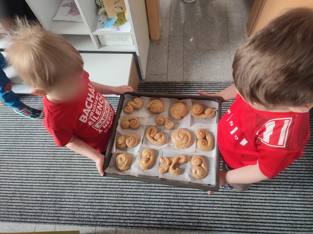 Ve třídě Zajíčků jsme se před Velikonocemi seznamovali se zvyky a tradicemi, navštívili jsme velikonoční trhy, vyráběli různé dekorace a užívali si barevný týden. V minulosti lidé pekli na Škaredou středu jidáše, aby si připomněli Ježíšova zrádce. I my jsme se tohoto tématu dotkli a během naší "červené" středy jsme zadělali těsto na toto velikonoční pečivo. Podle receptu jsme zadělali z mléka, trošku cukru, mouky a droždí kvásek, smíchali špaldovou mouku, třtinový cukr, žloutky, sůl, rozpuštěné máslo a přidali jsme nastrouhanou kůru z bio citrónu. S napětím jsme čekali, jestli nám těsto vykyne - a povedlo se! Po svačině jsme se dali do šoulání těsta, každý si z kousku vyválel dlouhého hada a zamotal do šneka či jiného tvaru. Před pečením jsme své jidáše potřeli vajíčkem a po upečení ještě rozpuštěným máslem s medem. Aby zajistily dobré zdraví, jedly je lidé na Zelený čtvrtek před východem slunce, ale my jsme to tak dlouho nevydrželi, protože krásně vypadaly a ještě víc voněly.