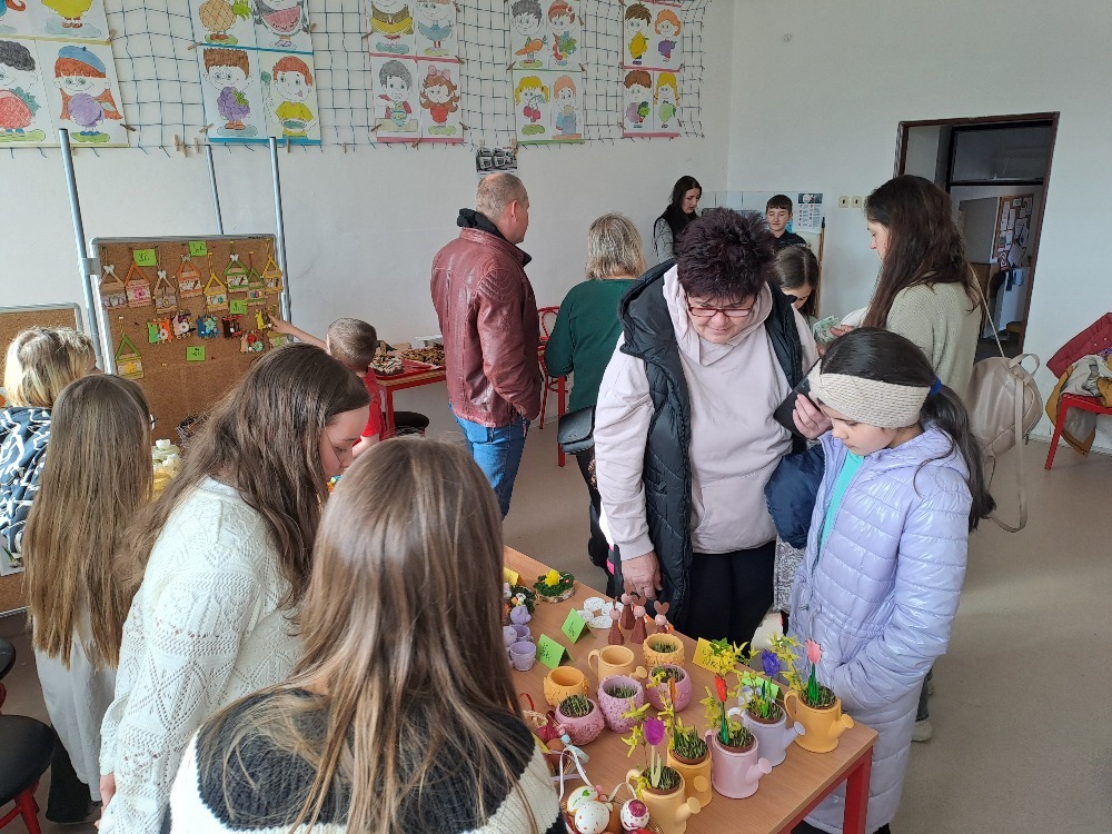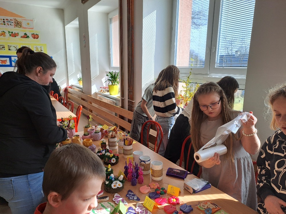 Součástí odpoledne byl také velikonoční jarmark, kde děti nabízely své vlastnoručně vyrobené výrobky. Návštěvníci si mohli zakoupit různé dekorace, přáníčka nebo drobné dárky a podpořit tak kreativní práci žáků.