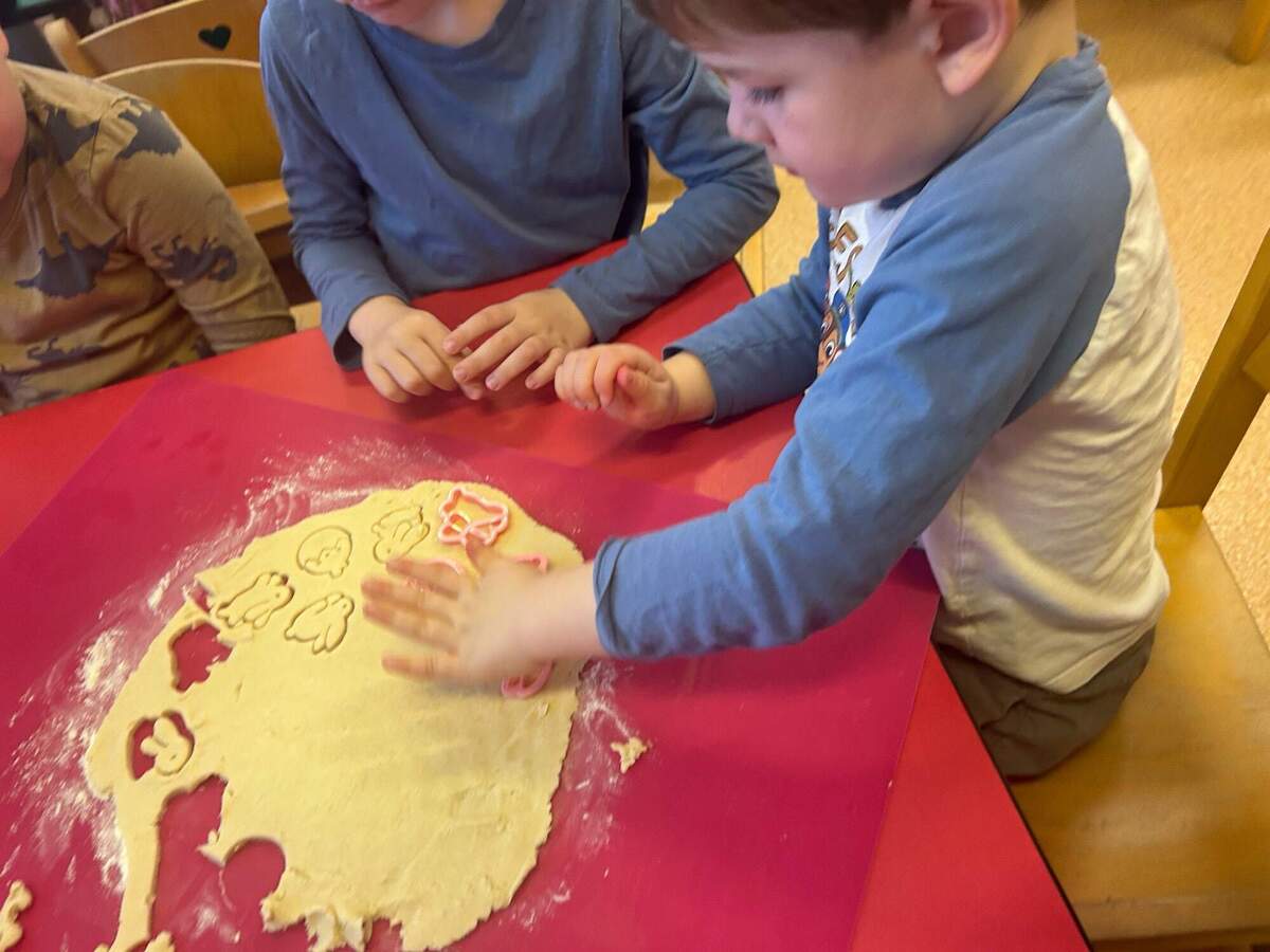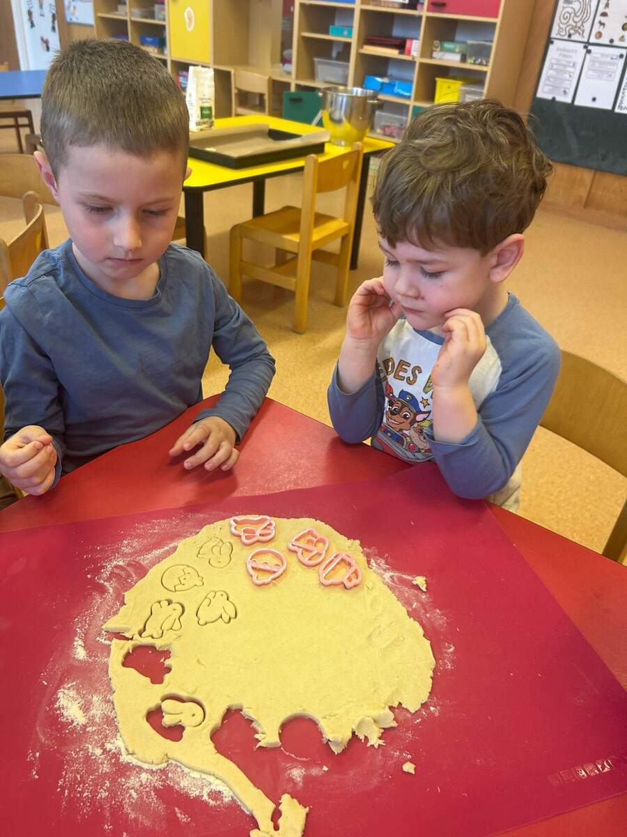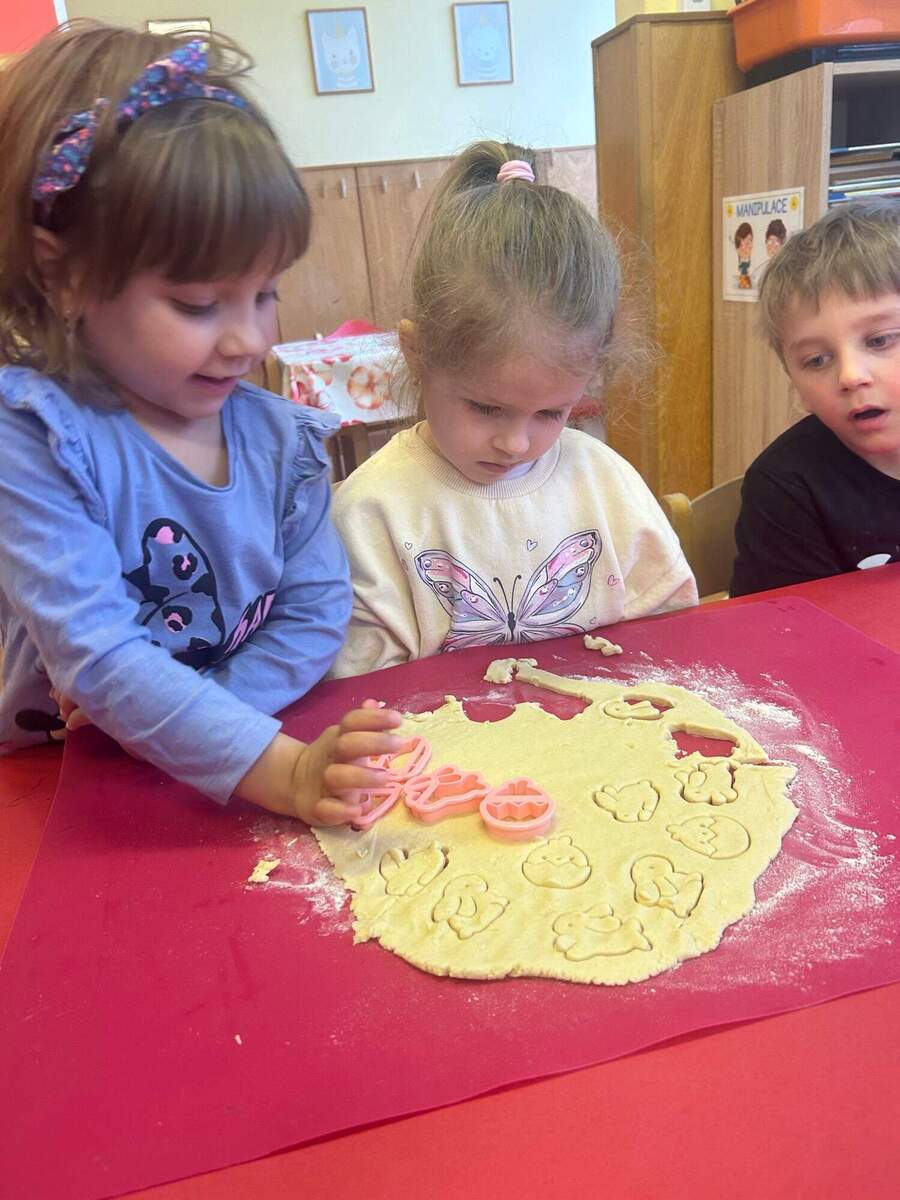 Na Velikonoce jsme se pustili do pečení velikonočních sušenek. Děti si nejprve připravily všechny suroviny, které dle instrukcí a s pomocí paní učitelek společně promíchaly a vytvořily těsto. To pak vyválely a pomocí formiček vykrajovaly různé velikonoční a jarní tvary. Sušenky jsme vyskládali na plech a předali paní kuchařkám, které je upekly dozlatova. Nakonec děti sušenky s radostí ochutnávaly. Naše velikonoční sušenky se opravdu povedly a byla to veliká dobrota!