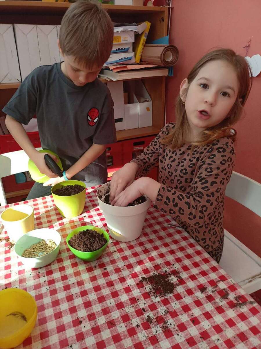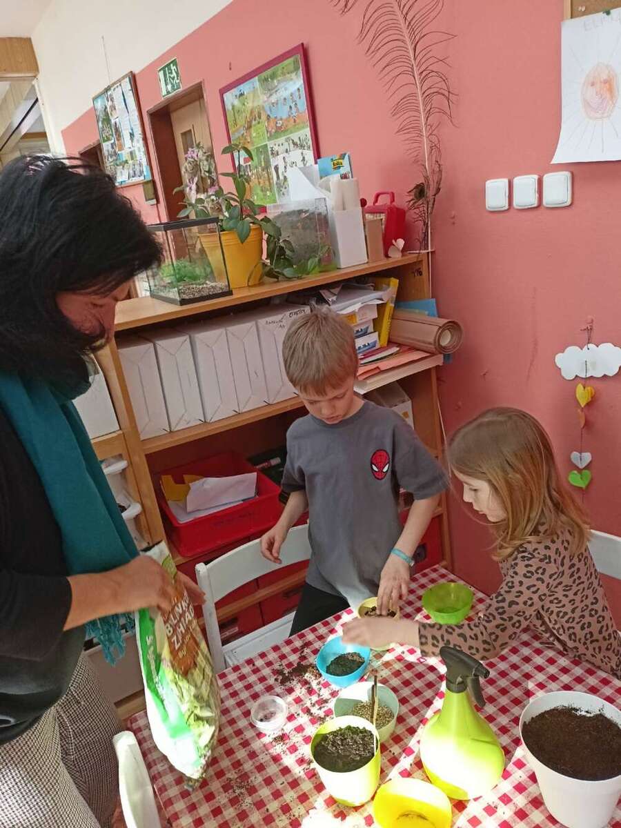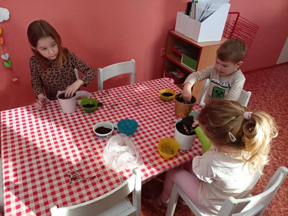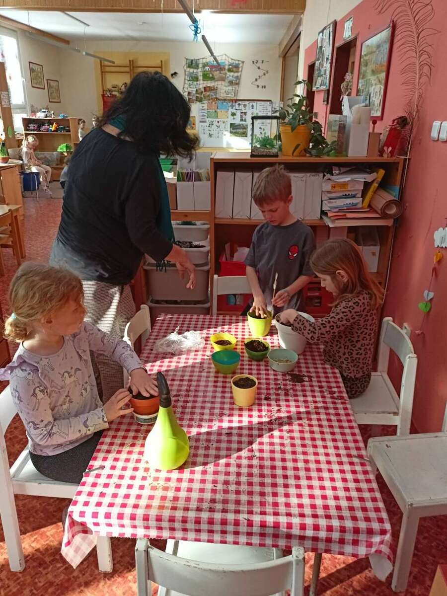 Dnes si děti udělaly přípravu na Velikonoce - osení do květináčků, pokropit vodou, aby jim vše stihlo včas vyrůst. Už teď děti přemýšlí, jak květináčky nazdobí.