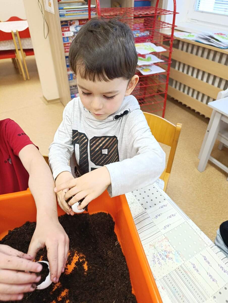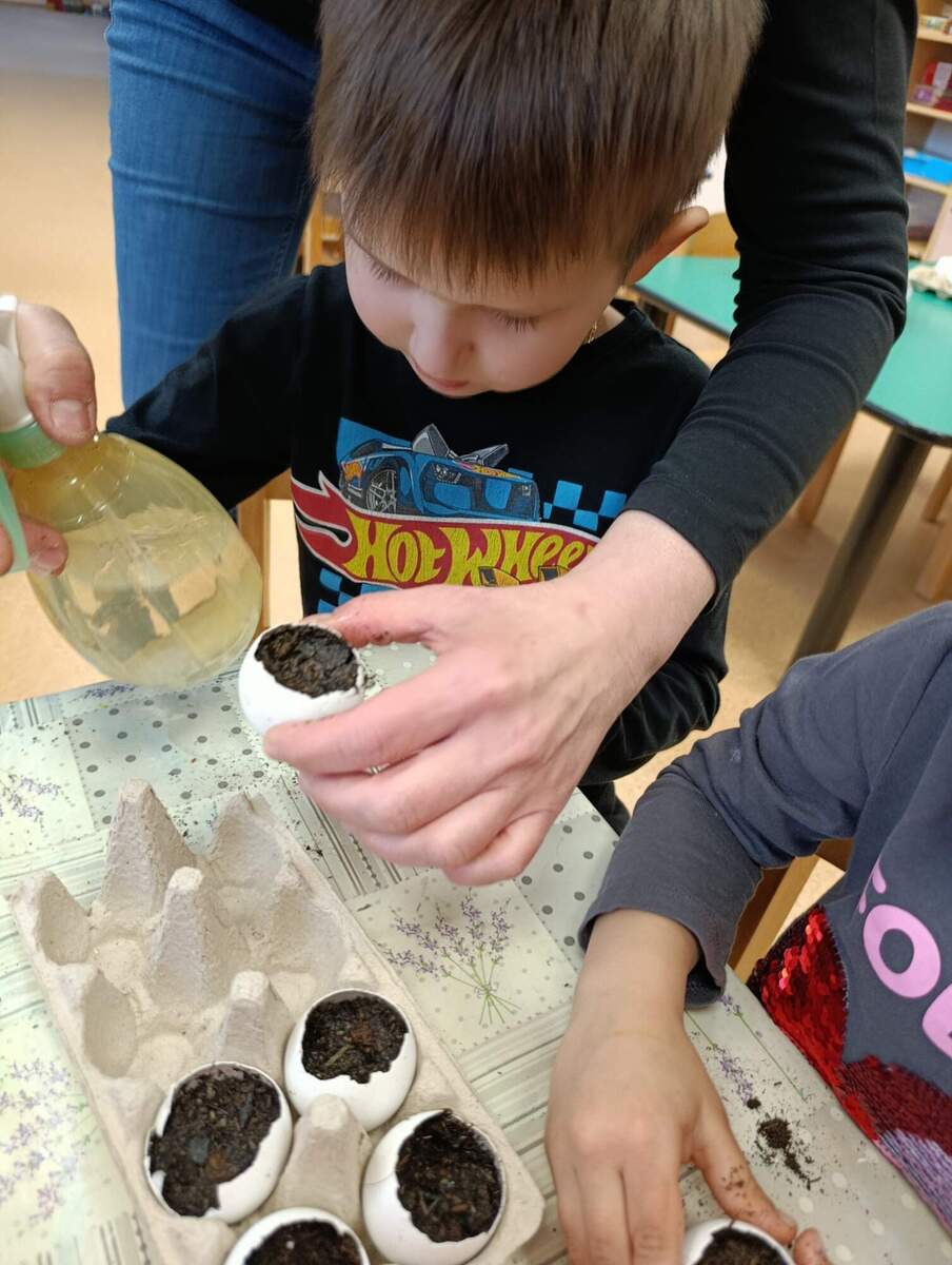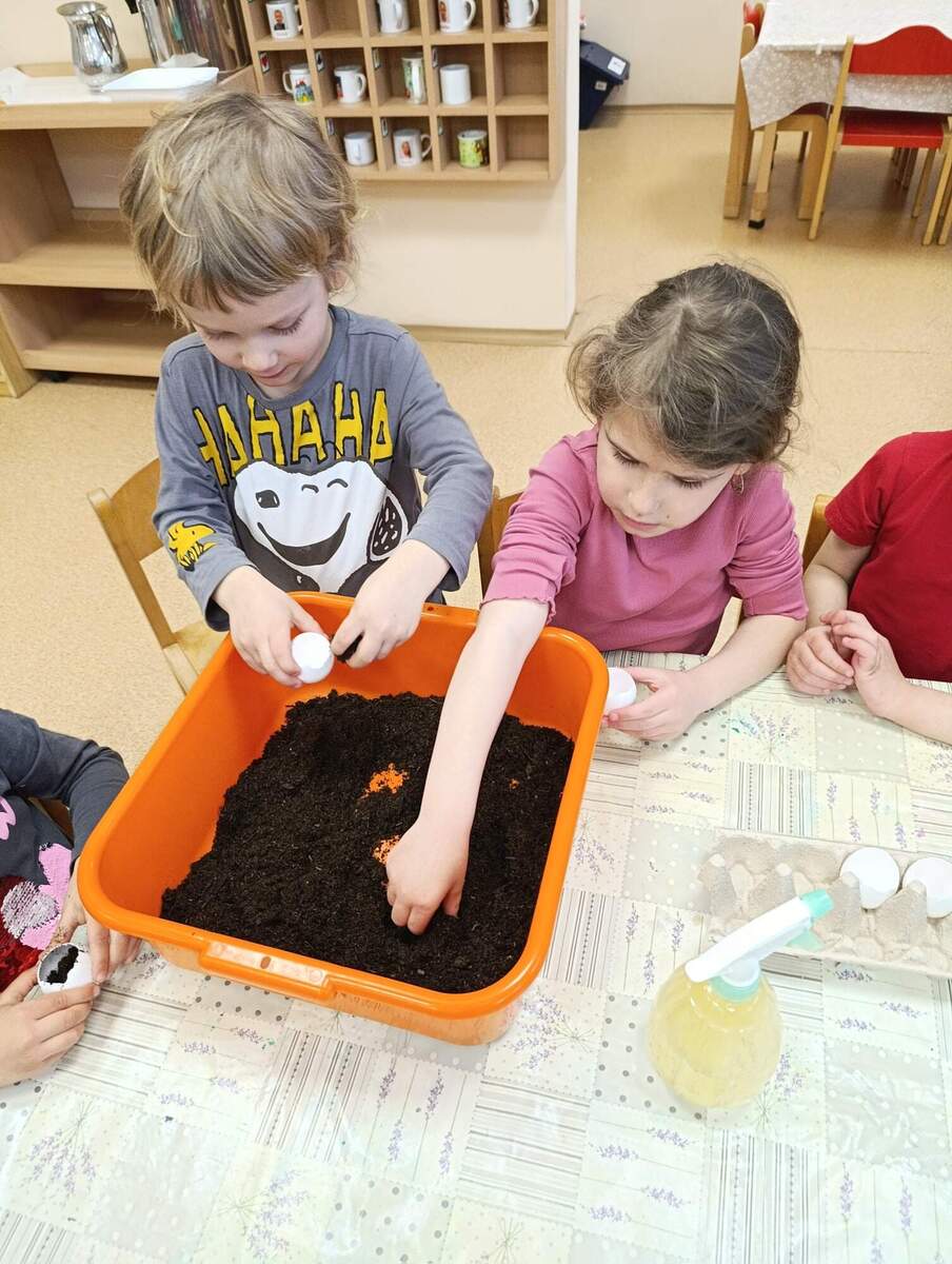 Před Velikonocemi si děti vyzkoušely sázení řeřichy. Rodiče nám přinesli vyfouknuté skořápky od vajíček, do kterých si děti nasypaly hlínu a zasadily semínka. Společně jsme pak pozorovali, jak řeřicha postupně roste, a děti měly velkou radost z prvních zelených lístků. Nakonec si svou vypěstovanou řeřichu odnesly domů.