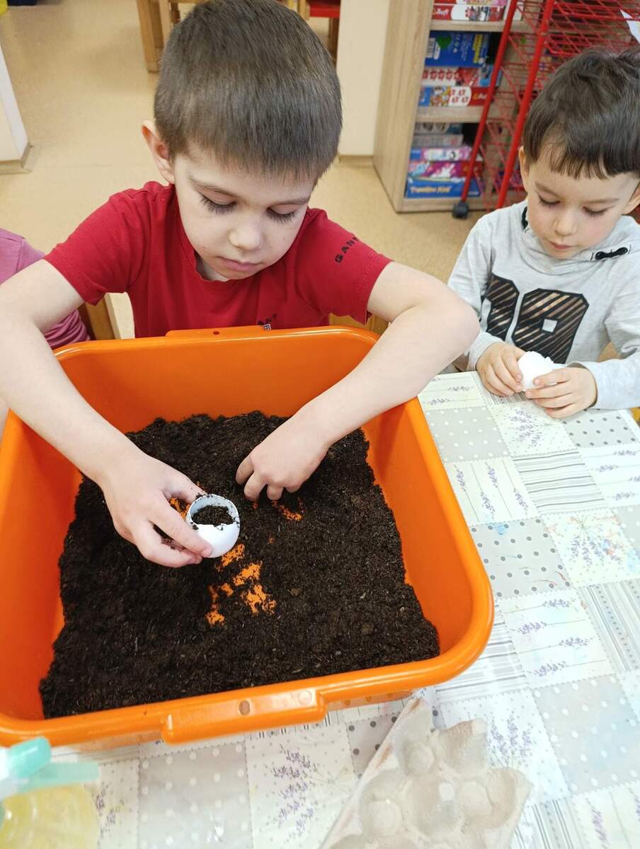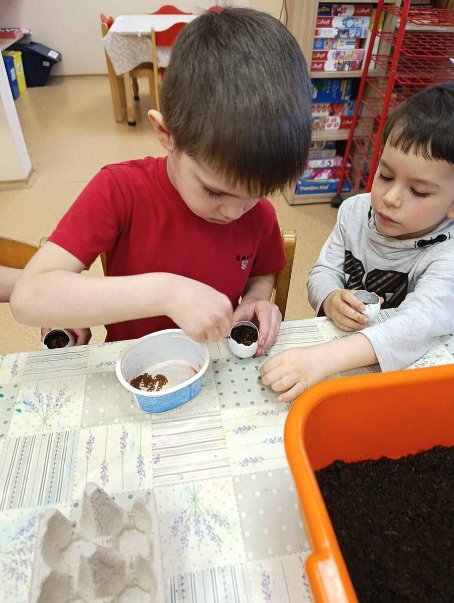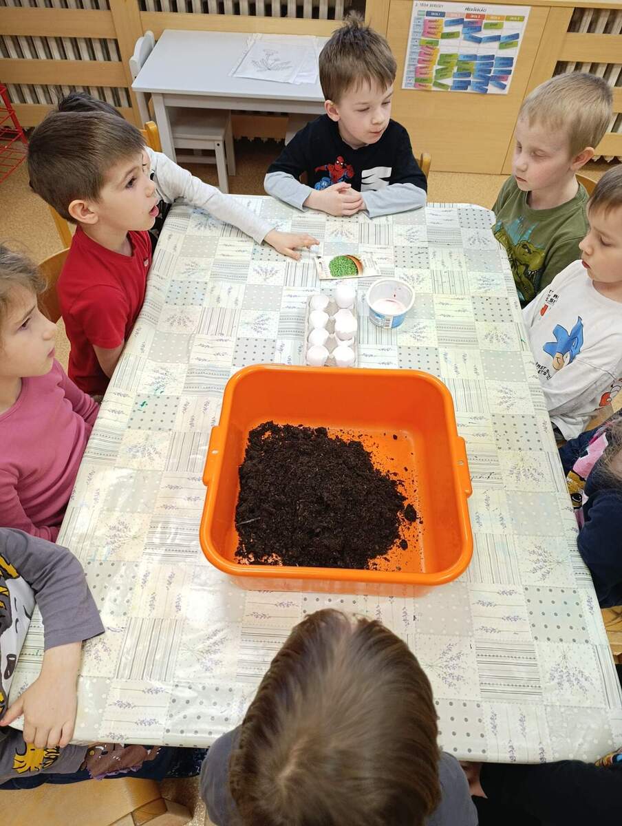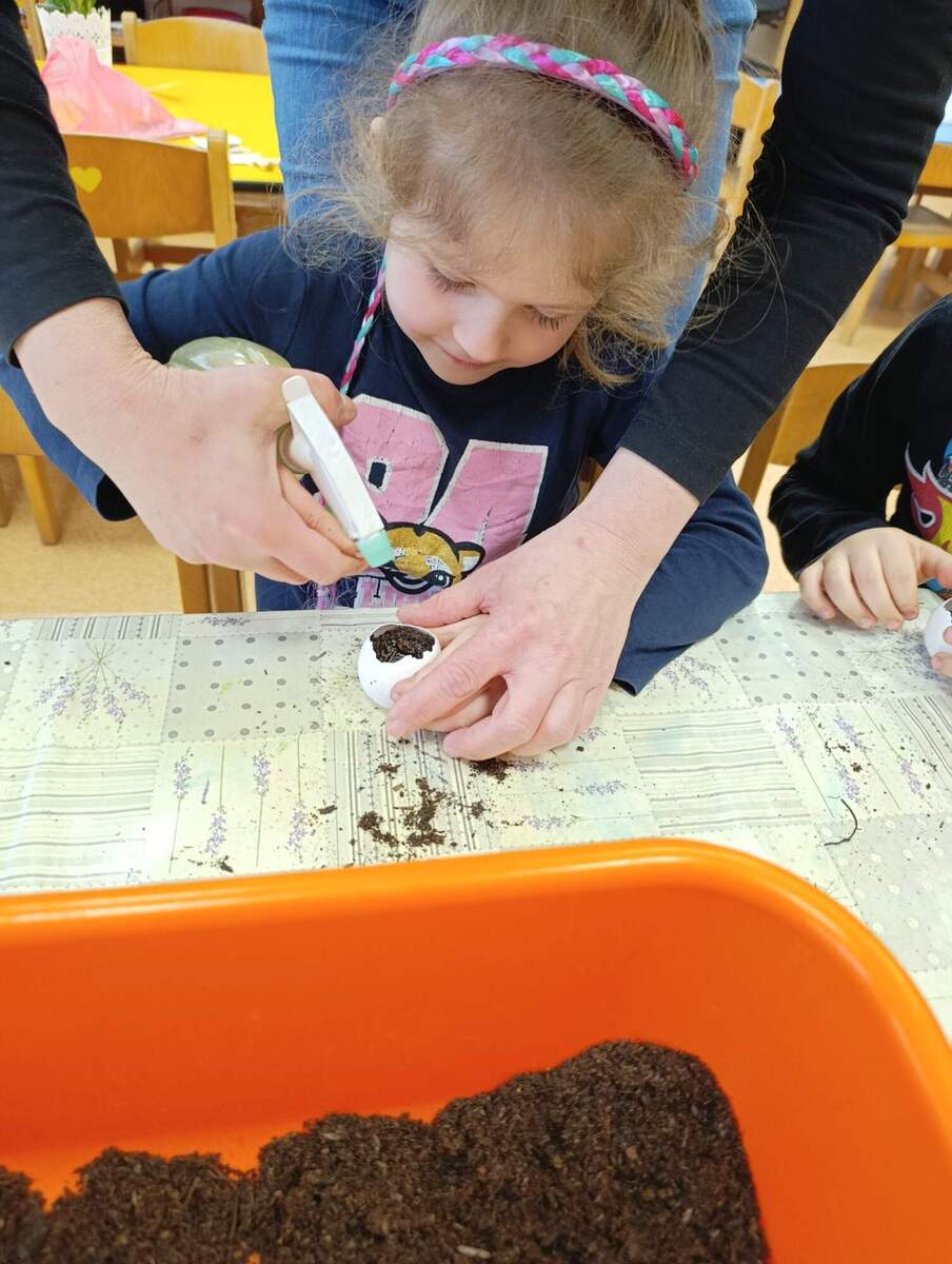 Před Velikonocemi si děti vyzkoušely sázení řeřichy. Rodiče nám přinesli vyfouknuté skořápky od vajíček, do kterých si děti nasypaly hlínu a zasadily semínka. Společně jsme pak pozorovali, jak řeřicha postupně roste, a děti měly velkou radost z prvních zelených lístků. Nakonec si svou vypěstovanou řeřichu odnesly domů.