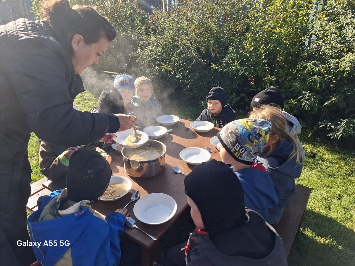 Děti se aktivně podílely na hledání surovin a společně jsme vařili bramboračku. Celý proces byl velmi zábavný a děti si pak polévku vychutnaly na školní zahradě.