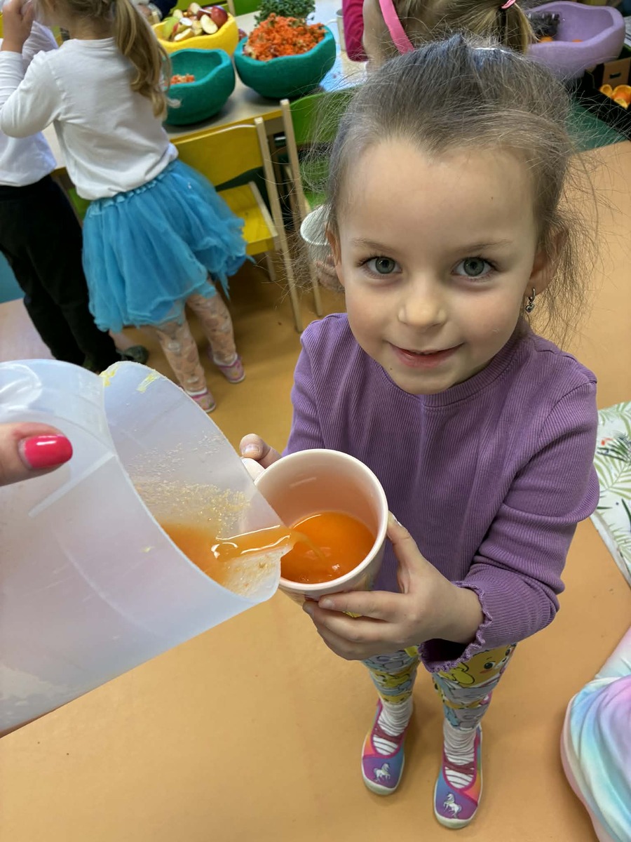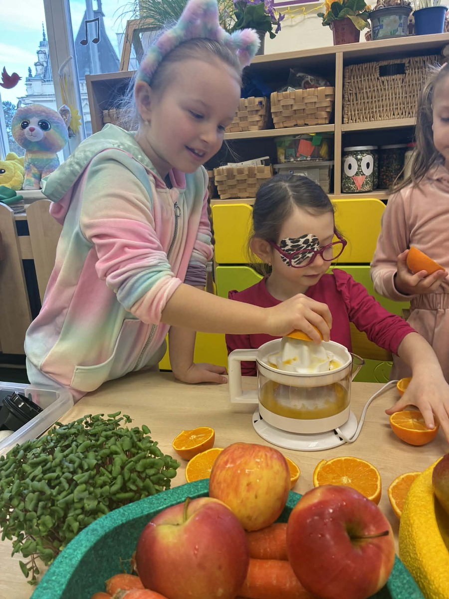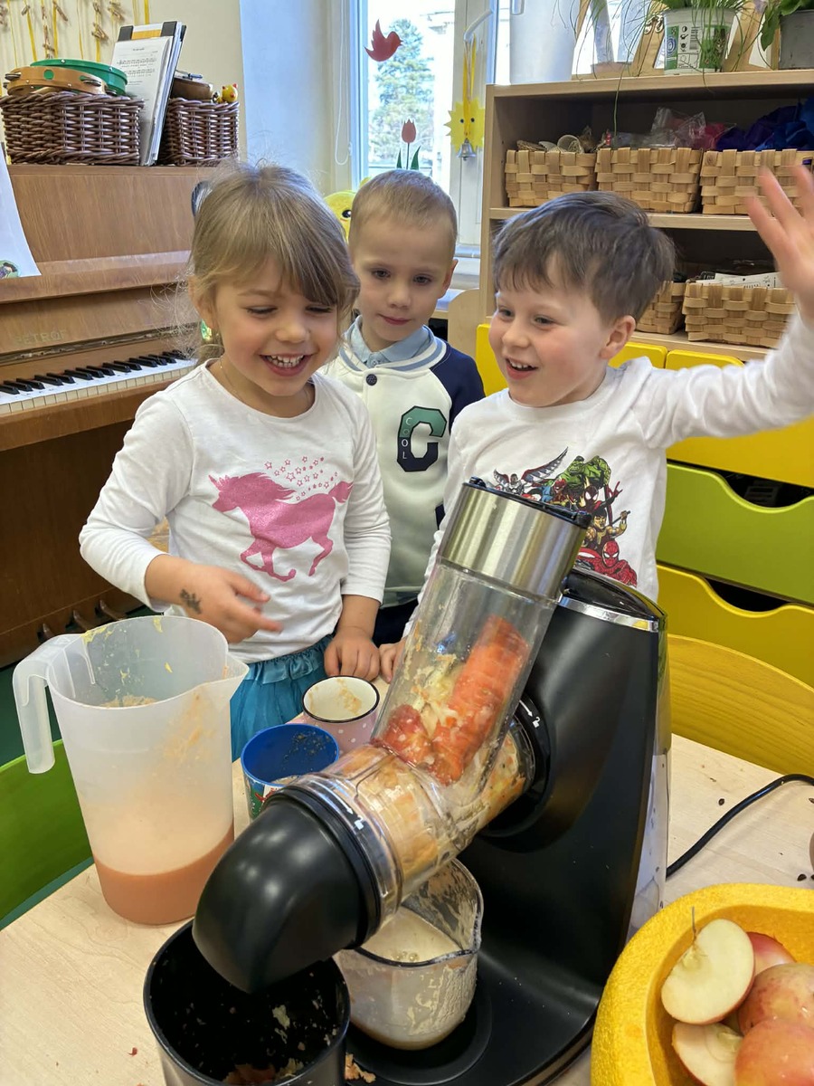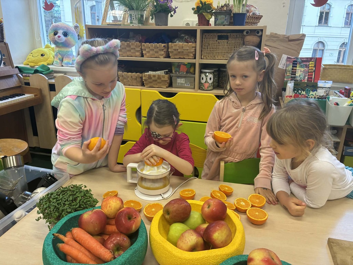 Díky ovoci od rodičů jsme s dětmi zažili malé „vitamínové experimentování“. K dispozici jsme měli jablka, pomeranče a mrkev, a děti měly velkou chuť si samy vyzkoušet odšťavňování. Využili jsme ruční odšťavňovač na citrusy i klasický odšťavňovač. Děti zkoušely různé kombinace, objevovaly nové chutě a s radostí ochutnávaly výsledky své práce. Přirozenou cestou si tak doplnily spoustu vitamínů.